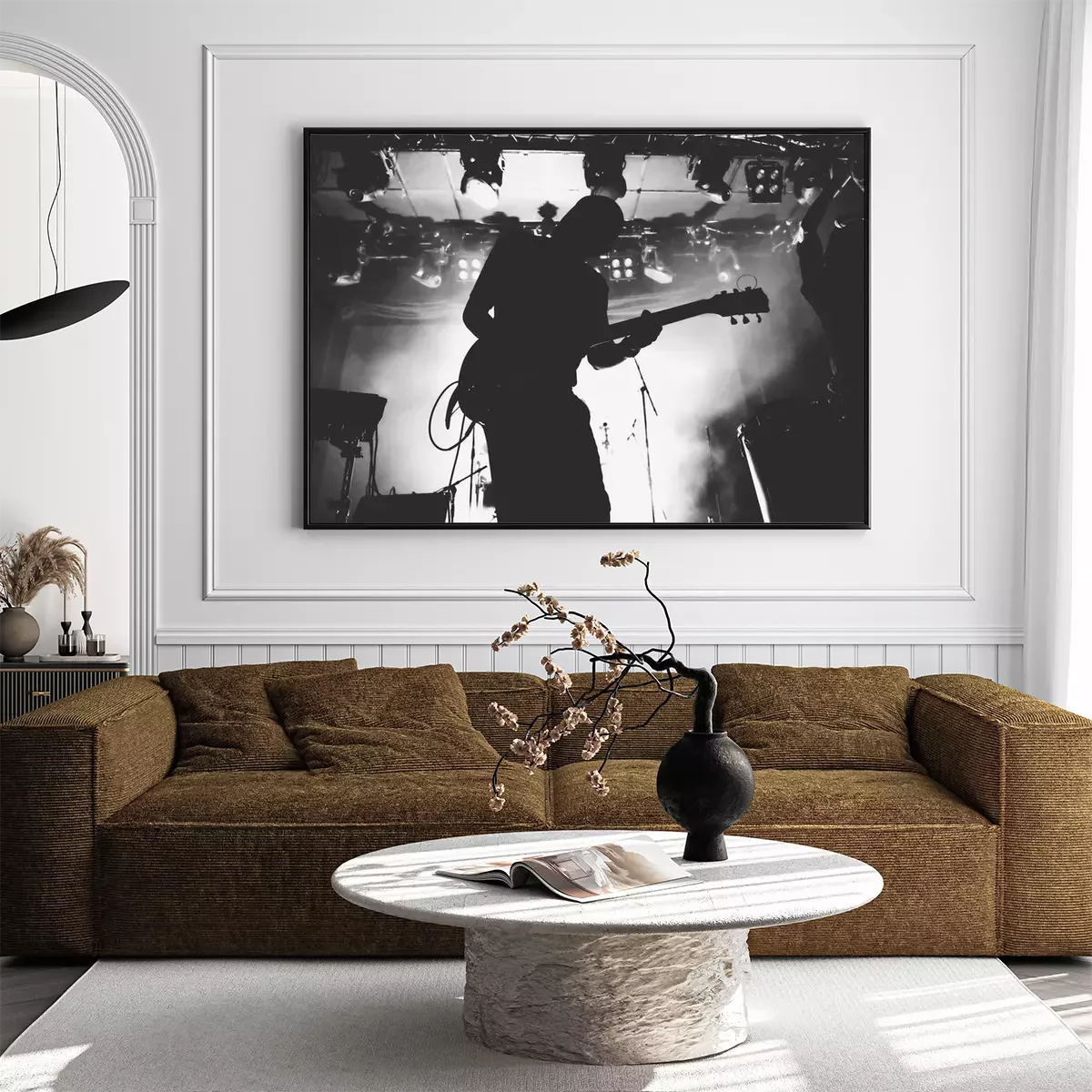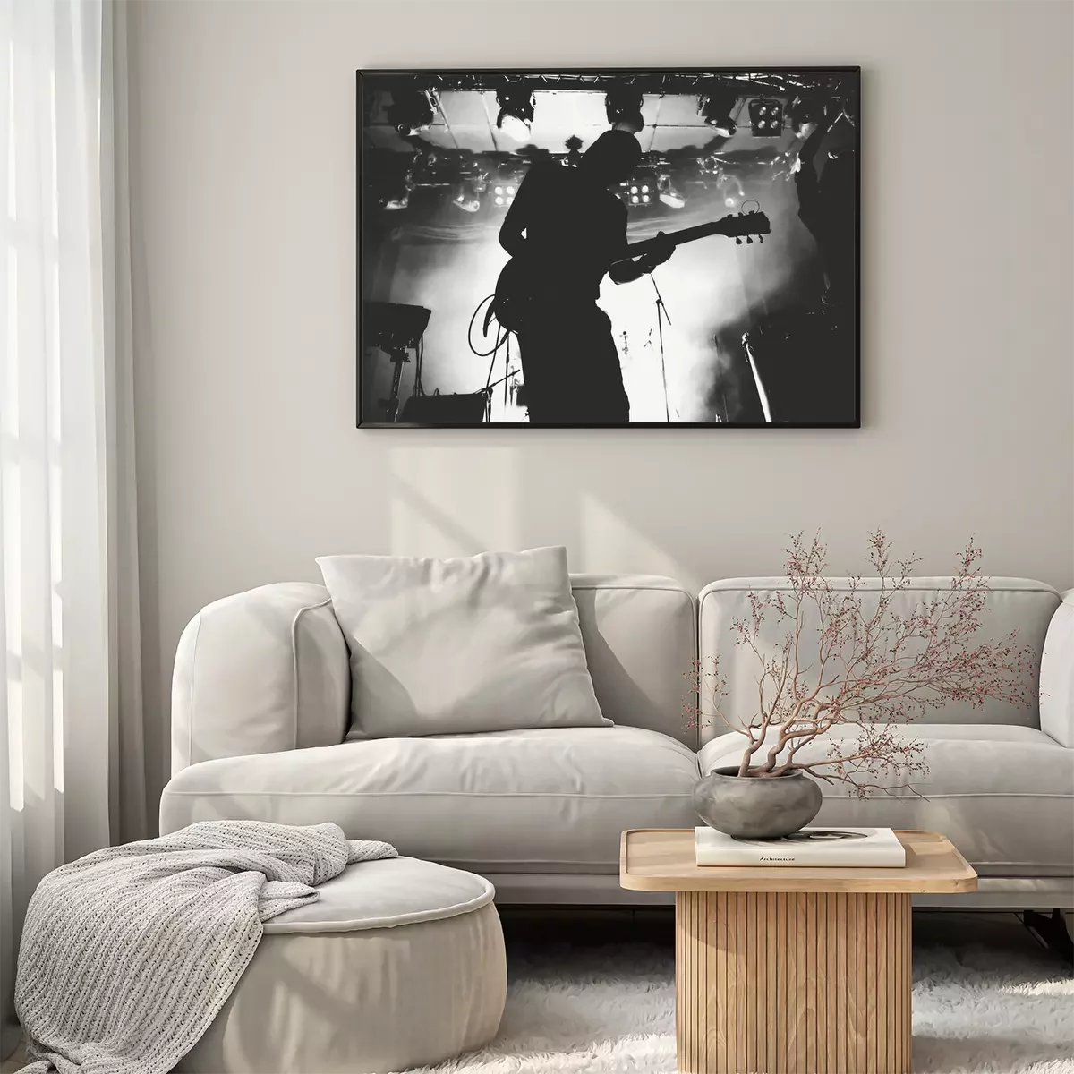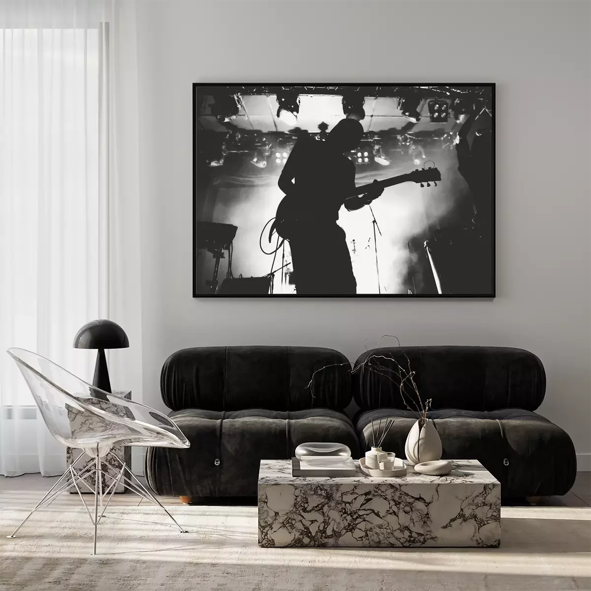 Poster : Silhouette de guitariste sur une scène dans une scène brillante s'allume. Noir et blanc