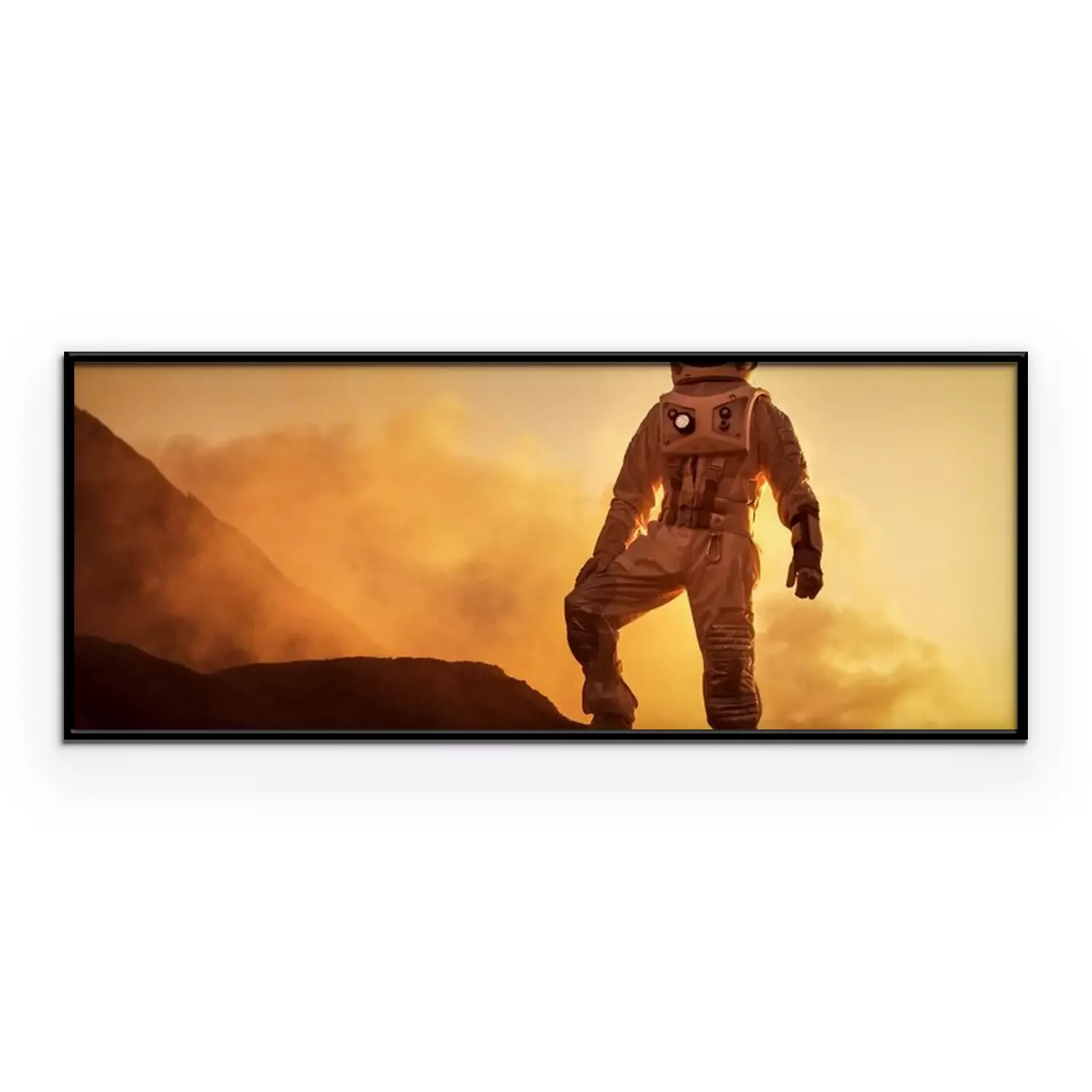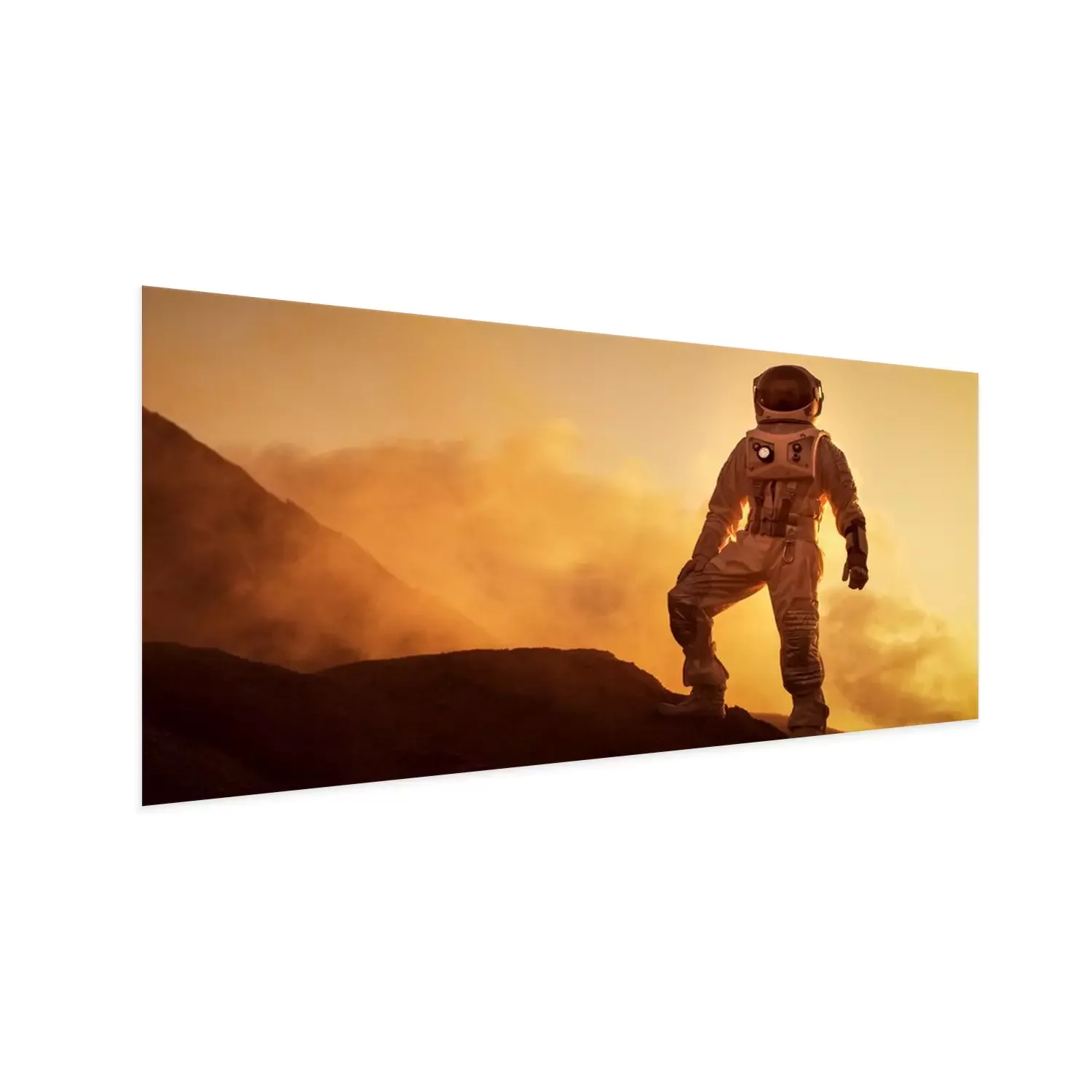 Poster : Silhouette de l'astronaute debout sur la montagne rocheuse de la planète rouge extraterrestre / Mars. Première mission habitée sur Mars. Exploration spatiale, colonisation.