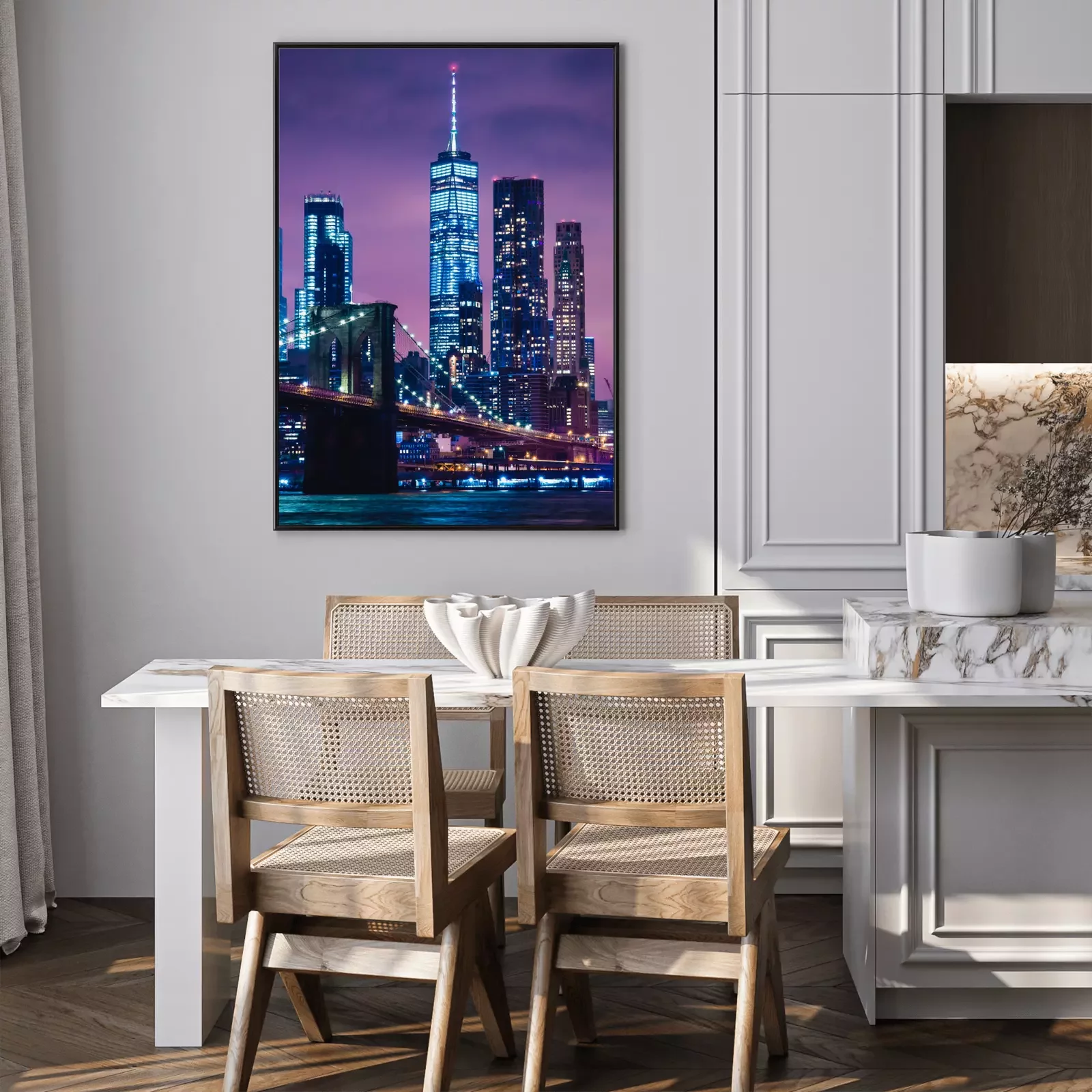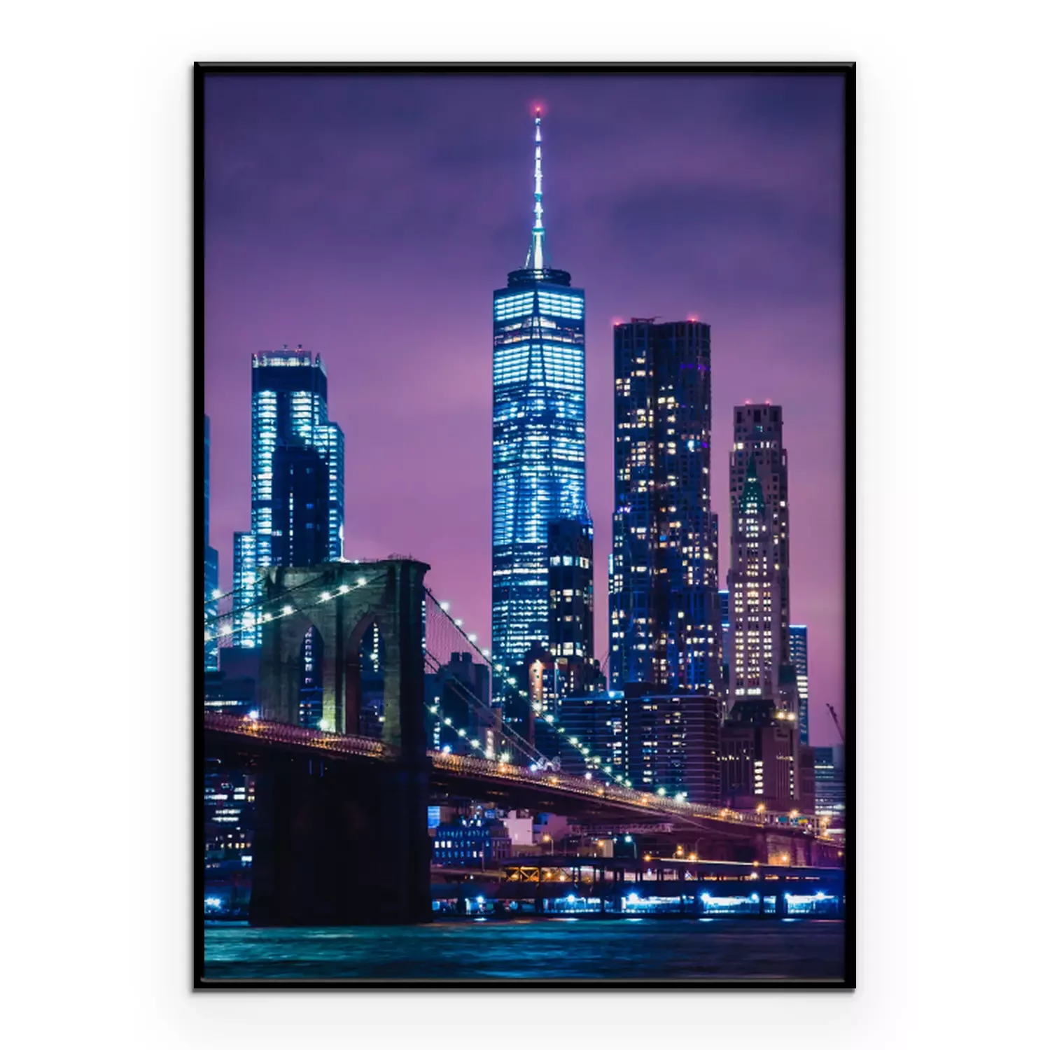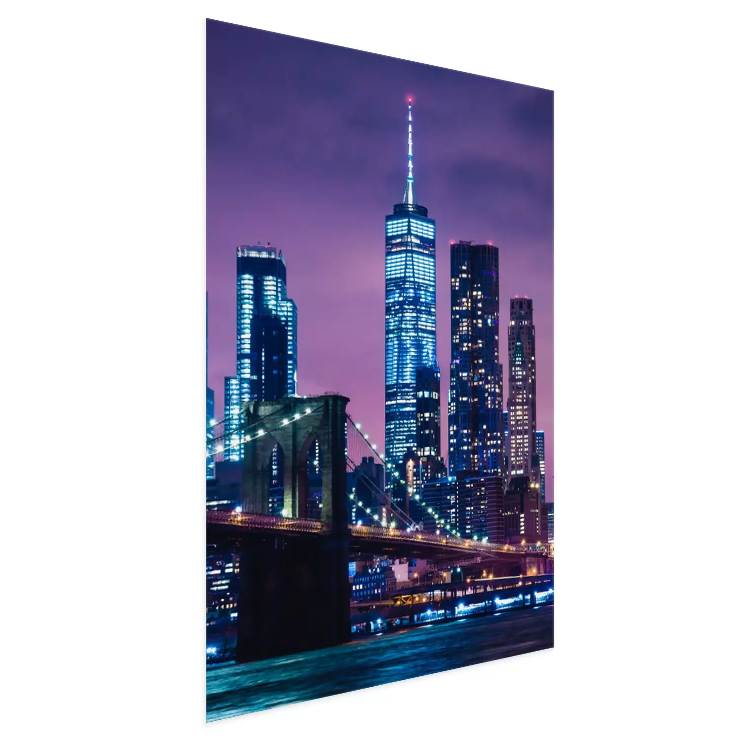 Poster  Skyline du centre-ville de New York Brooklyn Bridge et gratte-ciel au-dessus d'East River éclairé par des lumières au crépuscule après la vue du coucher du soleil de Brooklyn