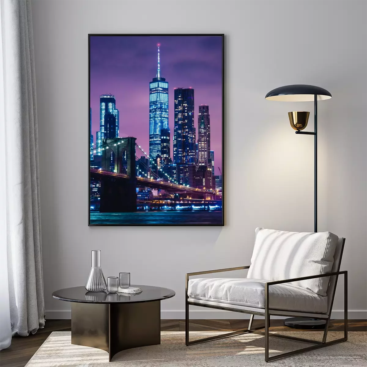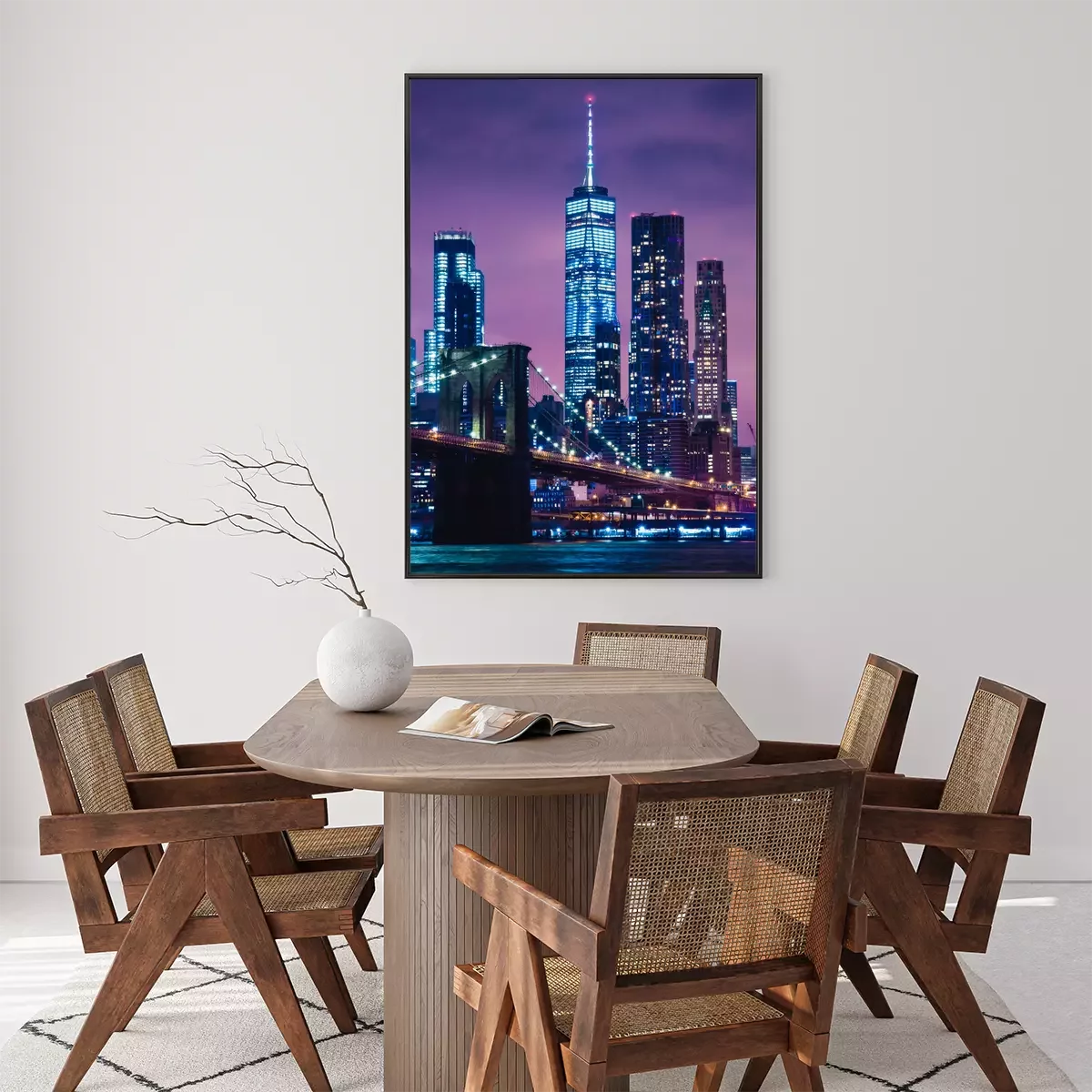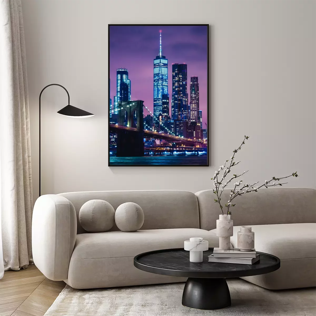 Poster  Skyline du centre-ville de New York Brooklyn Bridge et gratte-ciel au-dessus d'East River éclairé par des lumières au crépuscule après la vue du coucher du soleil de Brooklyn