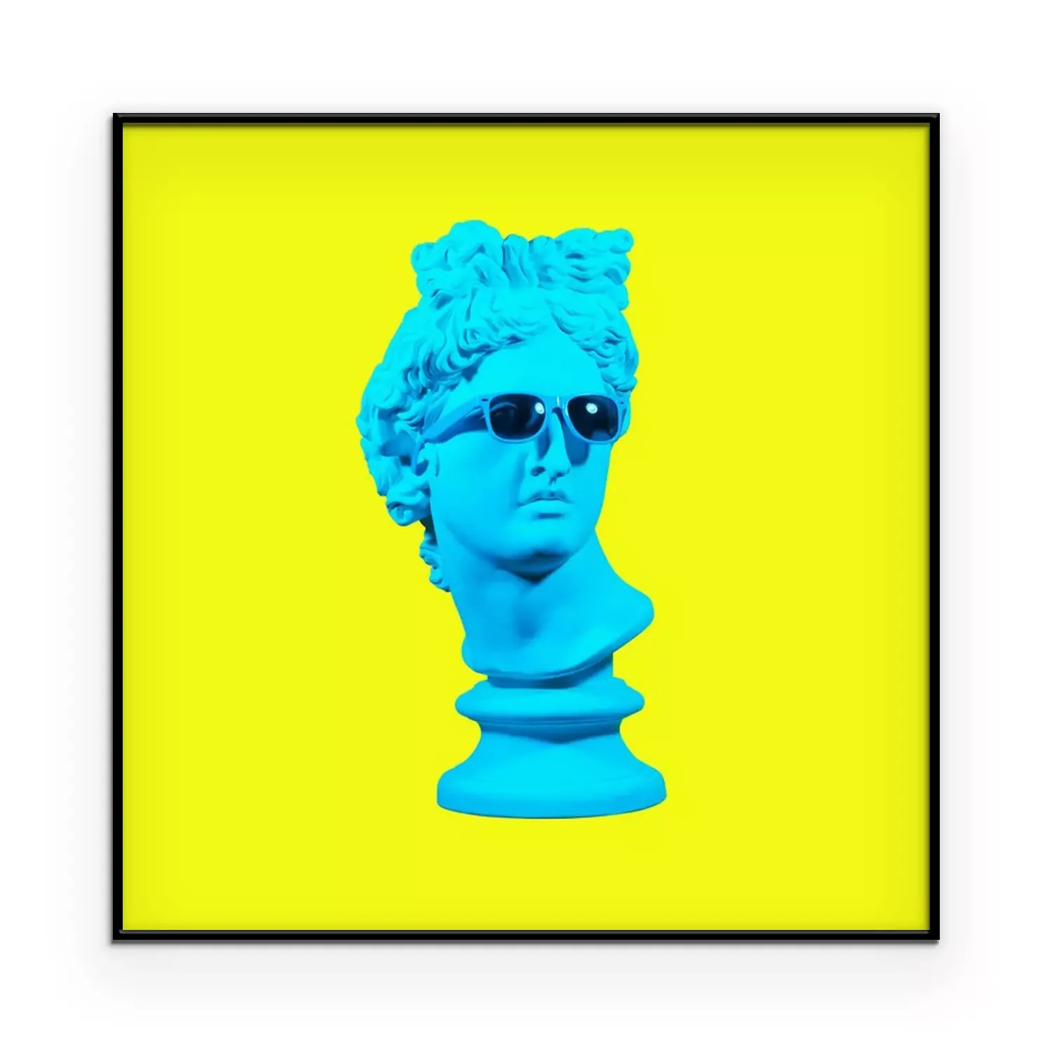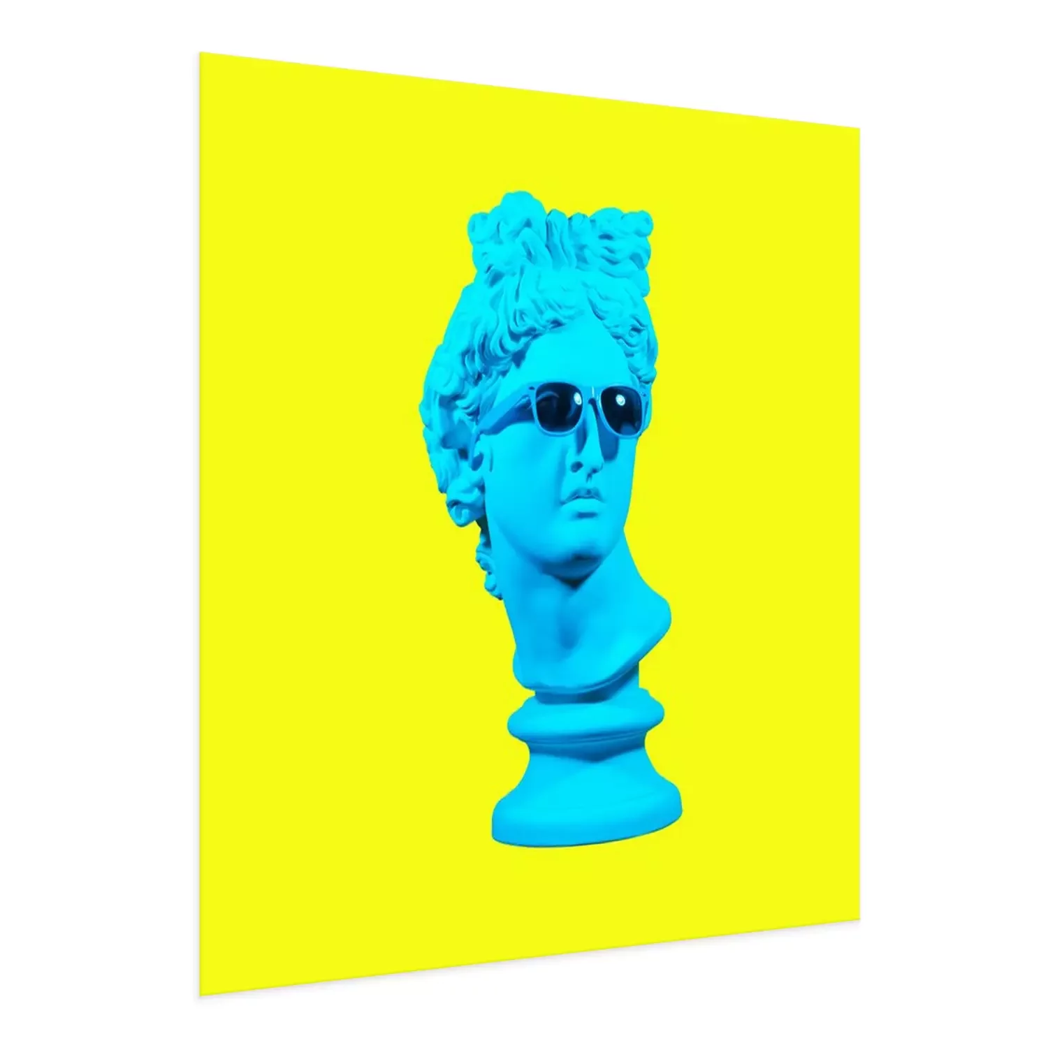 Poster : Statue on a yellow background. Gypsum statue of David's head. Creative. Plaster statue of Apollo's head in blue sunglasses. Minimal concept art.
