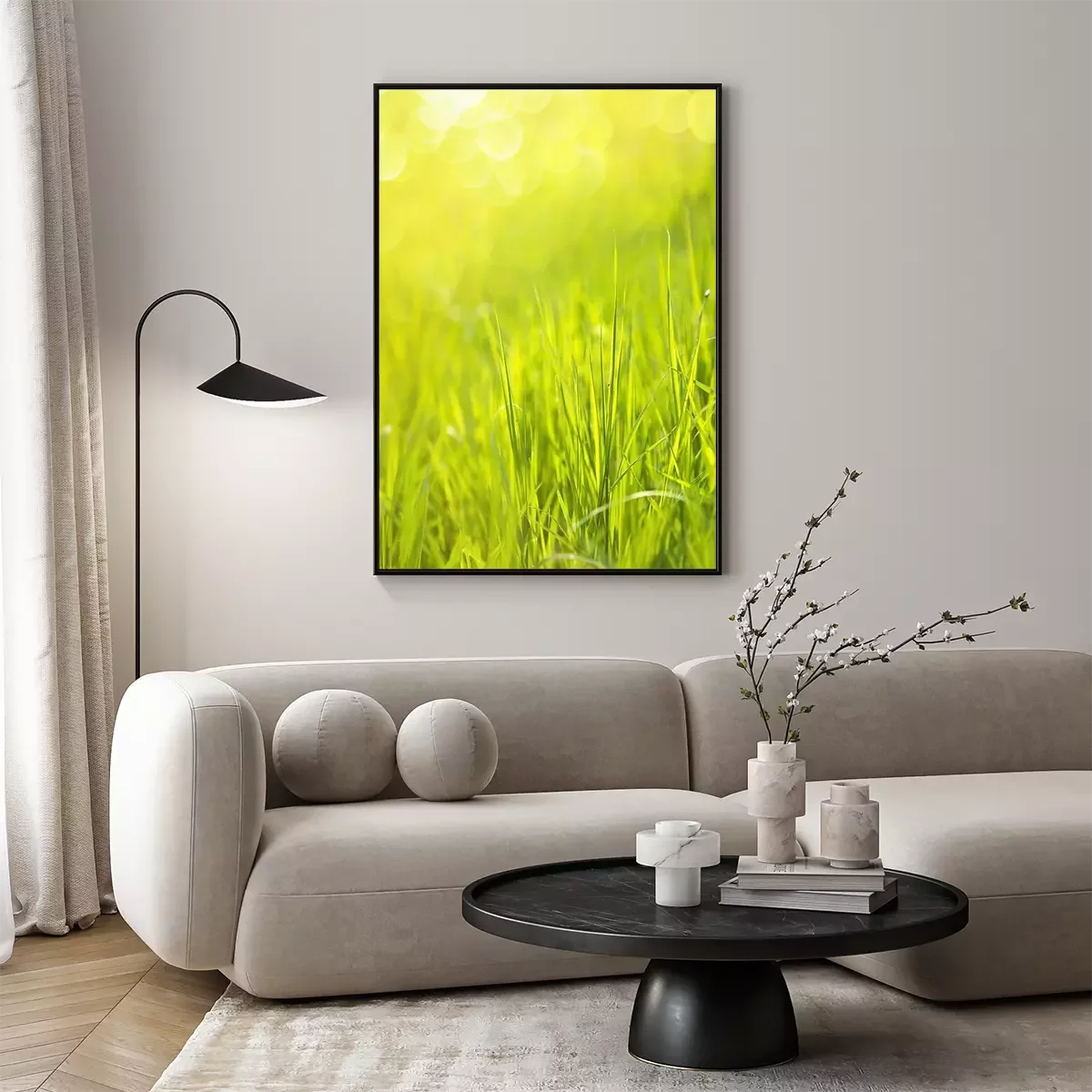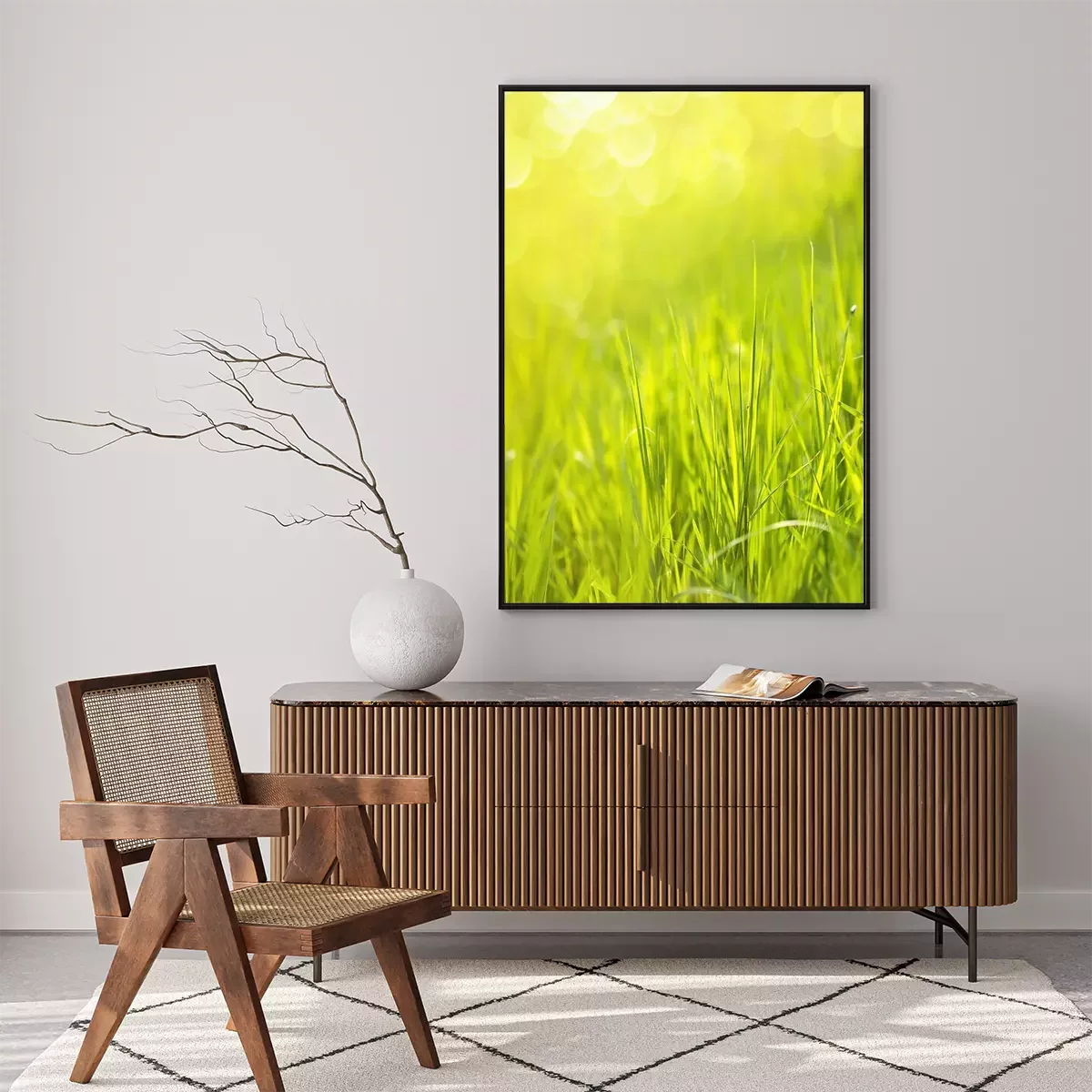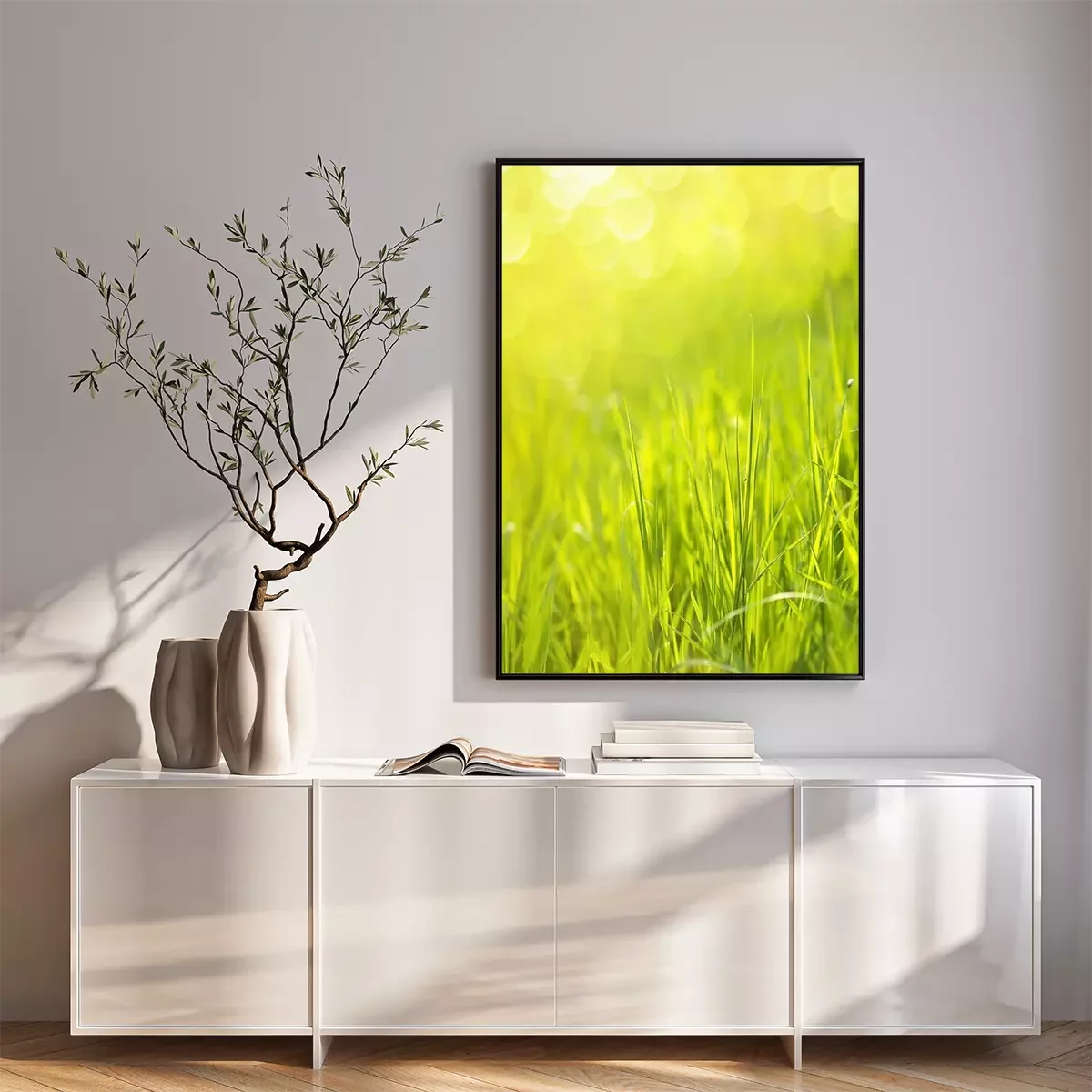 Poster  Sunny spring green grass background with bokeh