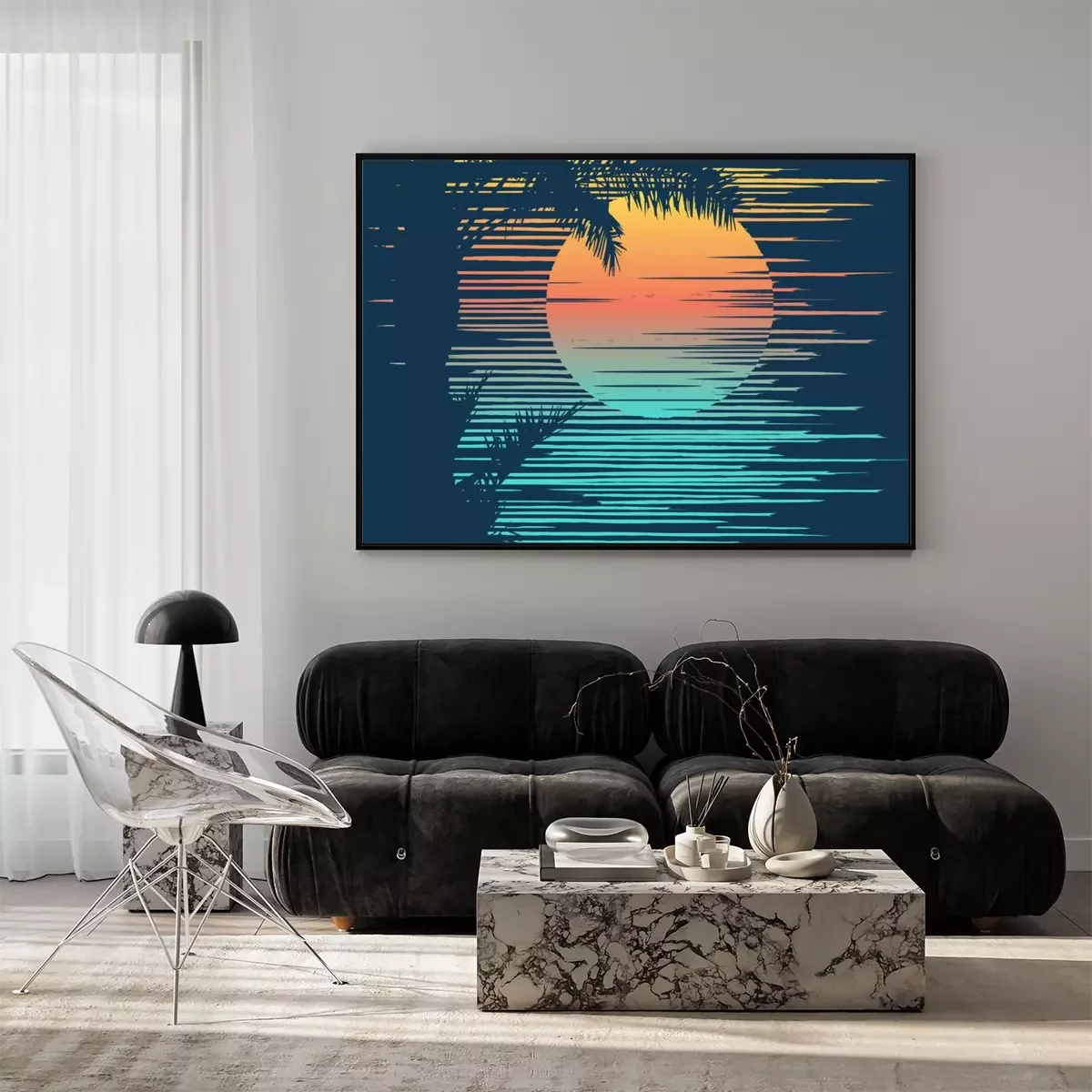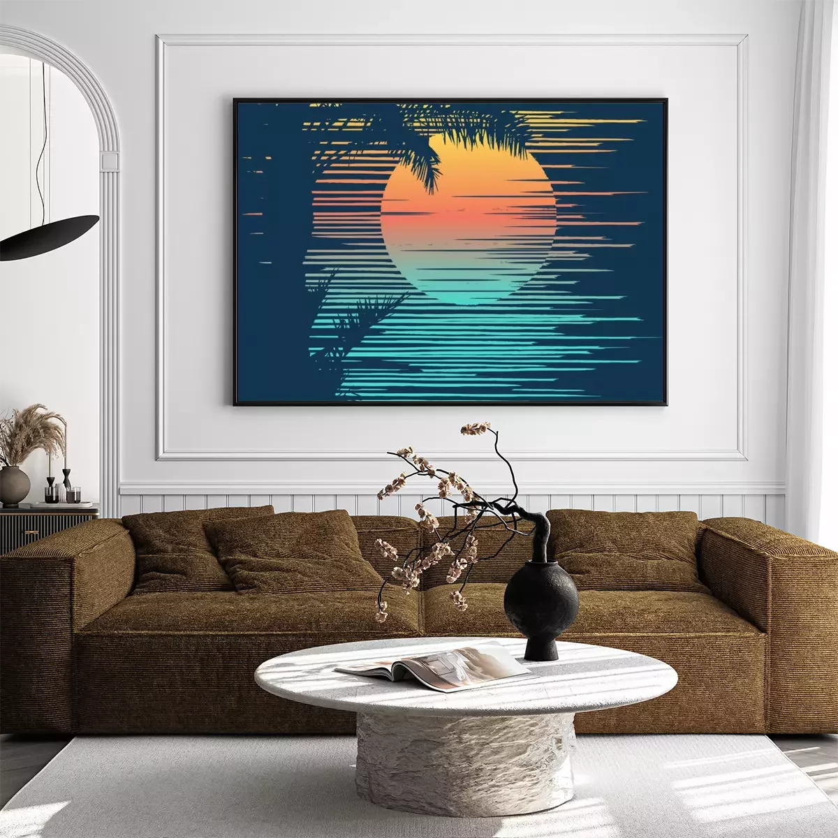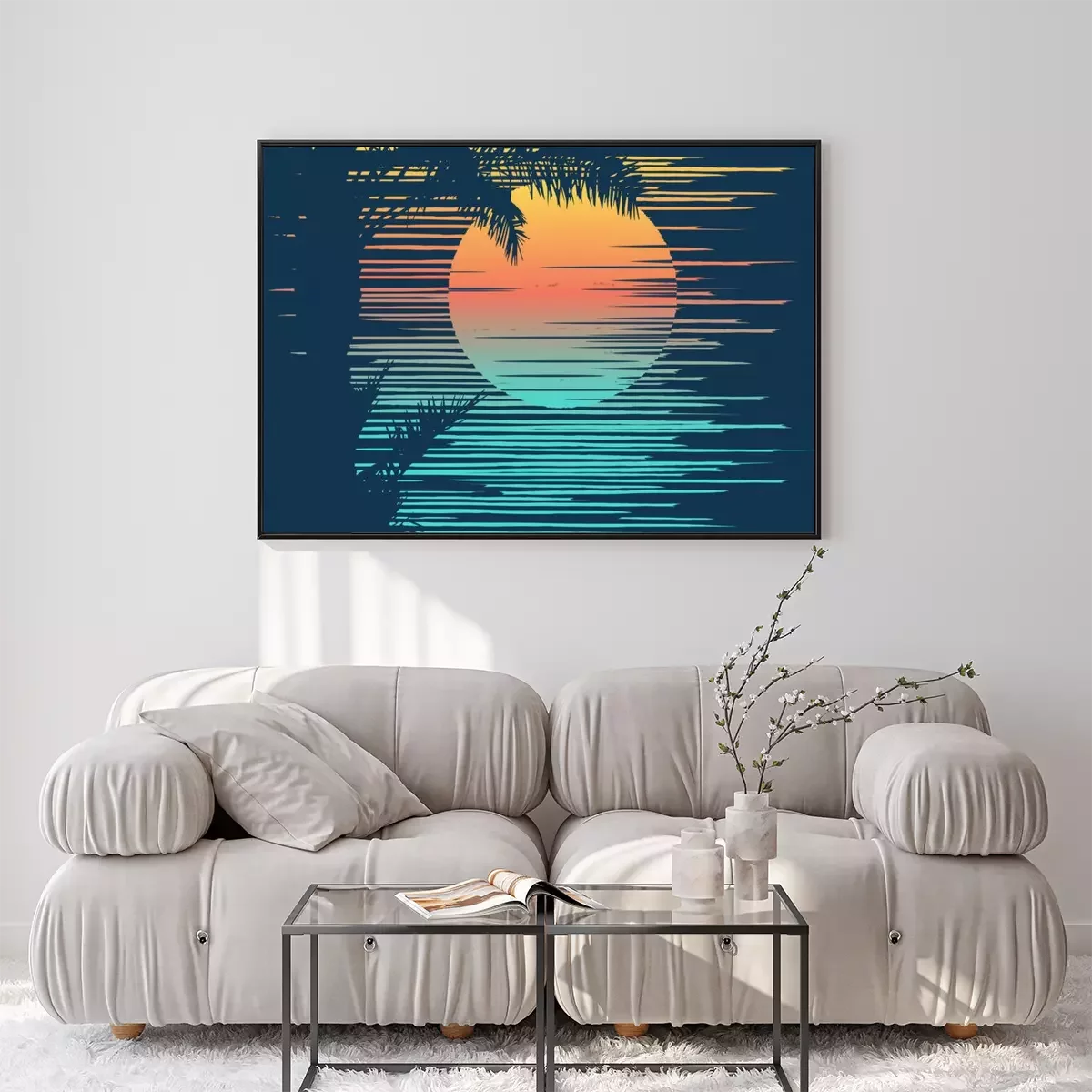 Poster  Sunset on tropical beach with palm tree. Sun over evening sea.