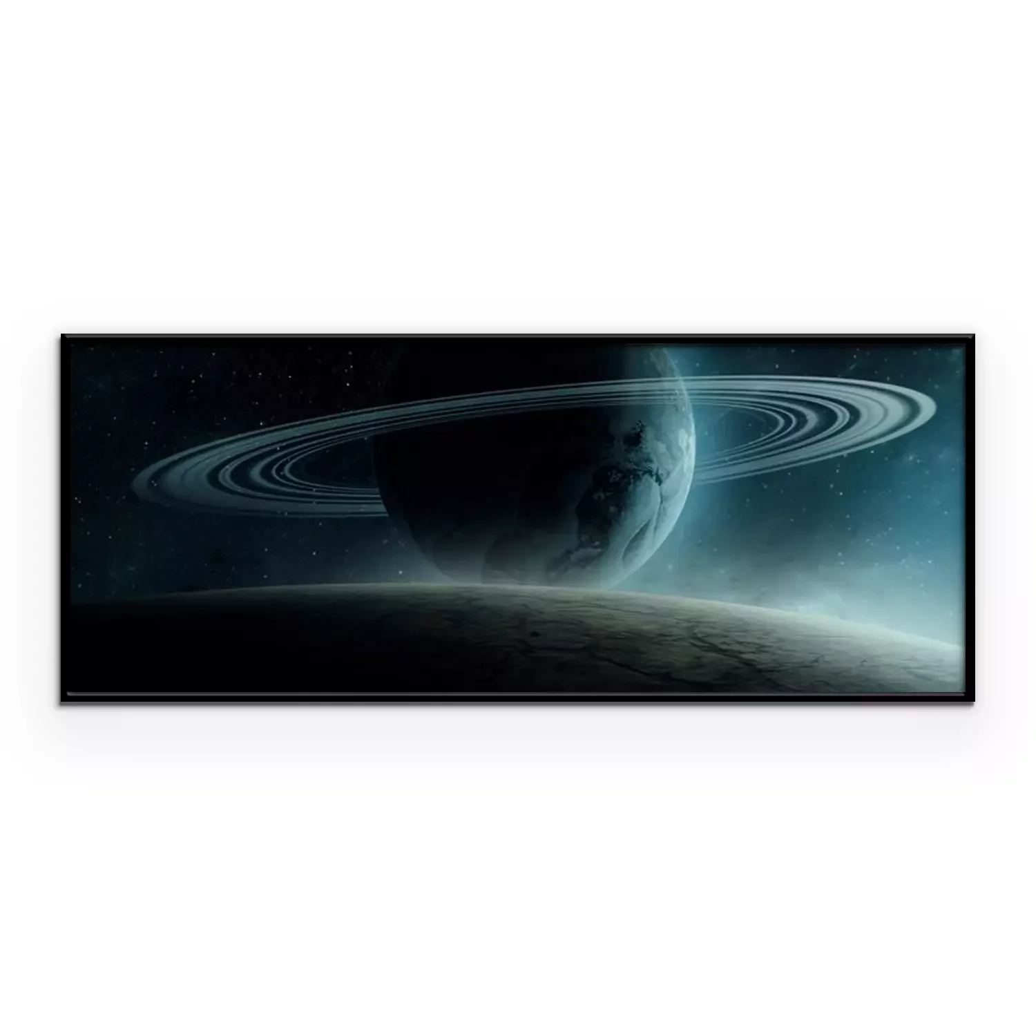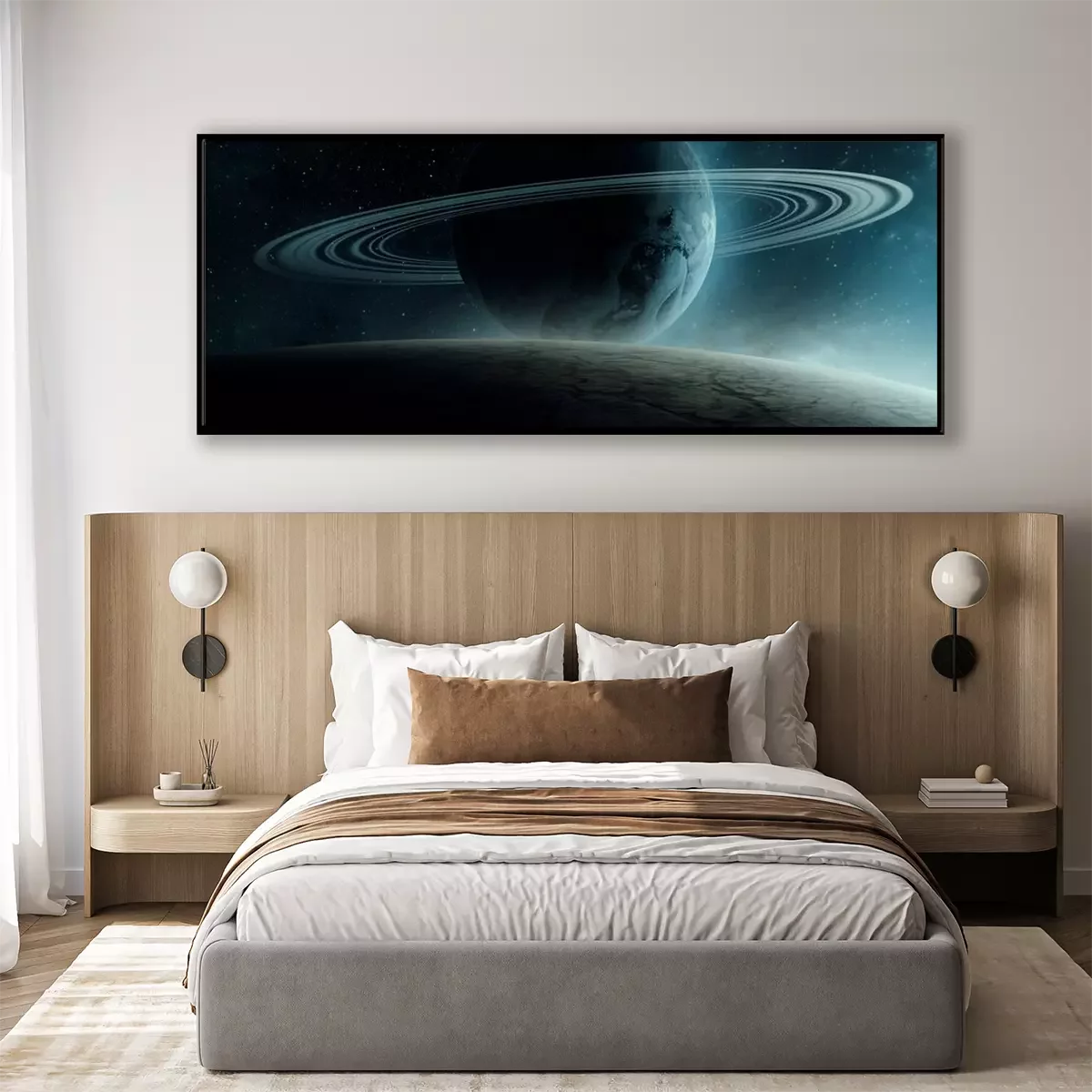 Poster  surreal space 3d illustration, planet with rings rising over horizon (no NASA images used)
