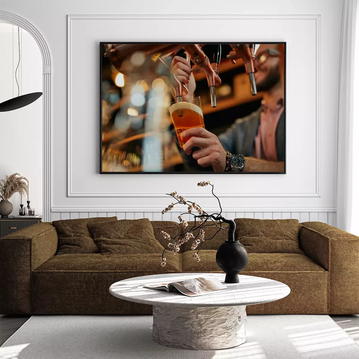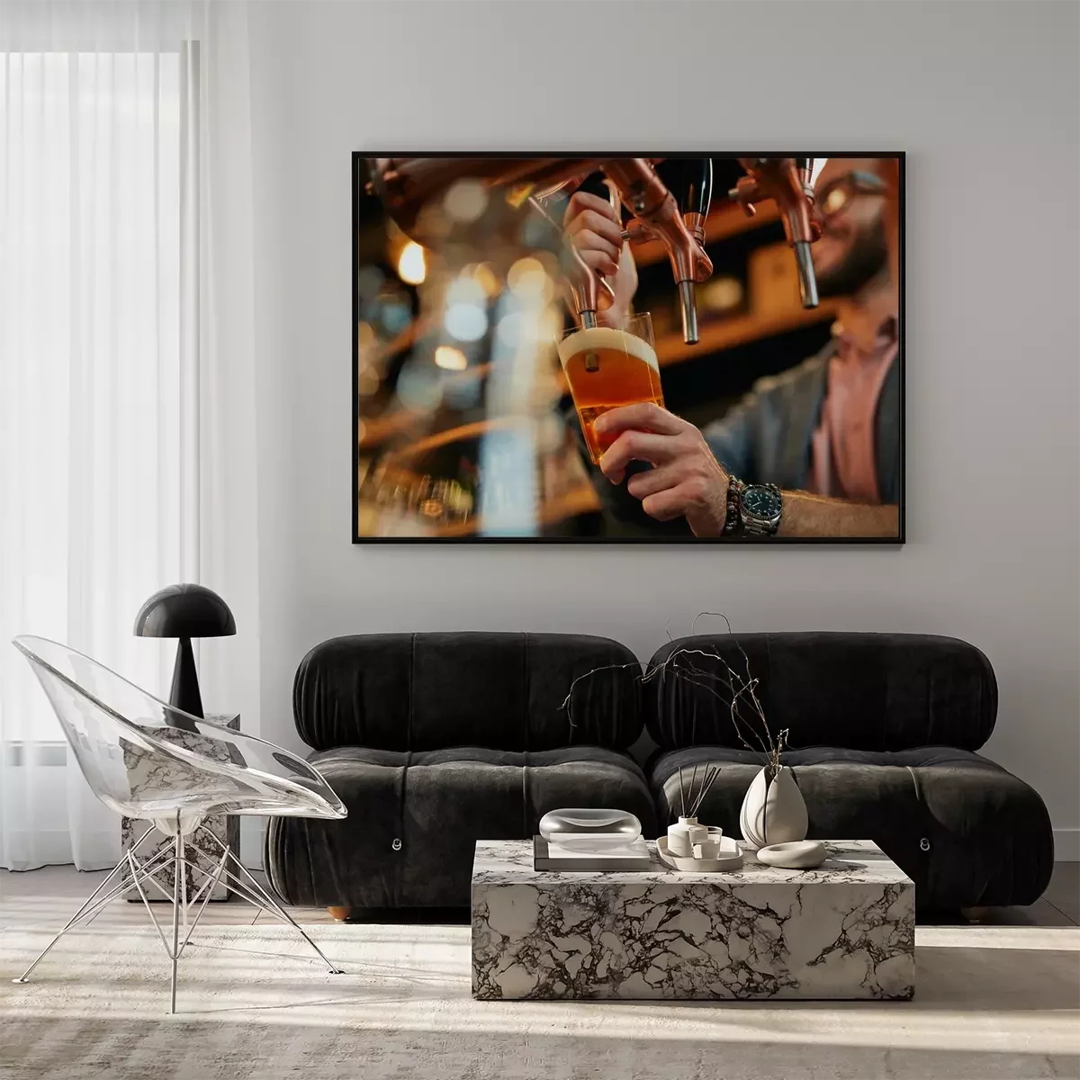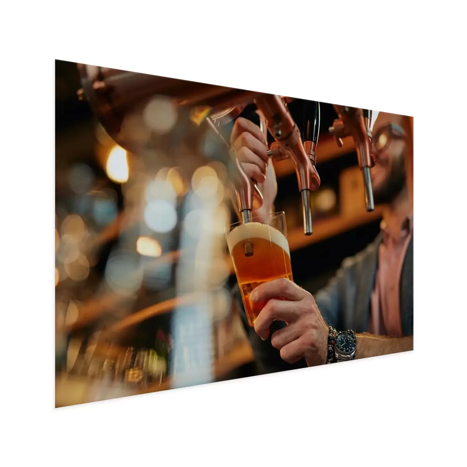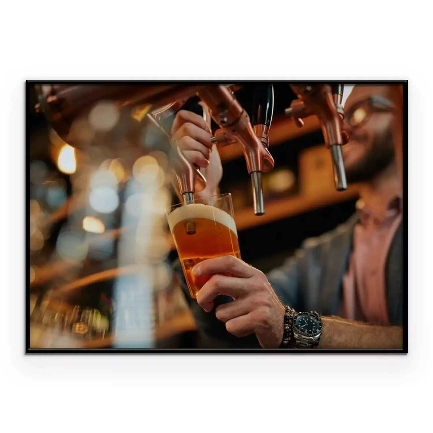 Poster : Tattooed caucasian barman pouring beer while standing in pub.