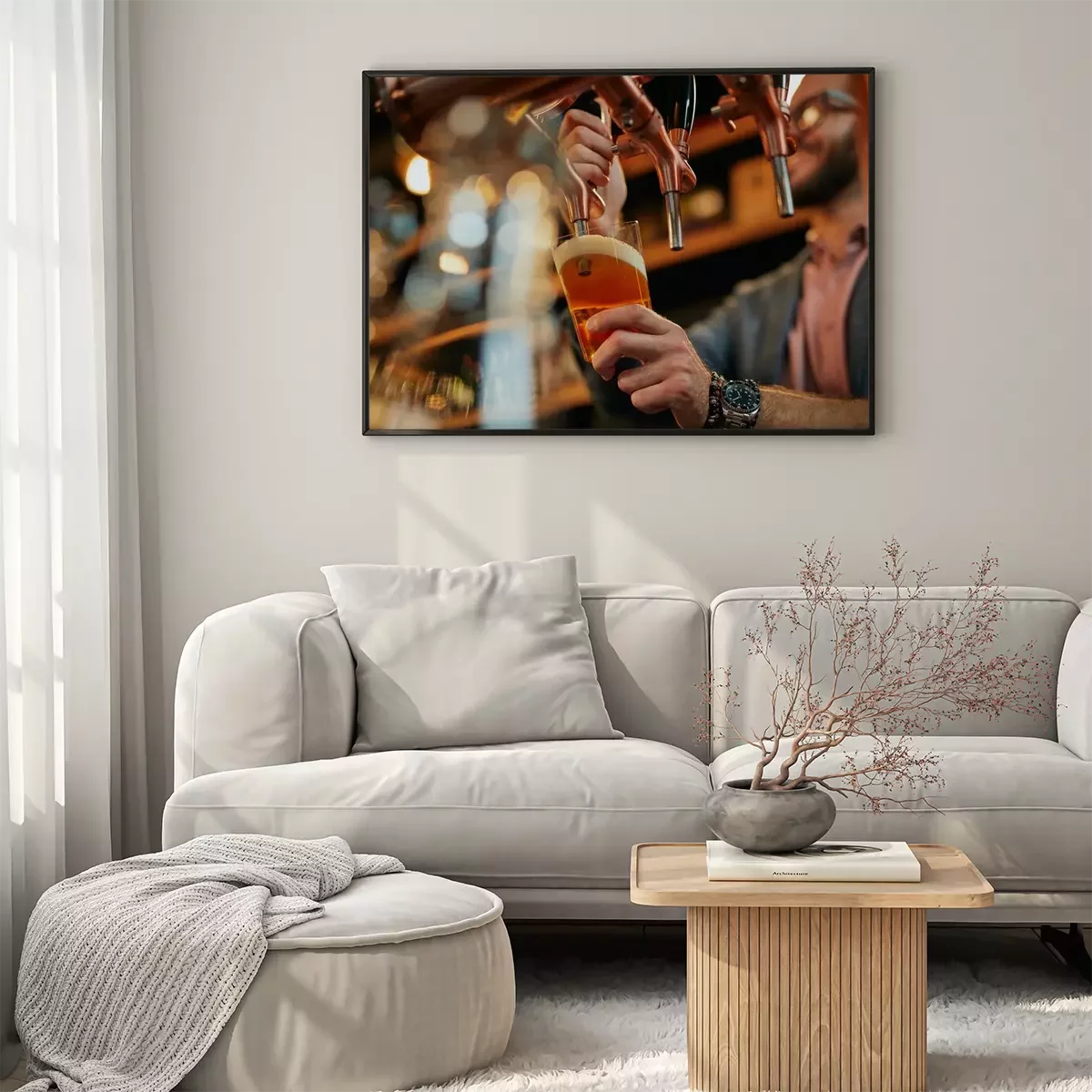 Poster  Tattooed caucasian barman pouring beer while standing in pub.