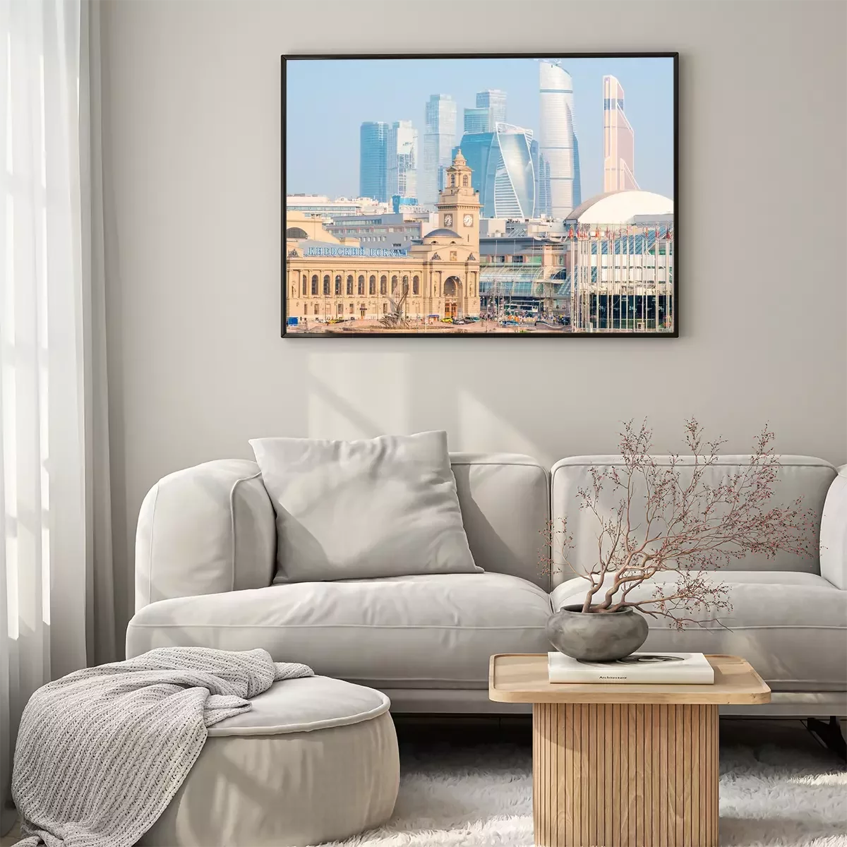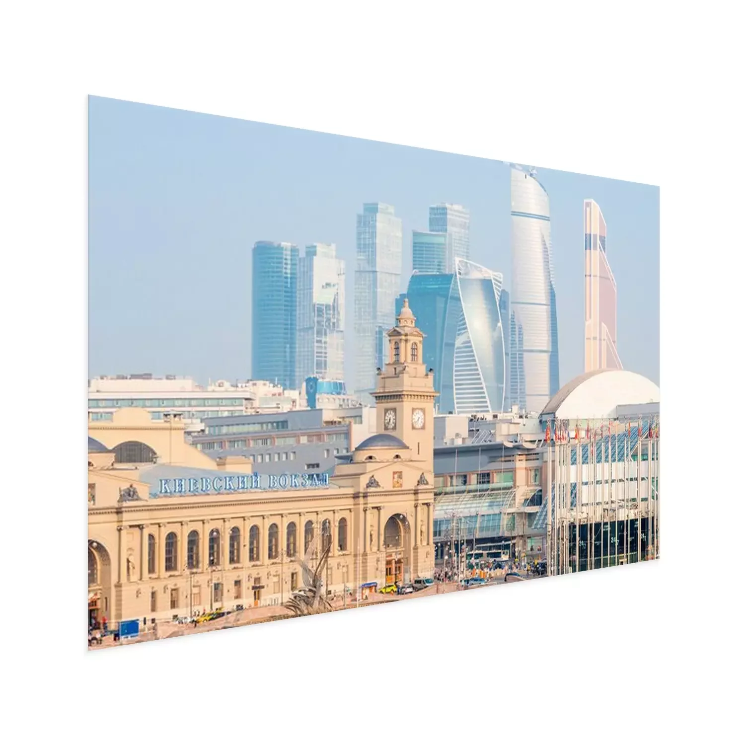 Poster  The building of the Kiev railway station of Moscow and the tall skyscrapers of Moscow City