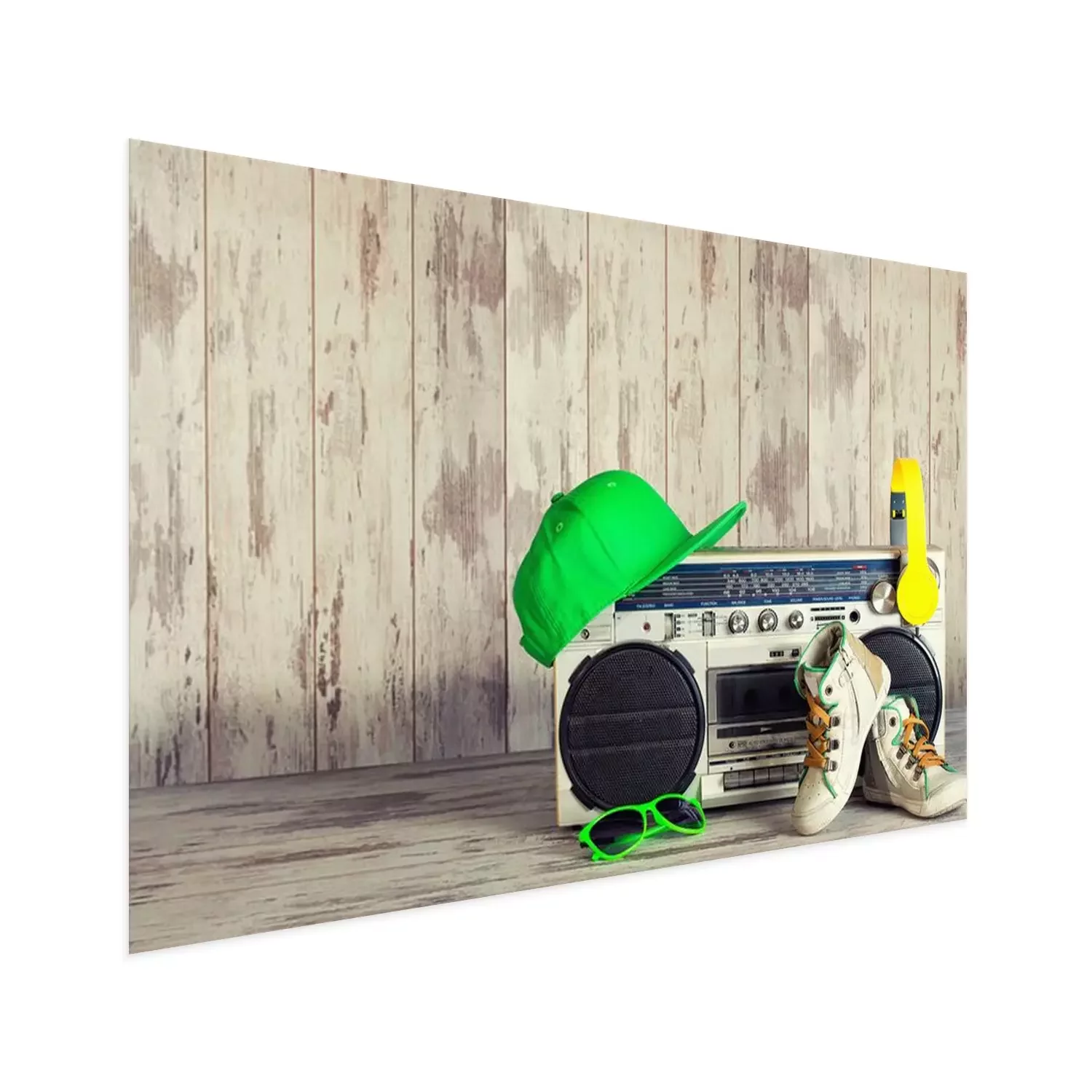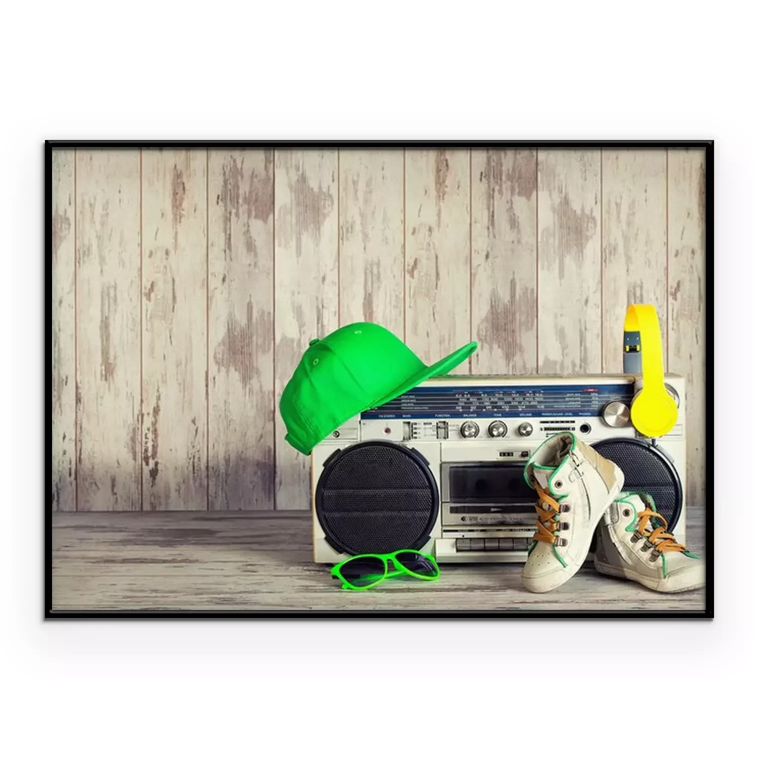 Poster  The concept of the music Hip hop style.Vintage audio player with headphones,fashionable cap, sneakers and sunglasses.