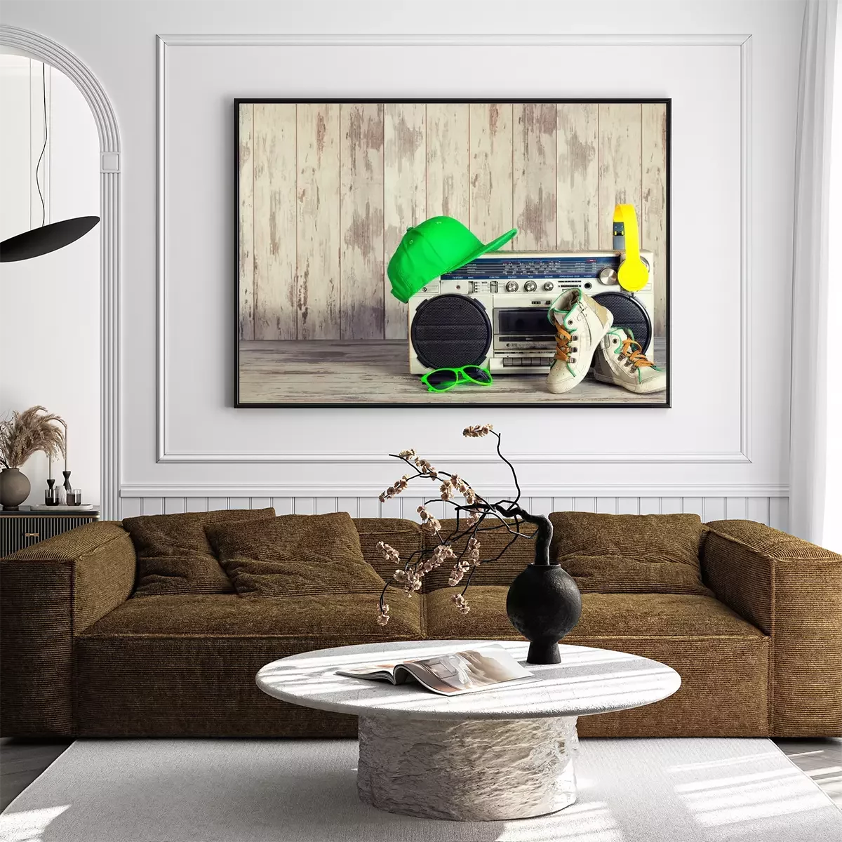 Poster : The concept of the music Hip hop style.Vintage audio player with headphones,fashionable cap, sneakers and sunglasses.