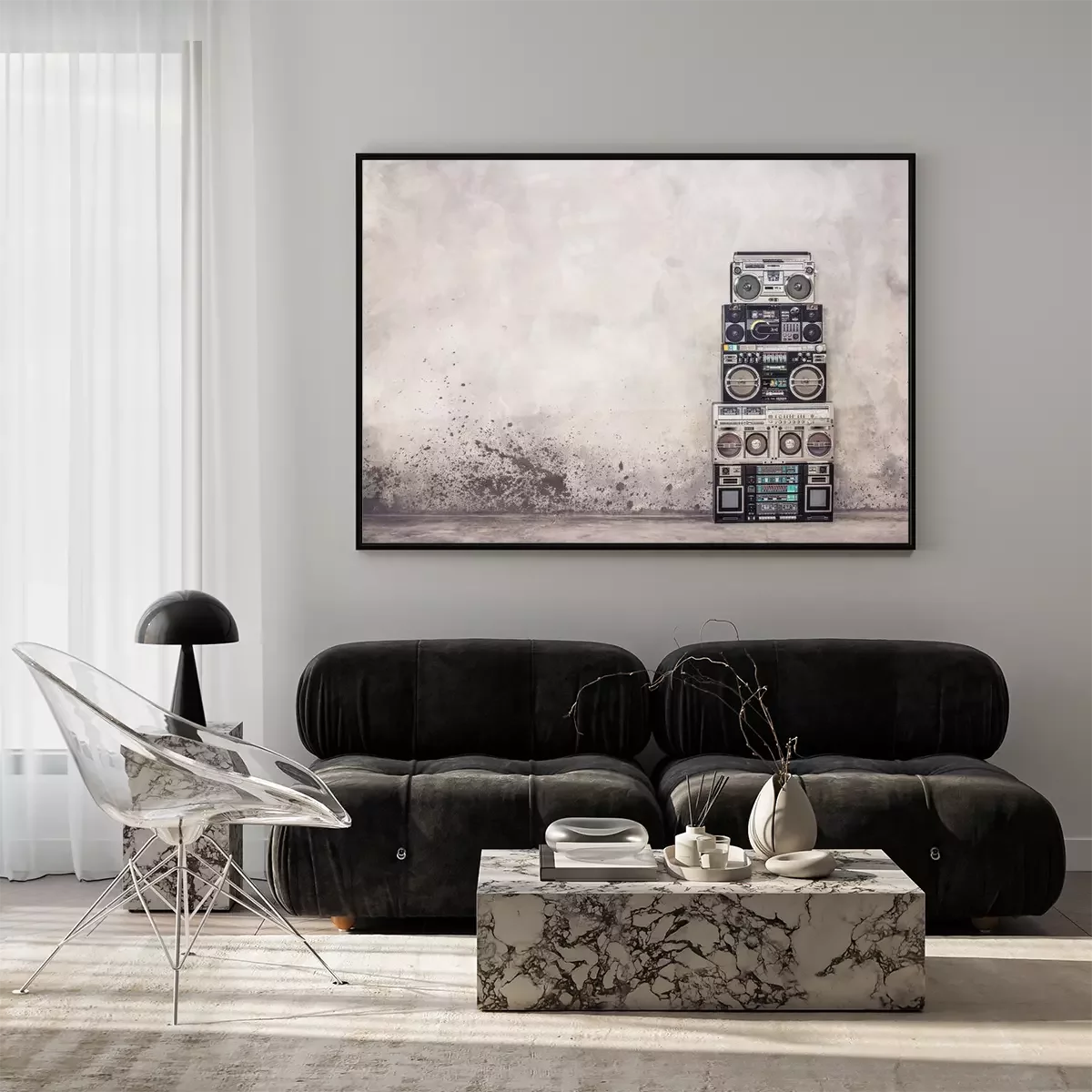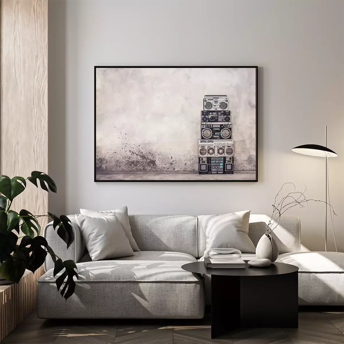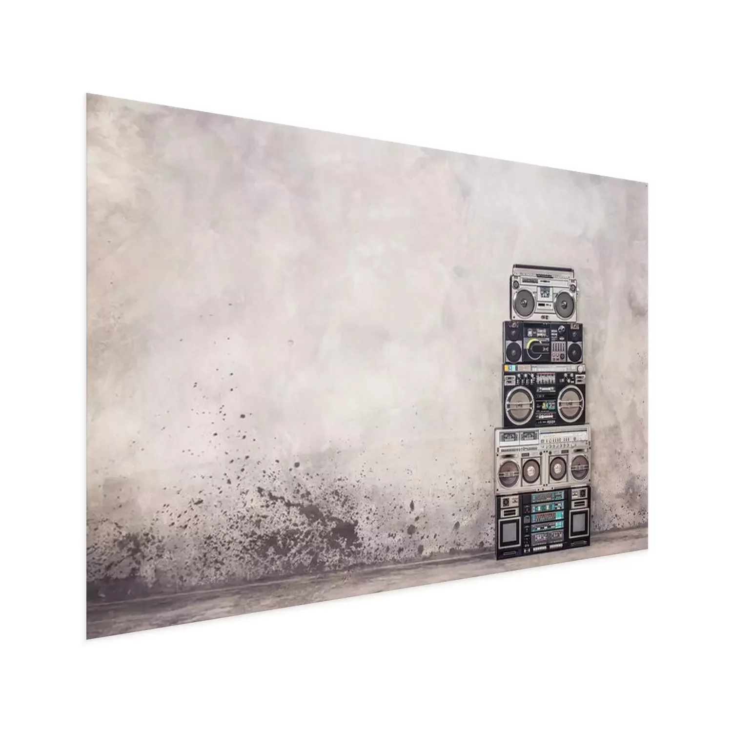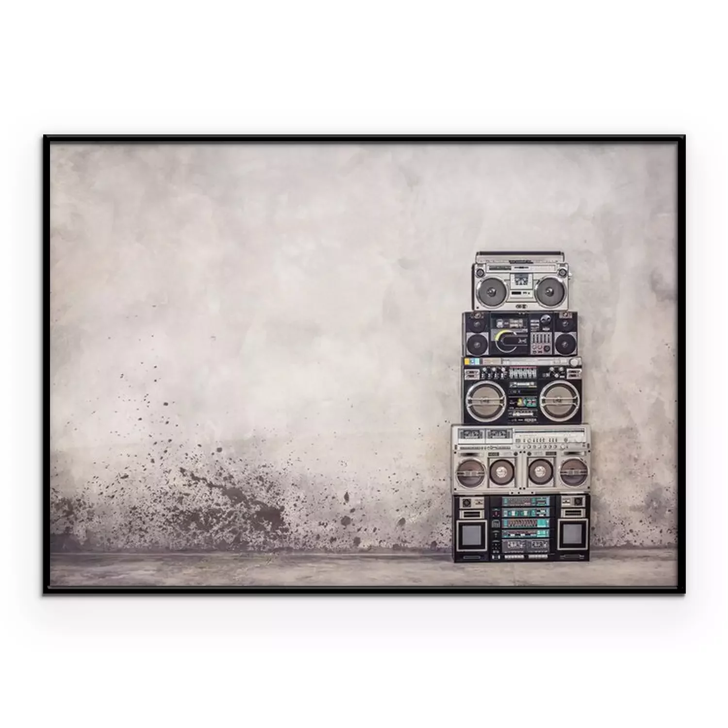 Poster  Tour de la vieille école rétro design ghetto blaster boombox stéréo radio magnétophone à cassettes tour de fond des murs de béton avant des années 1980. Photo filtrée de style vintage