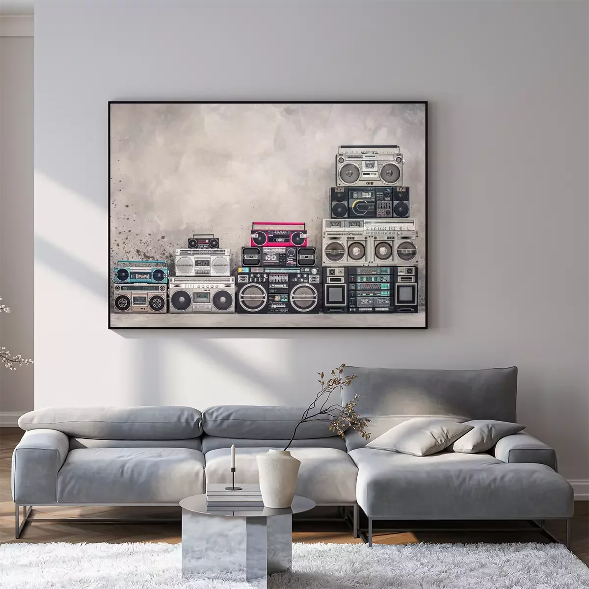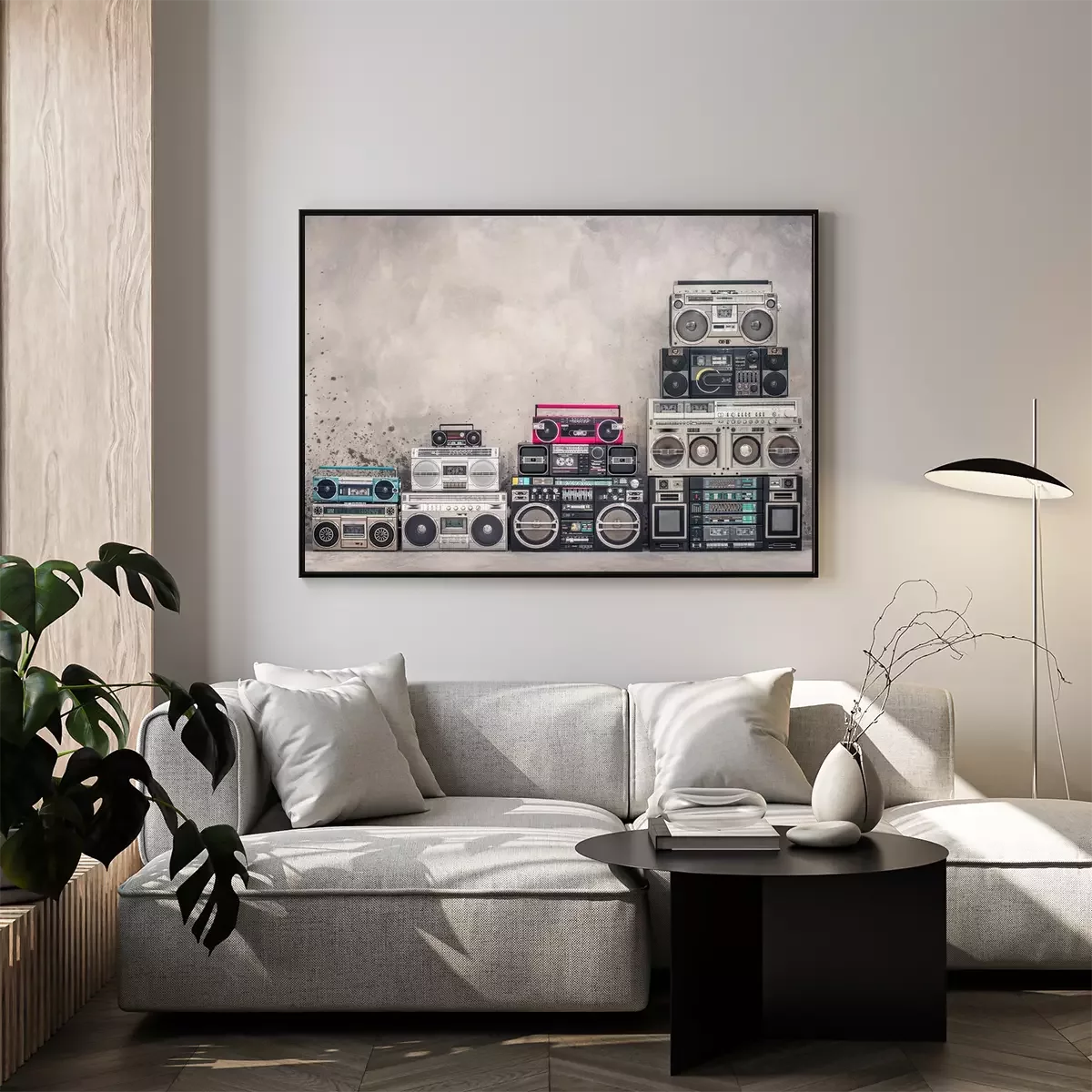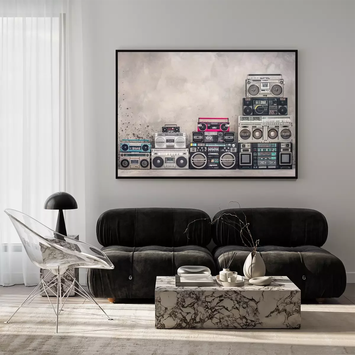Poster : Tour rétro vieille école conception ghetto blaster boombox stéréo radio magnétophone à cassettes tour à partir des années 1980 avant fond de mur en béton. Photo filtrée de style vintage