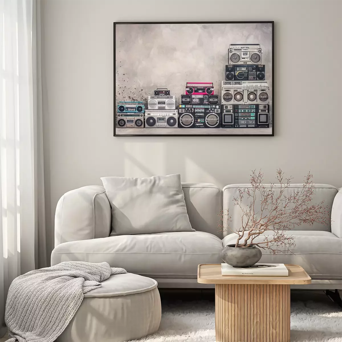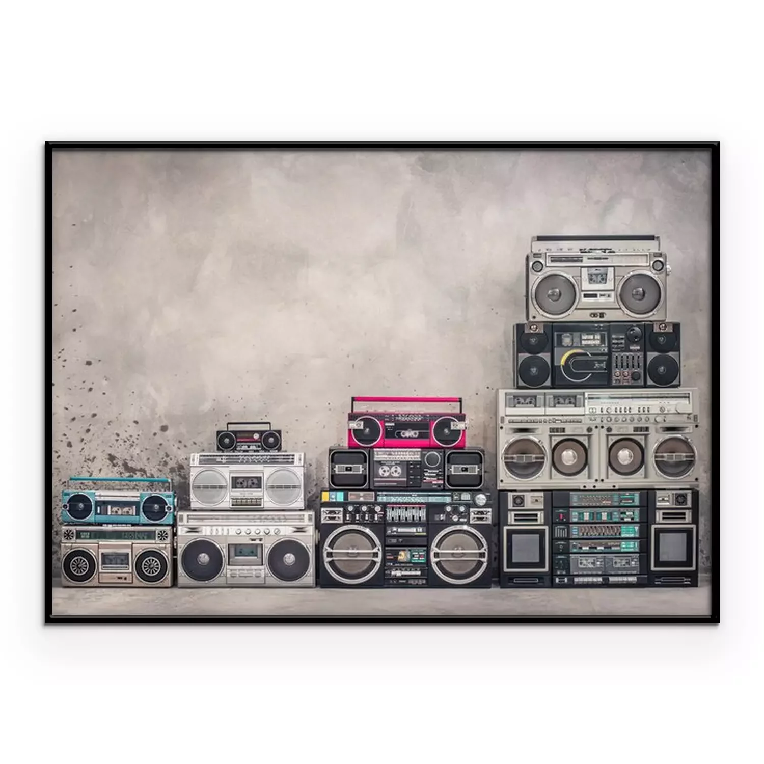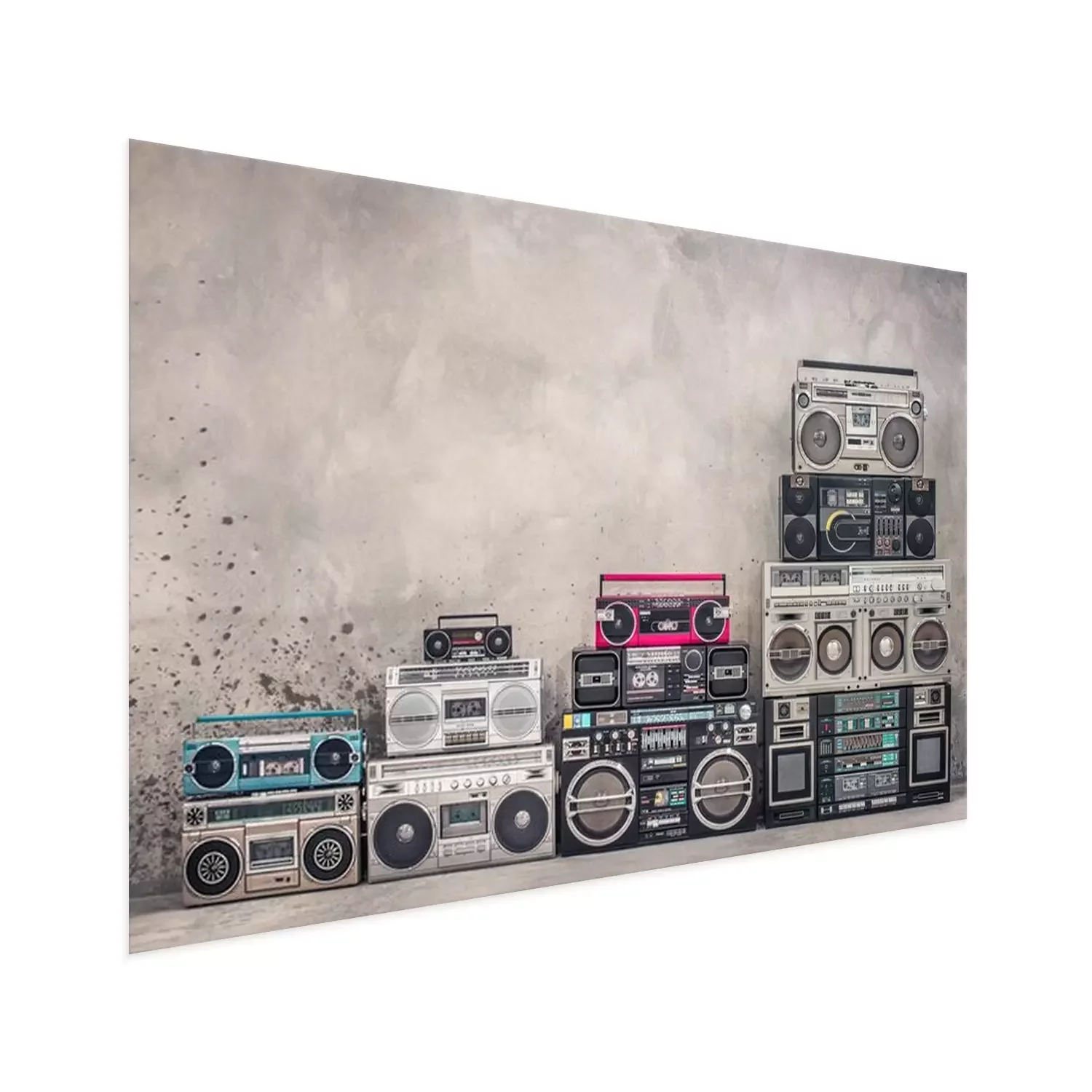 Poster  Tour rétro vieille école conception ghetto blaster boombox stéréo radio magnétophone à cassettes tour à partir des années 1980 avant fond de mur en béton. Photo filtrée de style vintage