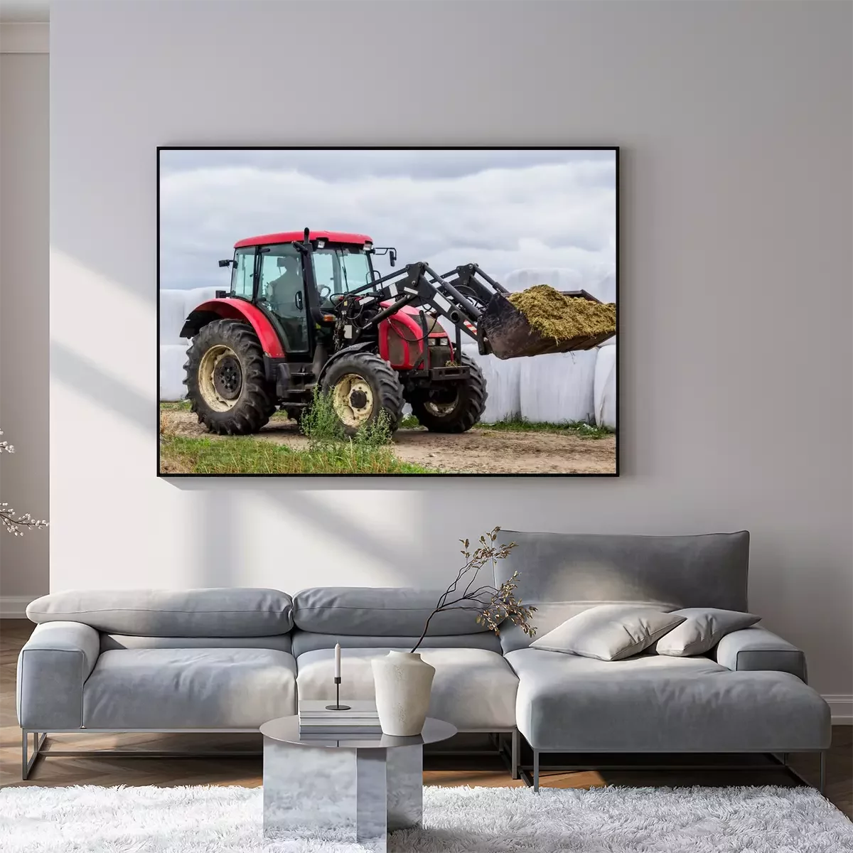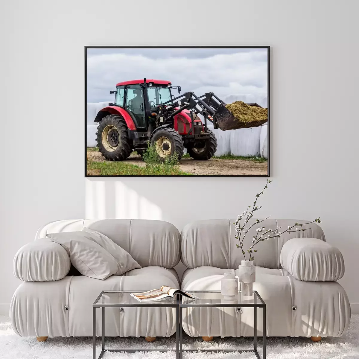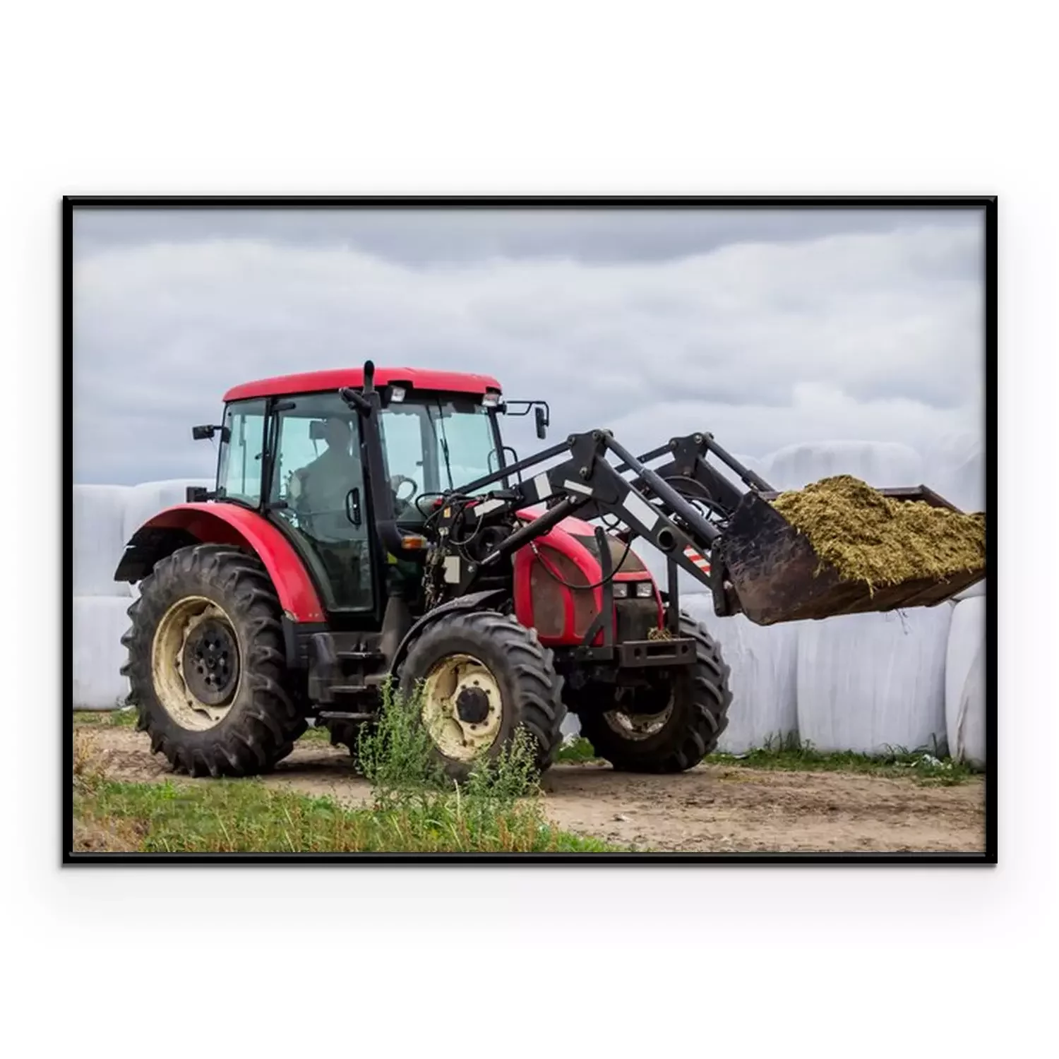 Poster : Tractor with front end loader scored feed for cows. View of the side on the background of bales with silage. Necessary equipment for a dairy farm.