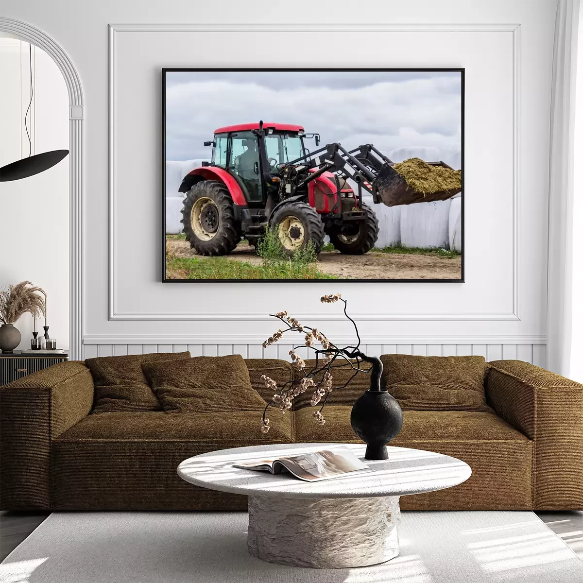 Poster  Tractor with front end  loader scored feed for cows. View of the side on the background of bales with silage. Necessary equipment for a dairy farm.