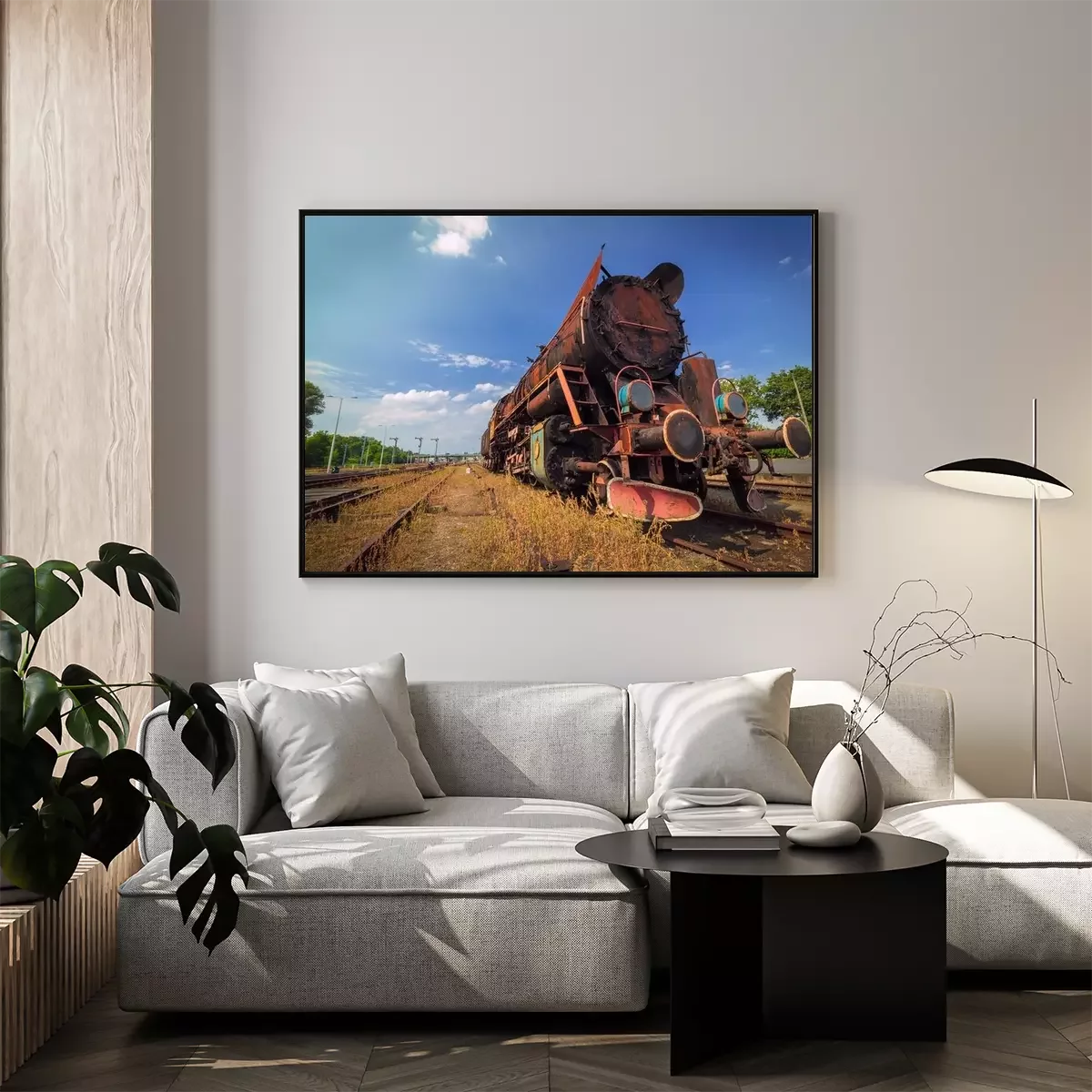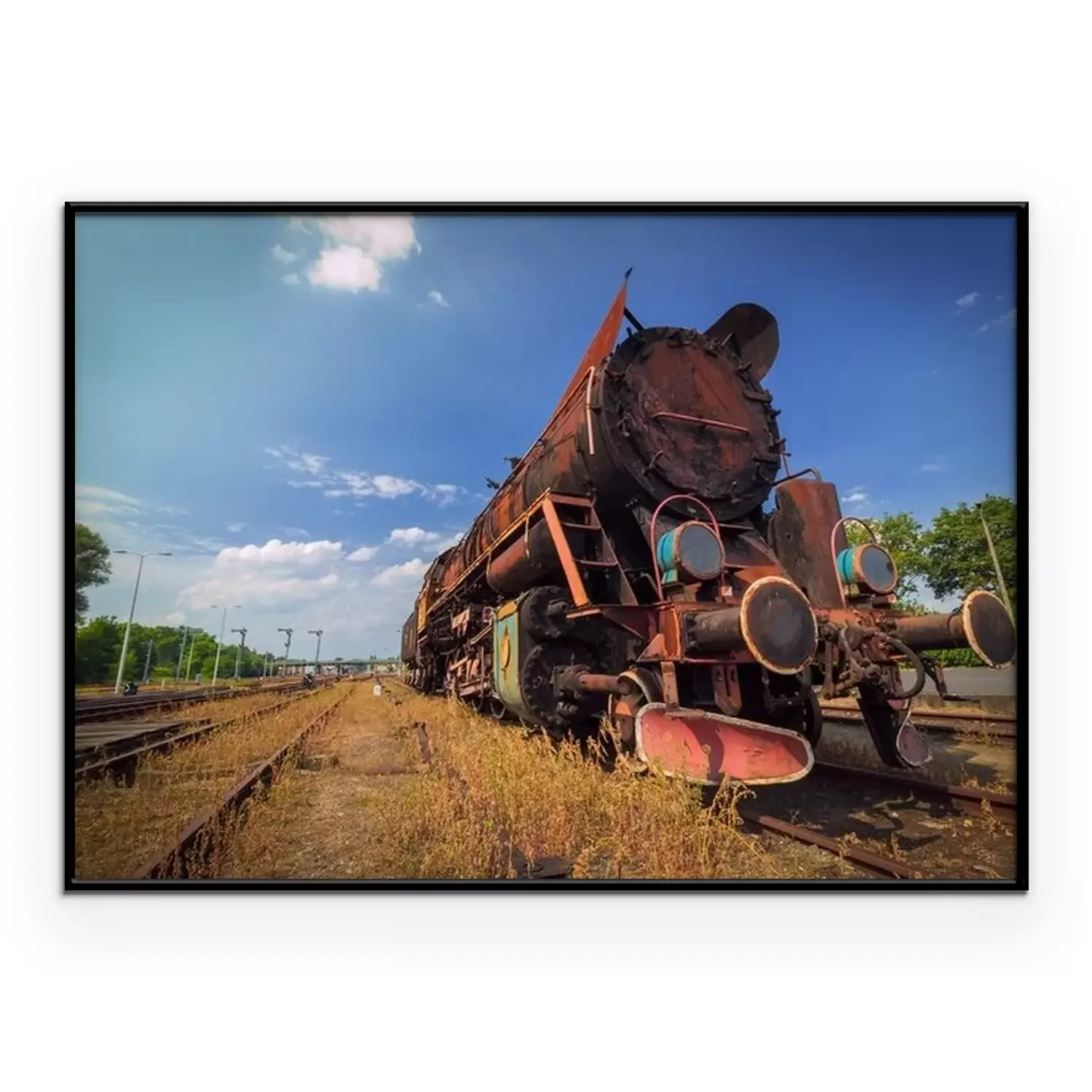 Poster  train à vapeur rouillé vieux millésime sous le ciel bleu