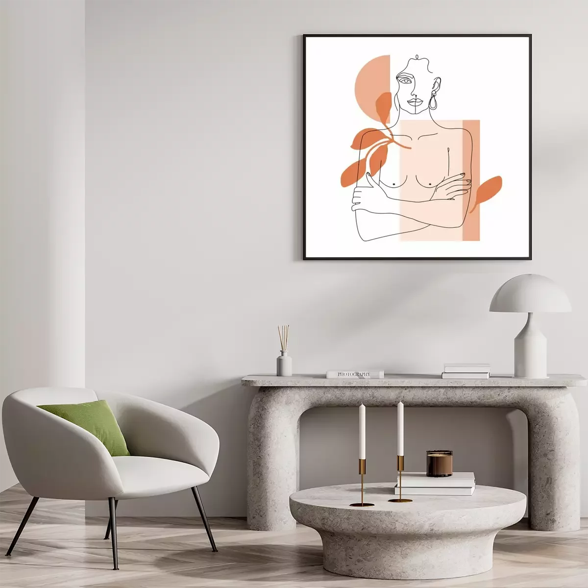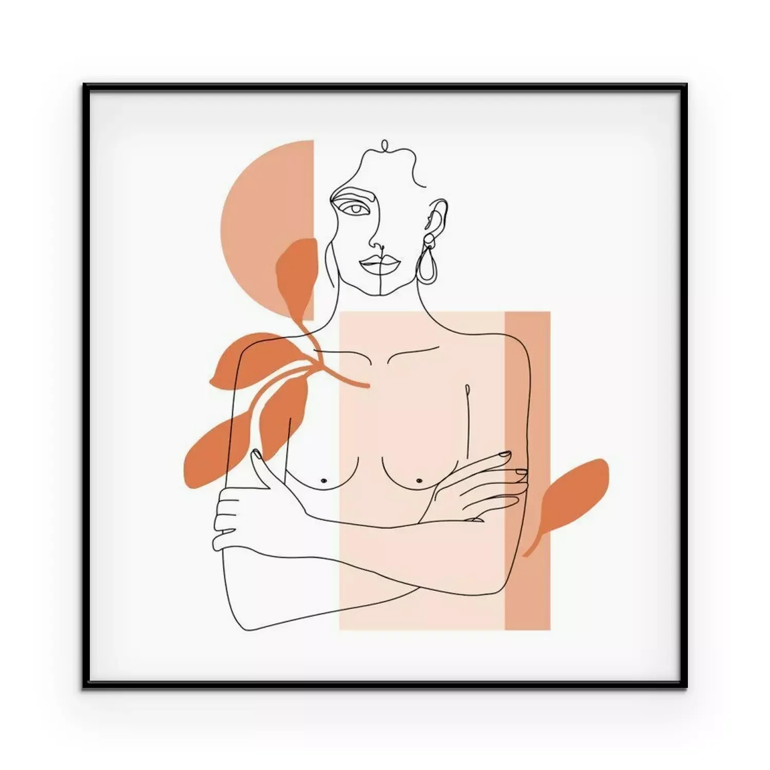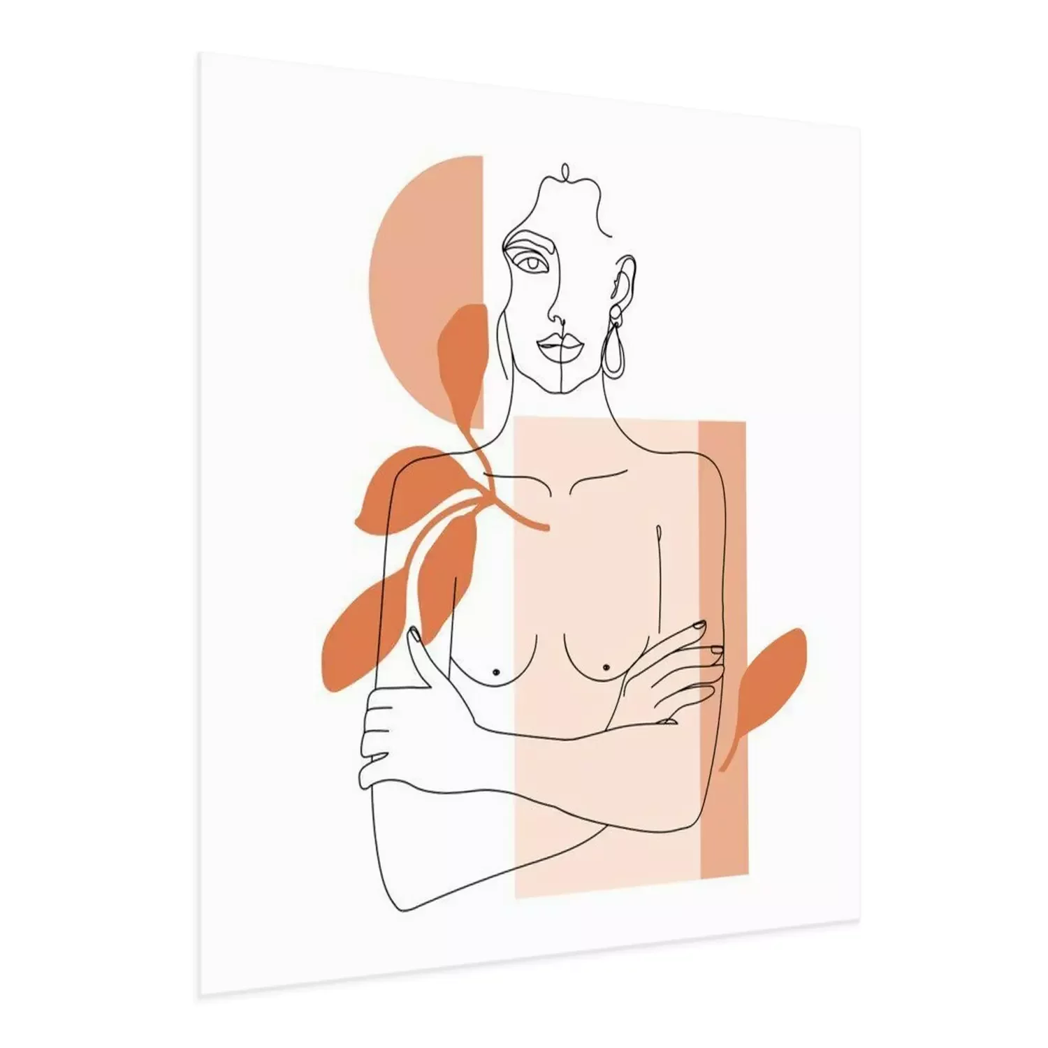 Poster : Trendy one line woman body with abstract geometric shapes. Girl crossing arms on her chest. Elegant continuous line print for textile, poster, card, t-shirt etc. Vector fashion illustration.