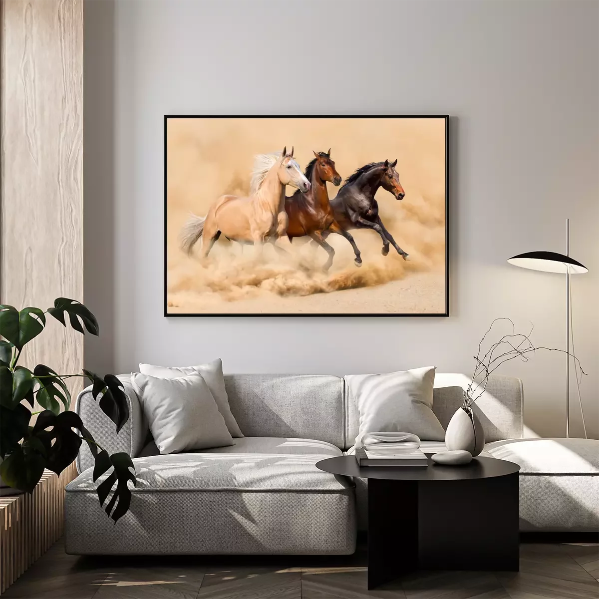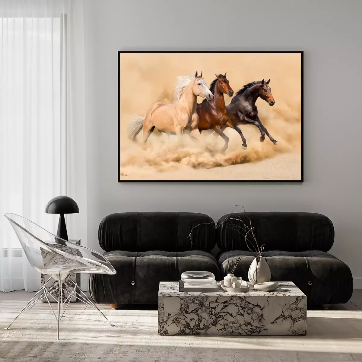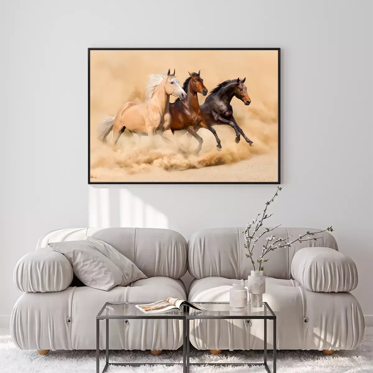 Poster  Trois chevaux courir dans le désert tempête de sable