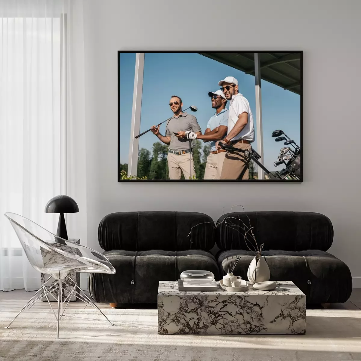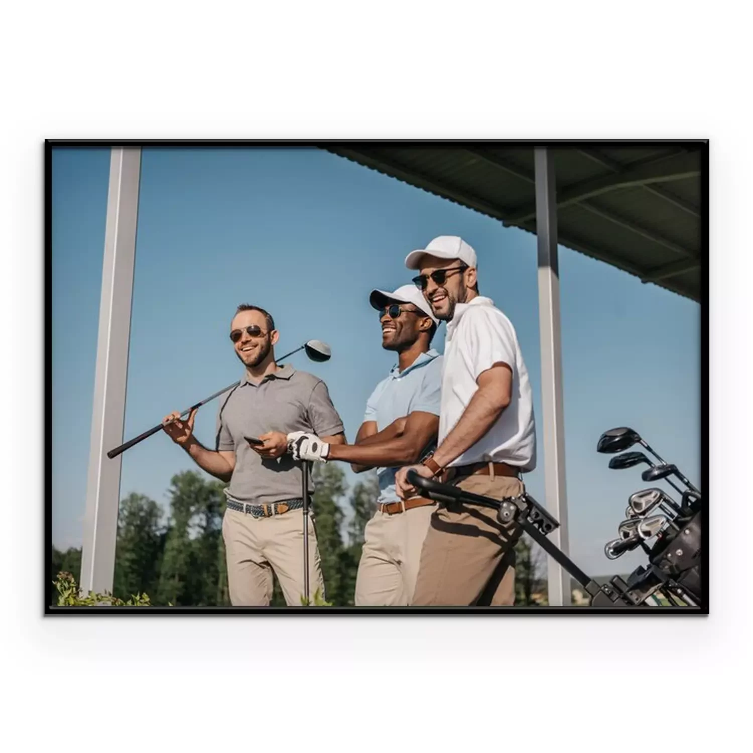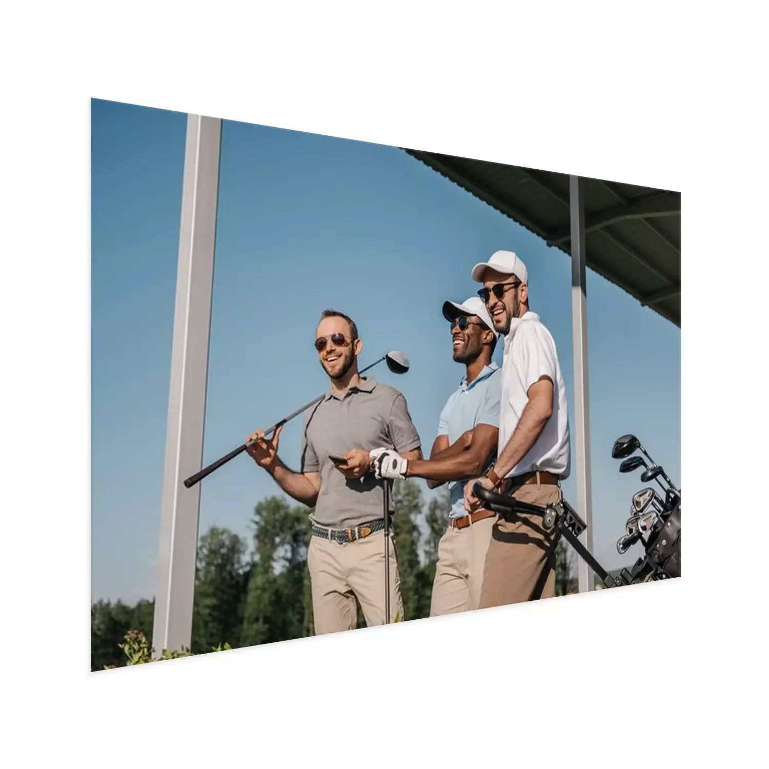 Poster : Trois hommes souriants dans des lunettes de soleil tenant des clubs de golf en plein air