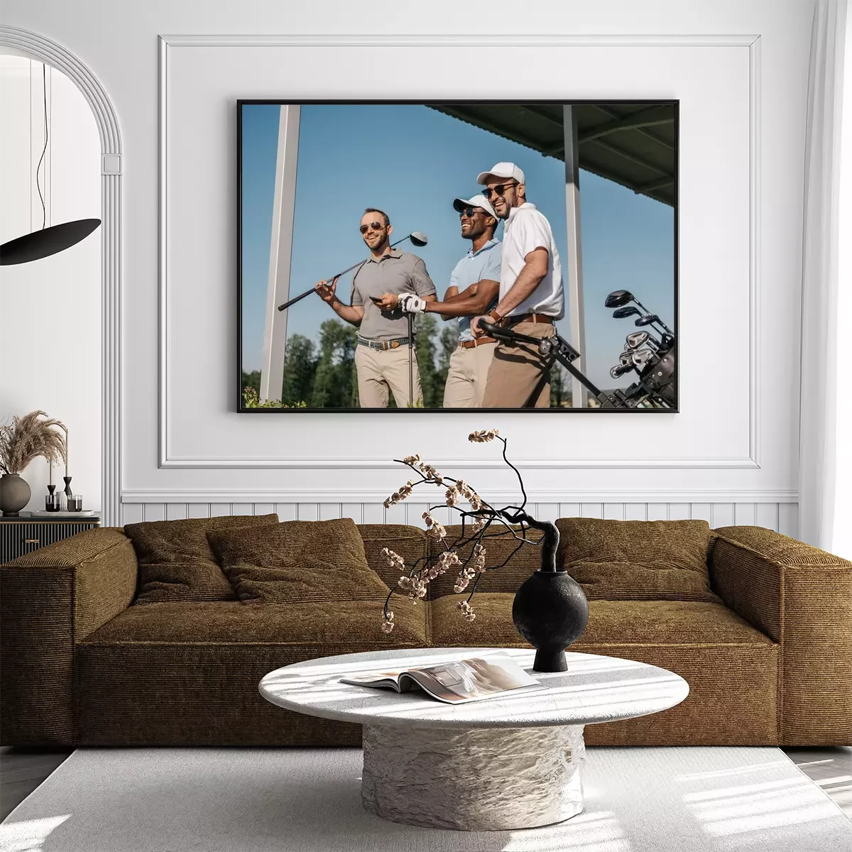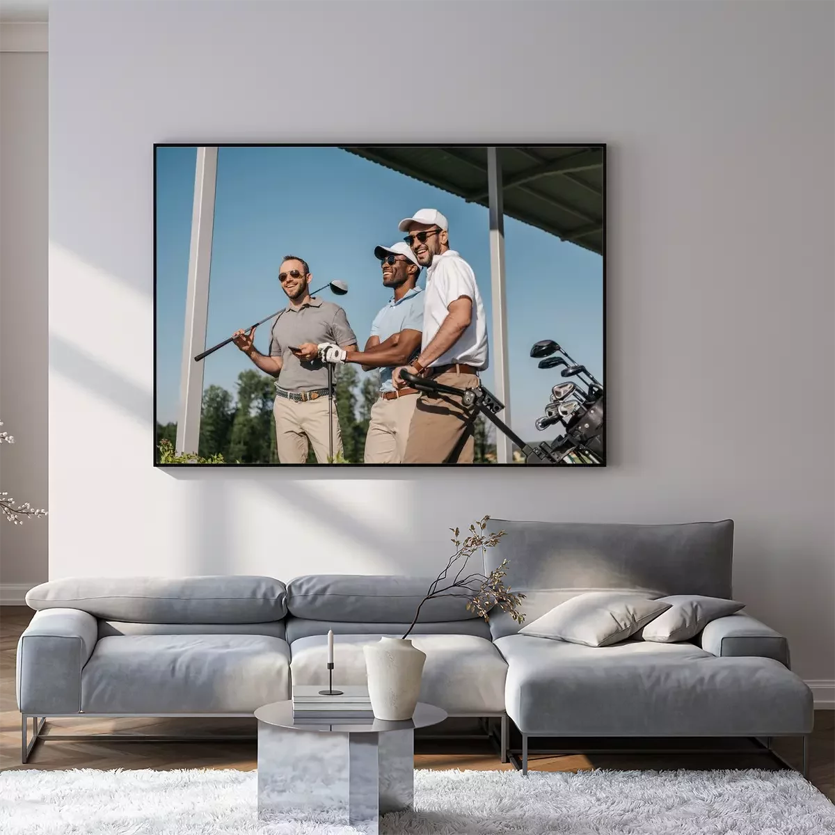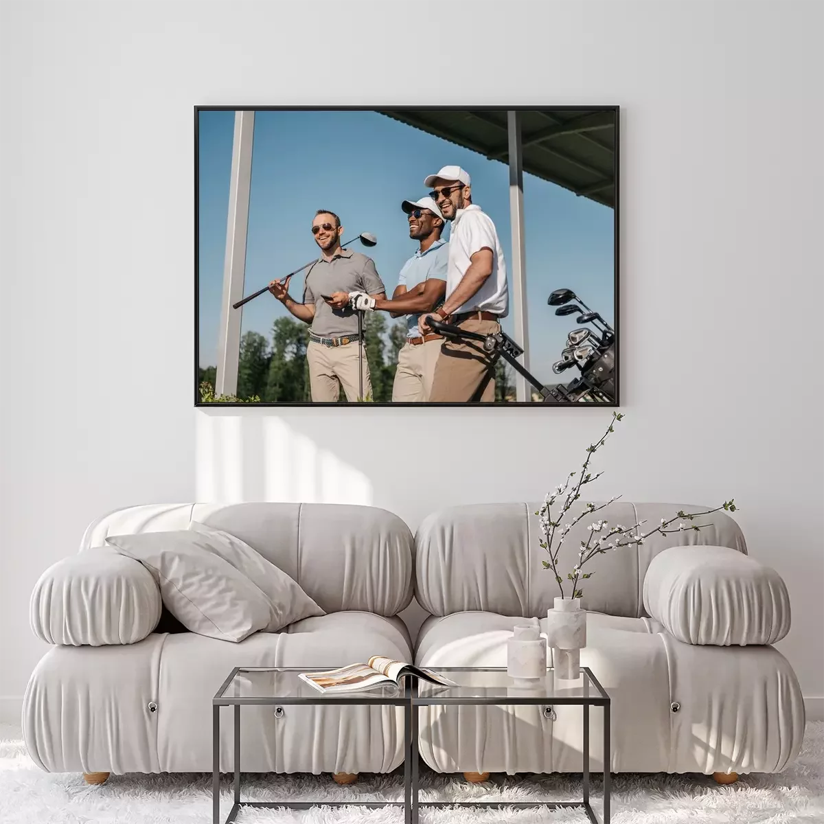 Poster : Trois hommes souriants dans des lunettes de soleil tenant des clubs de golf en plein air