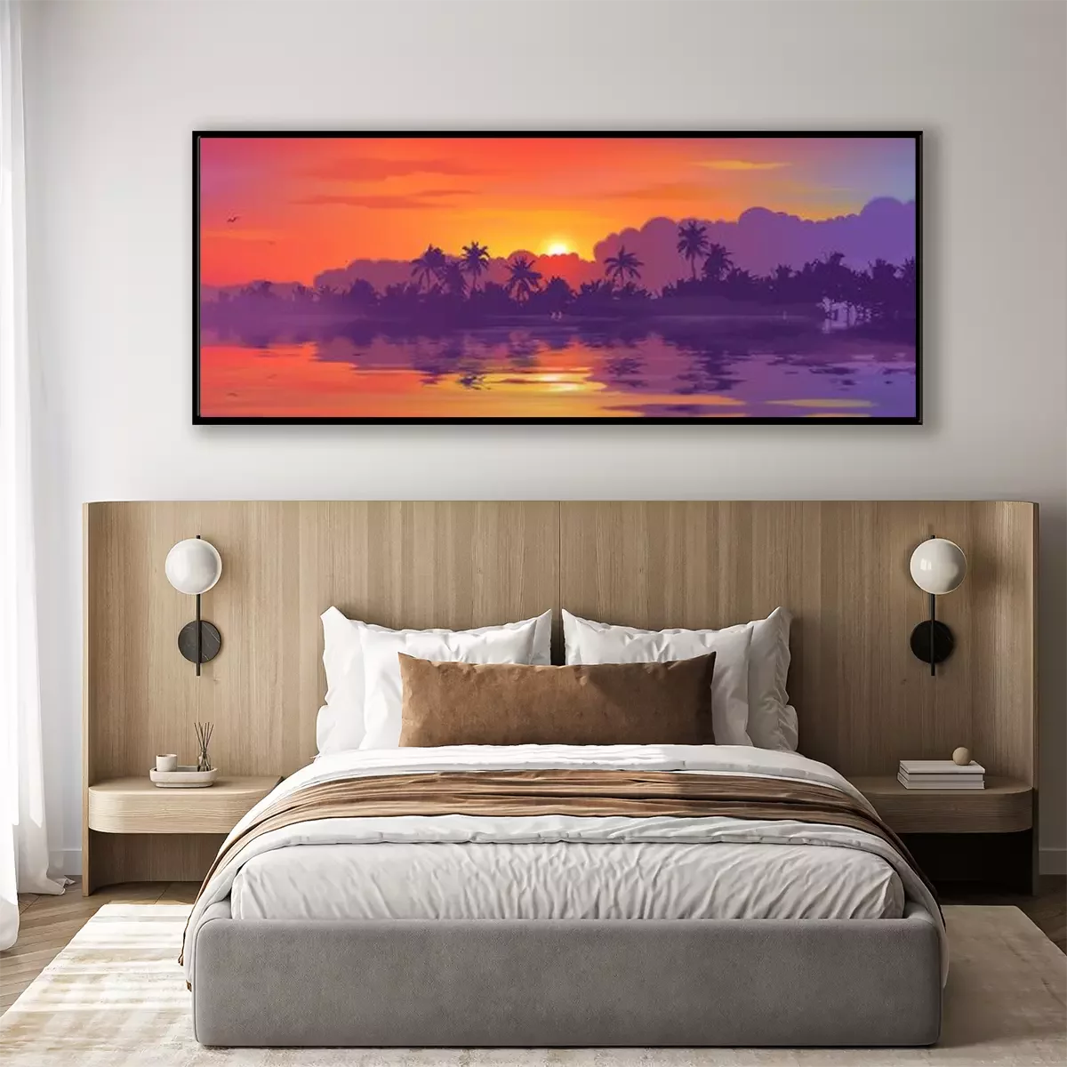 Bright colors sunset sky with sun reflection in lake with traditional fisherman asian boats silhouettes, vector banner illustration
