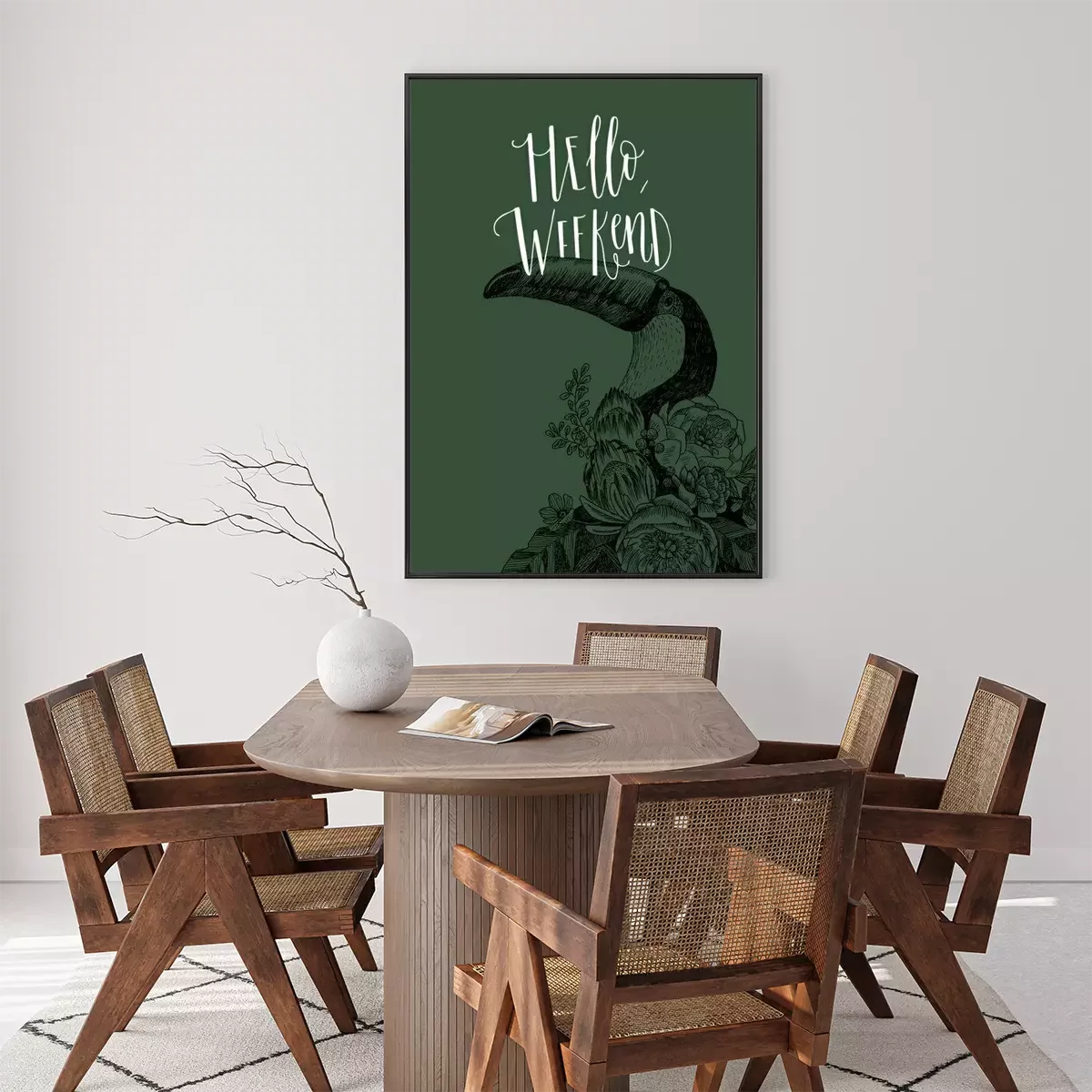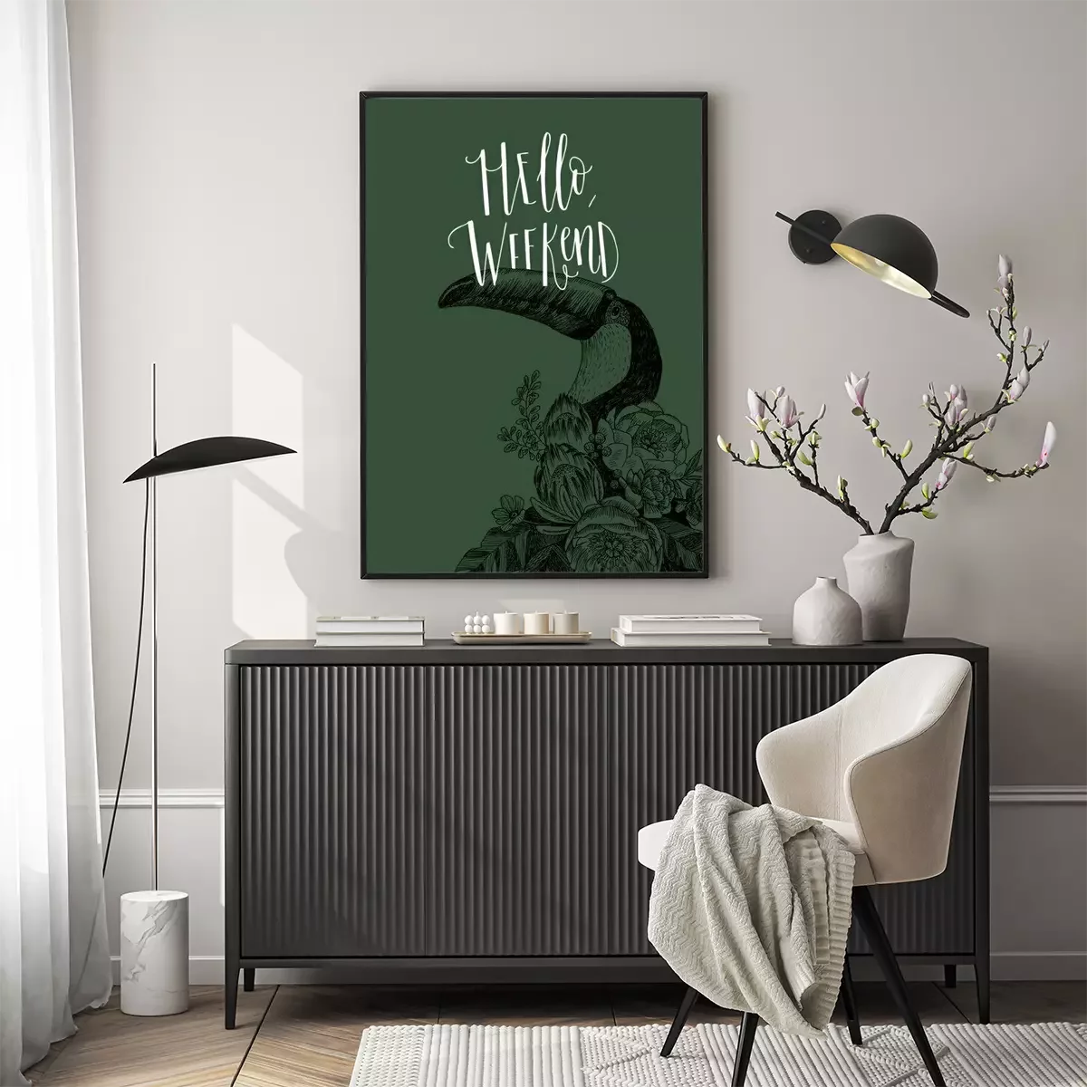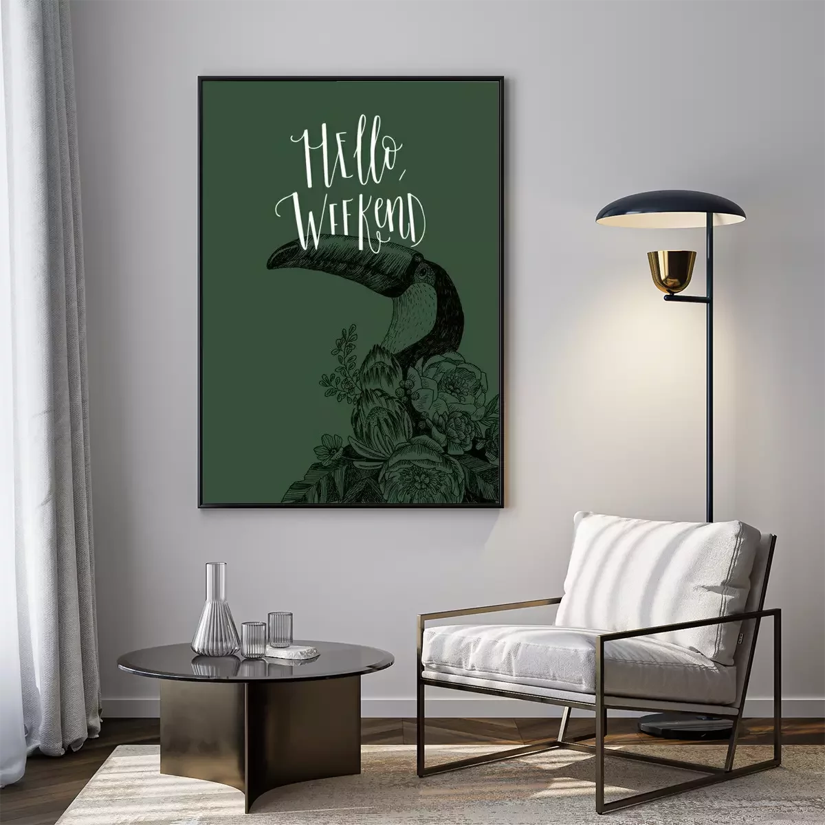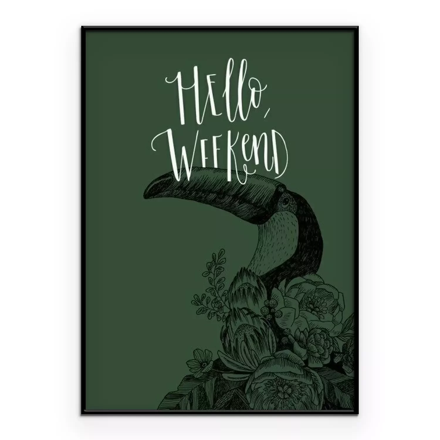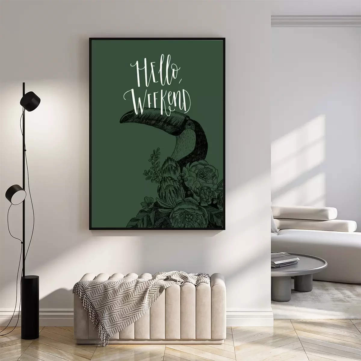 Poster : Tukan oiseau exotique avec fleurs épanouies et Bonjour, inscription du week-end. Invitation, élément décoratif de cartes postales. Concept tropical concept de fleur. Conception de vecteur