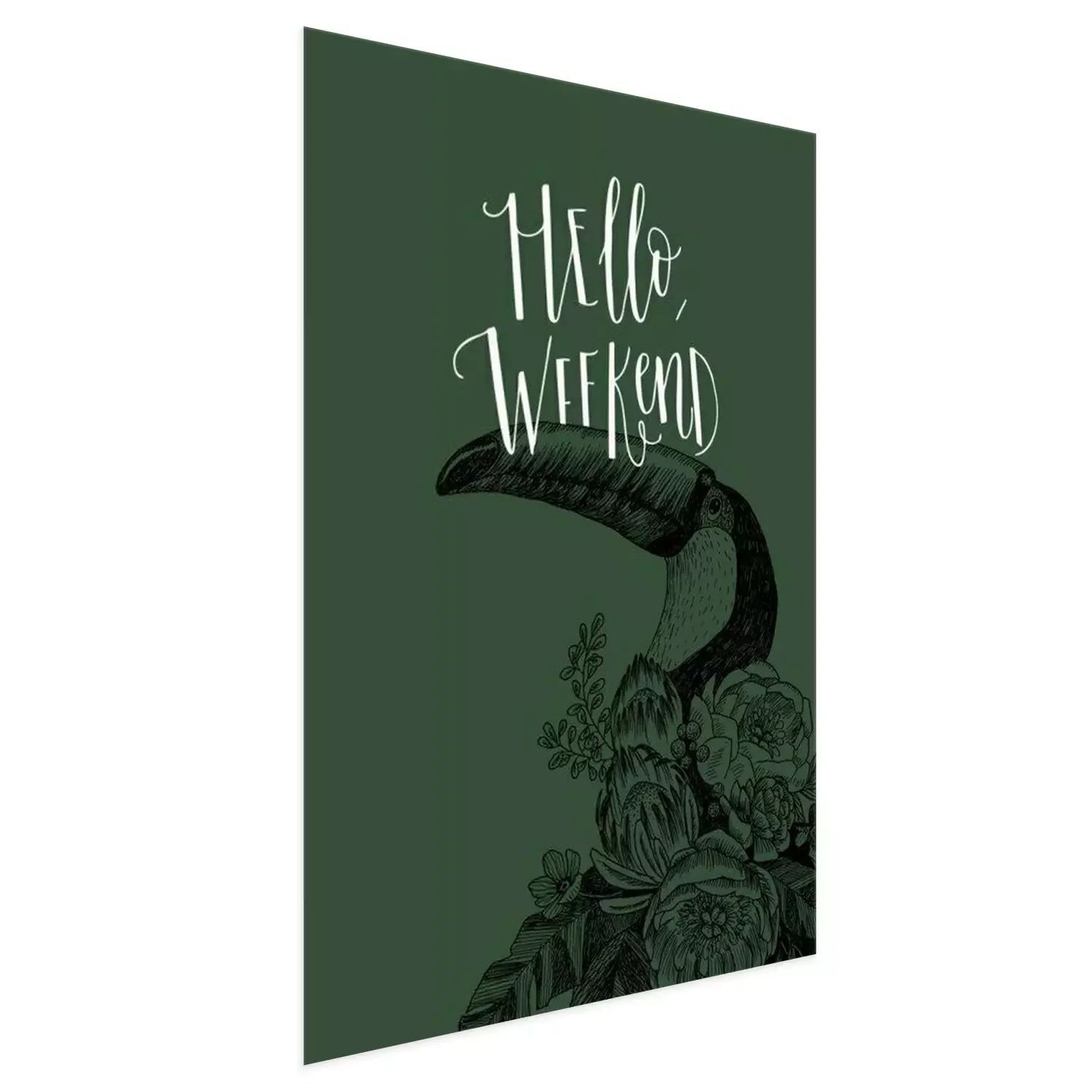 Poster  Tukan oiseau exotique avec fleurs épanouies et Bonjour, inscription du week-end. Invitation, élément décoratif de cartes postales. Concept tropical concept de fleur. Conception de vecteur