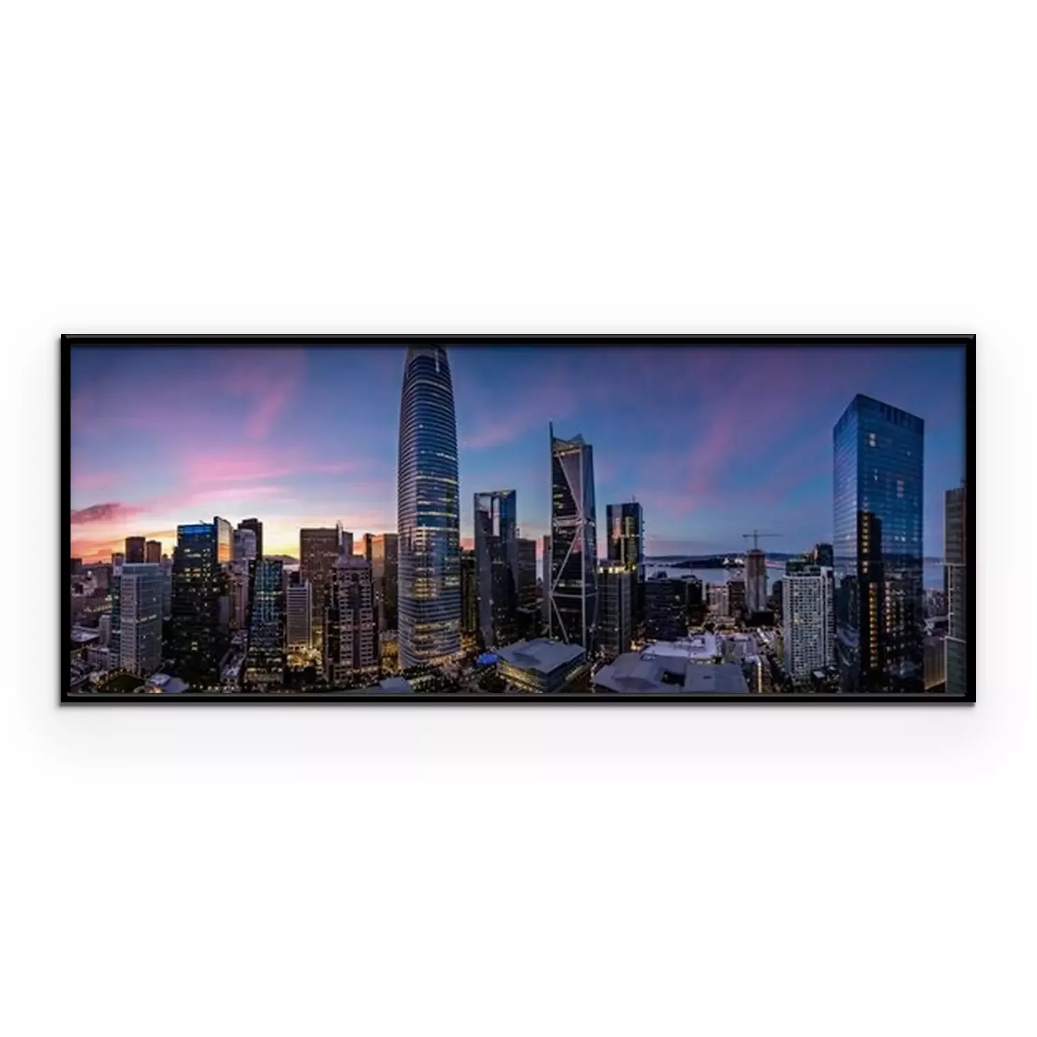 Poster  Twilight with a pink and blue sunset over San Francisco skyline with Salesforce Tower in the middle and Salesforce park at the bottom