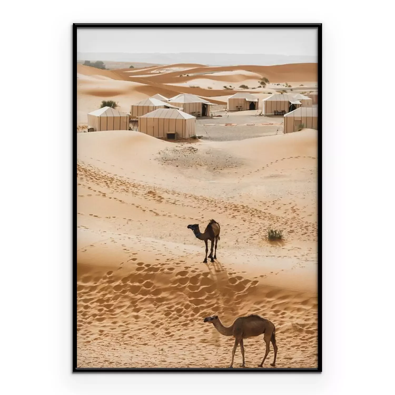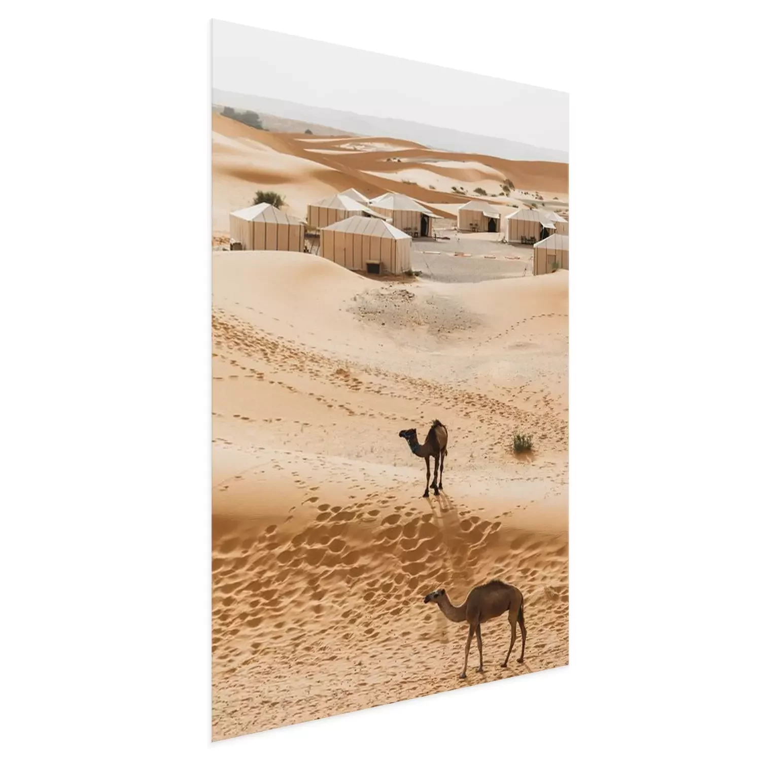 Poster  Two camels near contemporary luxury glamping camp in Morocco Sahara desert. Sand dunes around. Many white modern eco tents.