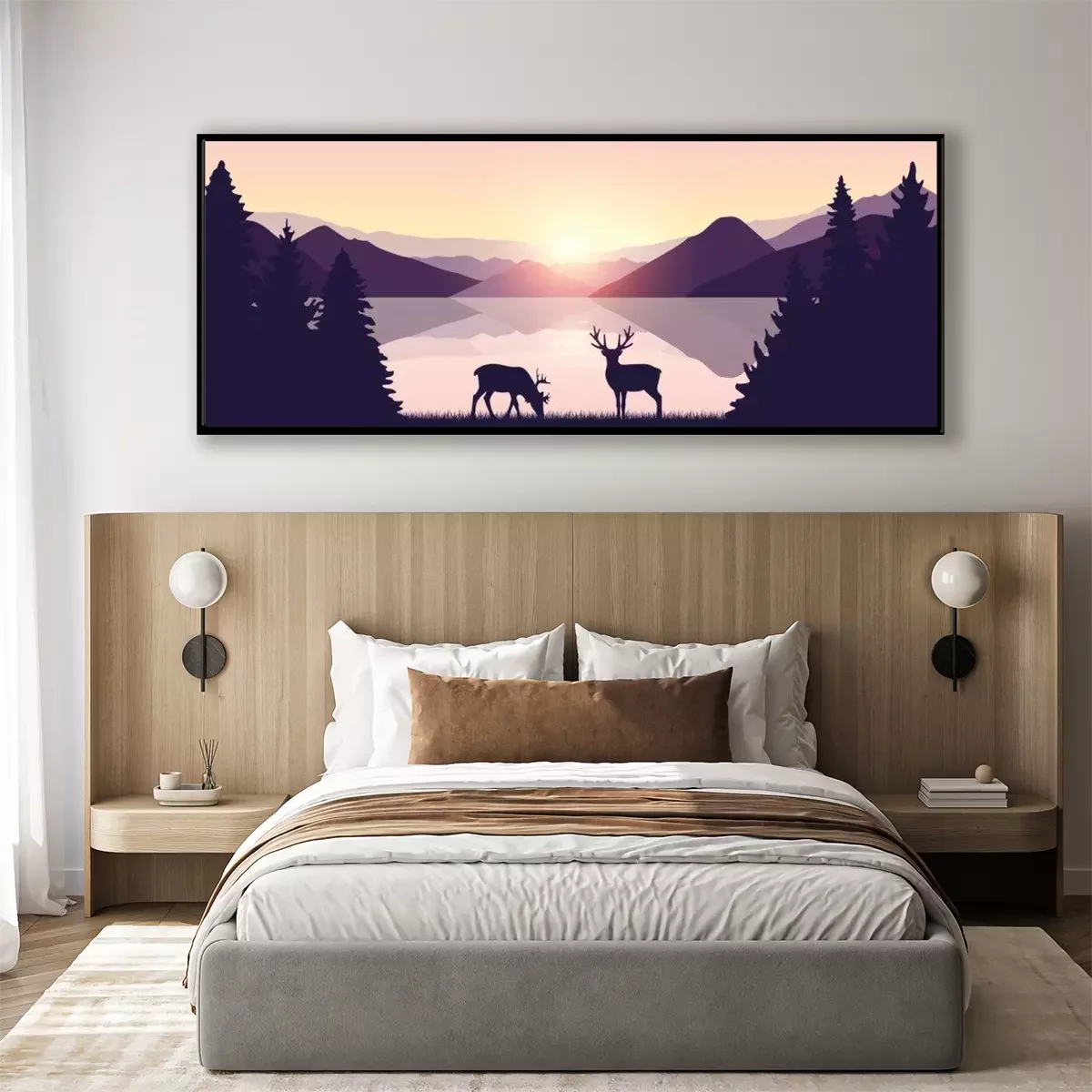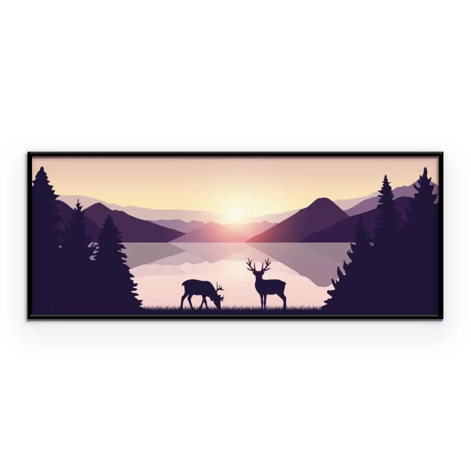 Poster : two reindeers by the lake at sunrise wildlife nature landscape vector illustration EPS10