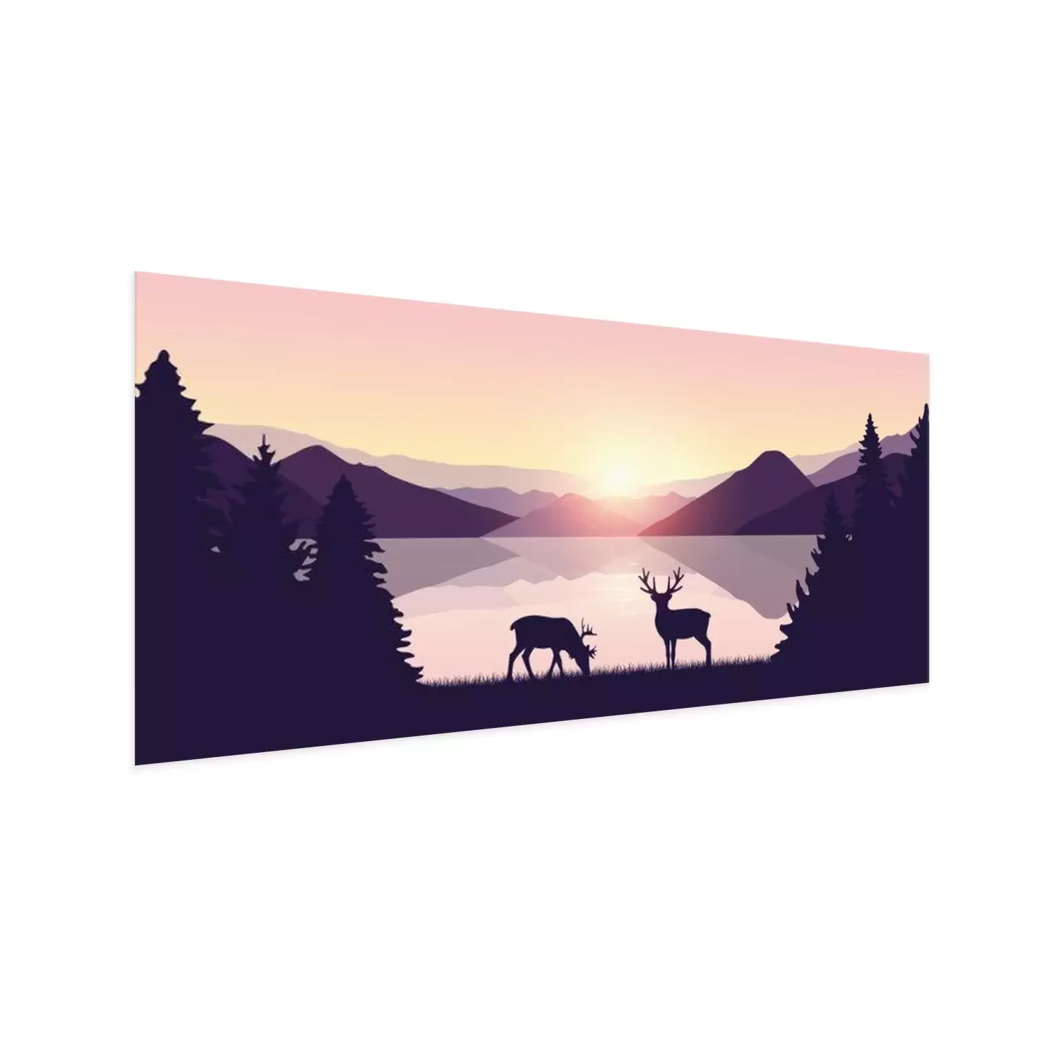 Poster  two reindeers by the lake at sunrise wildlife nature landscape vector illustration EPS10