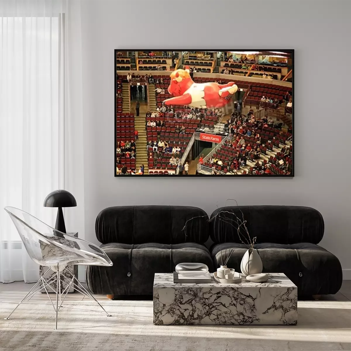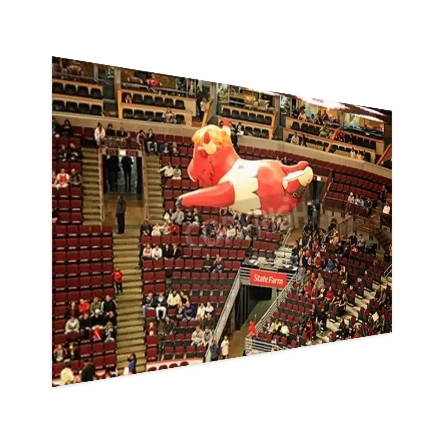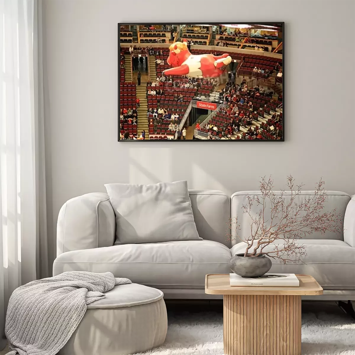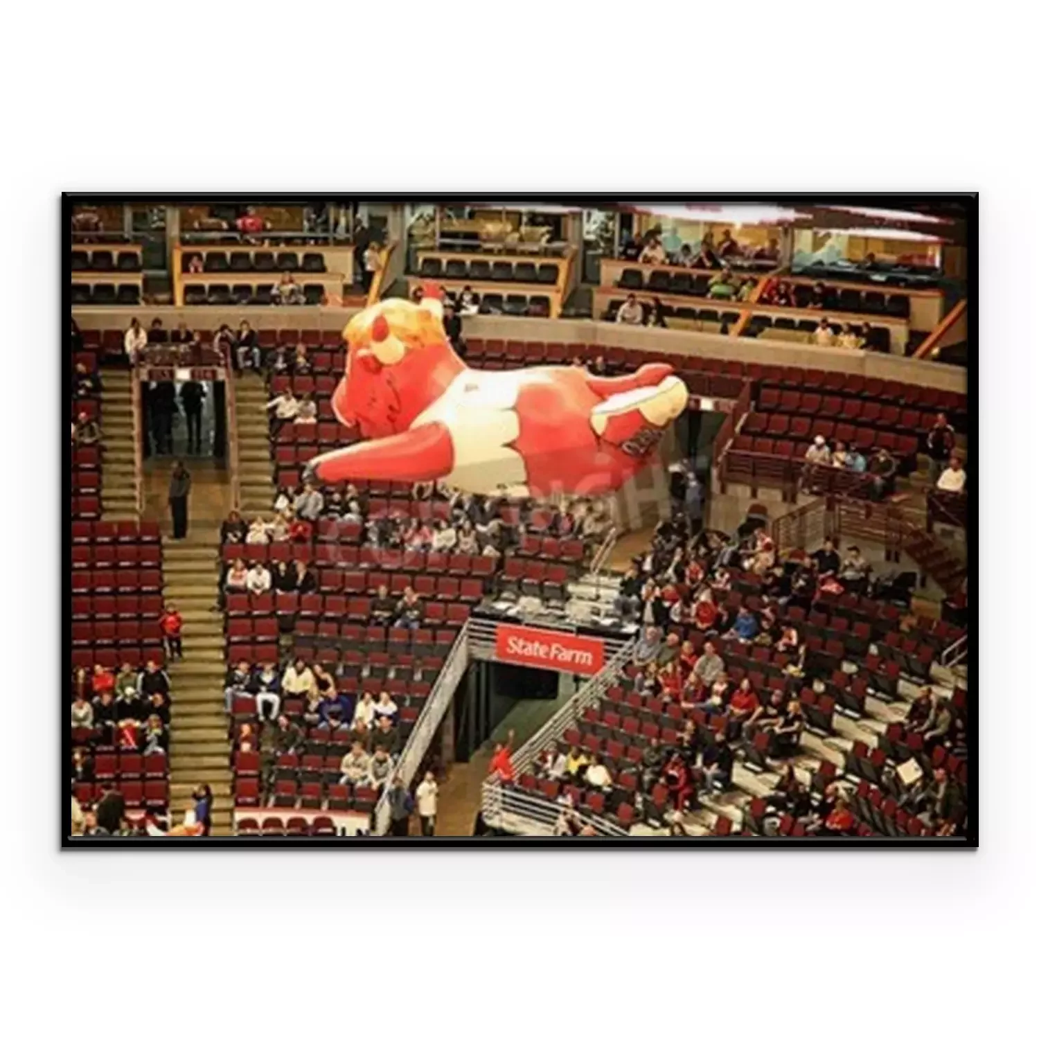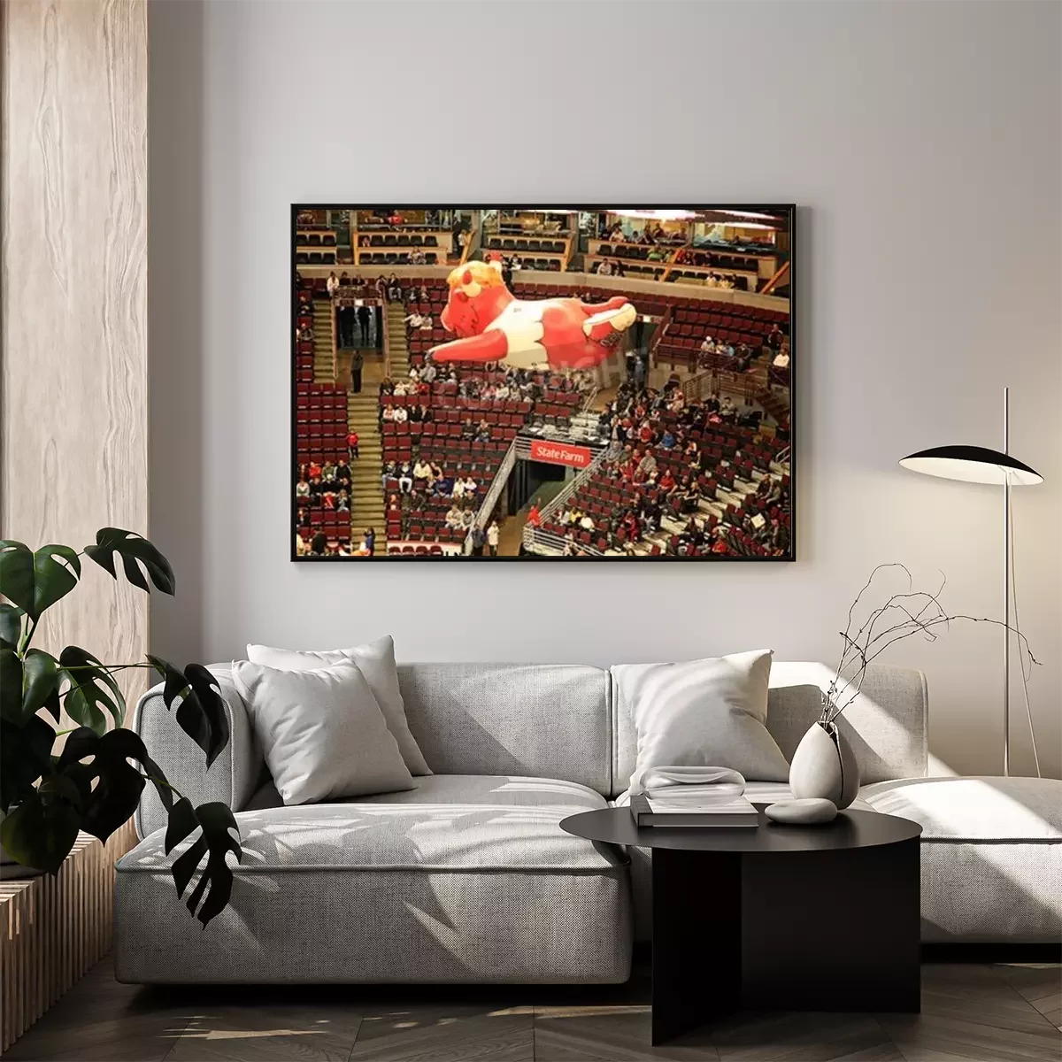 Poster  Un ballonnet gonflable de Benny Bull, communément connu sous le nom de Benny, la mascotte officielle des Chicago Bulls de la National Basketball Association, planant au-dessus de la NBA United Center,