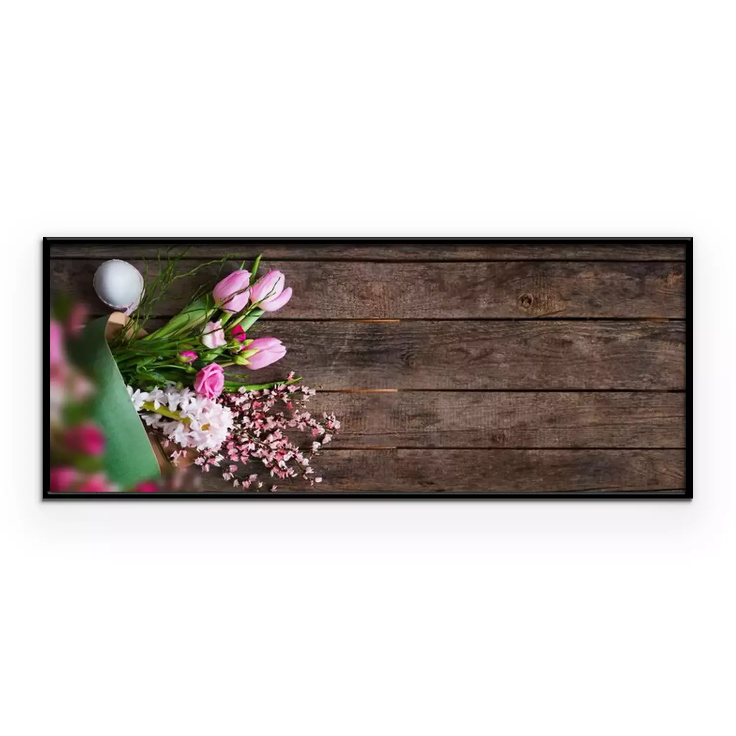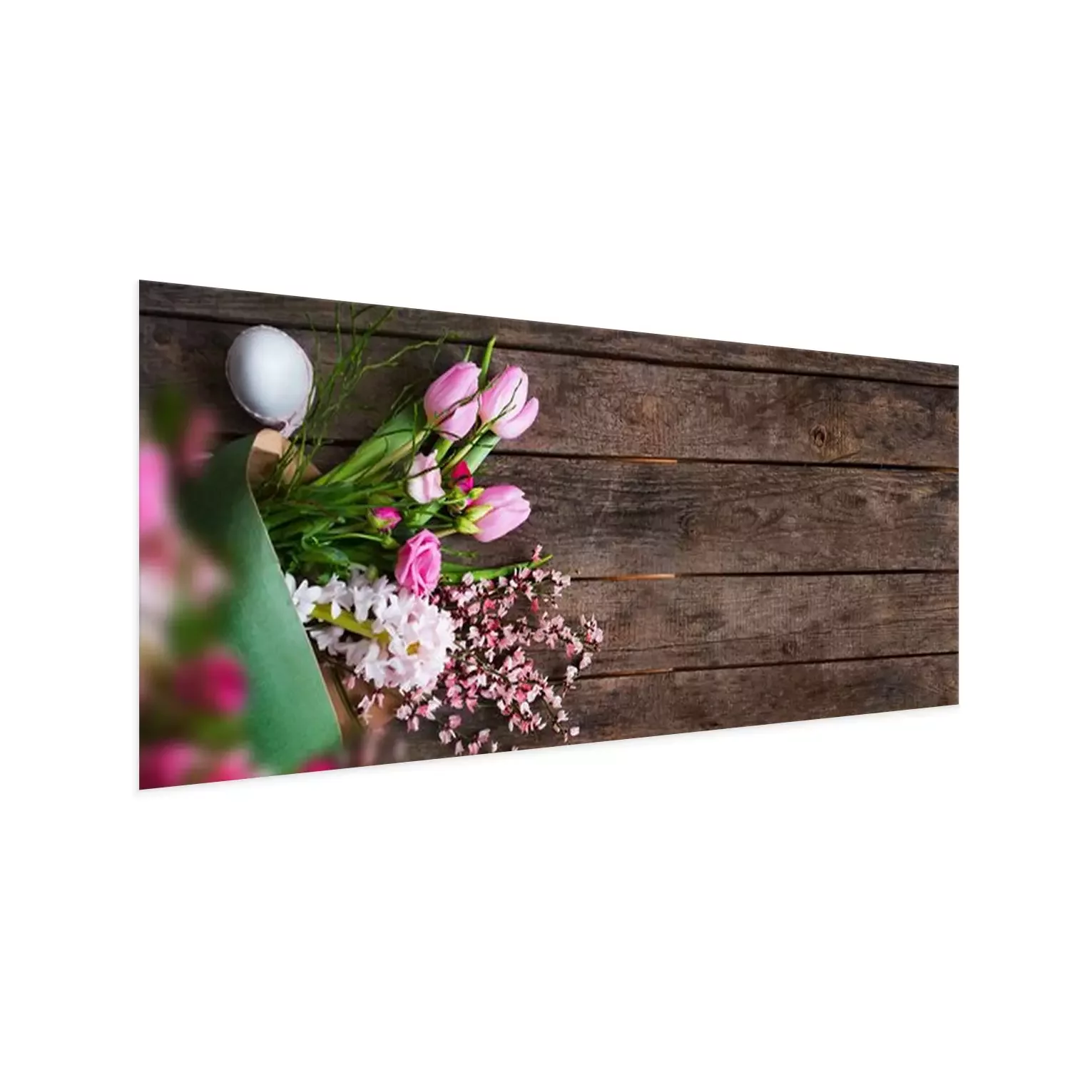 Poster  Un bouquet de fleurs printanières sur des planches en bois