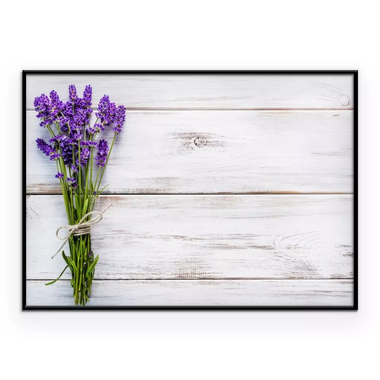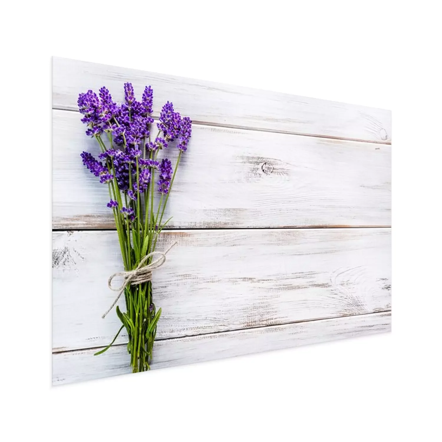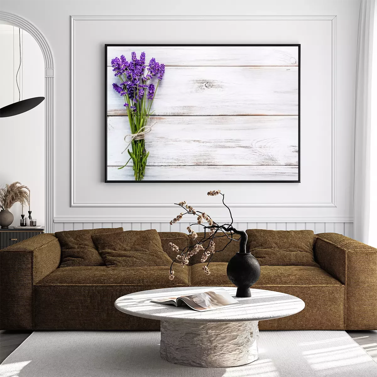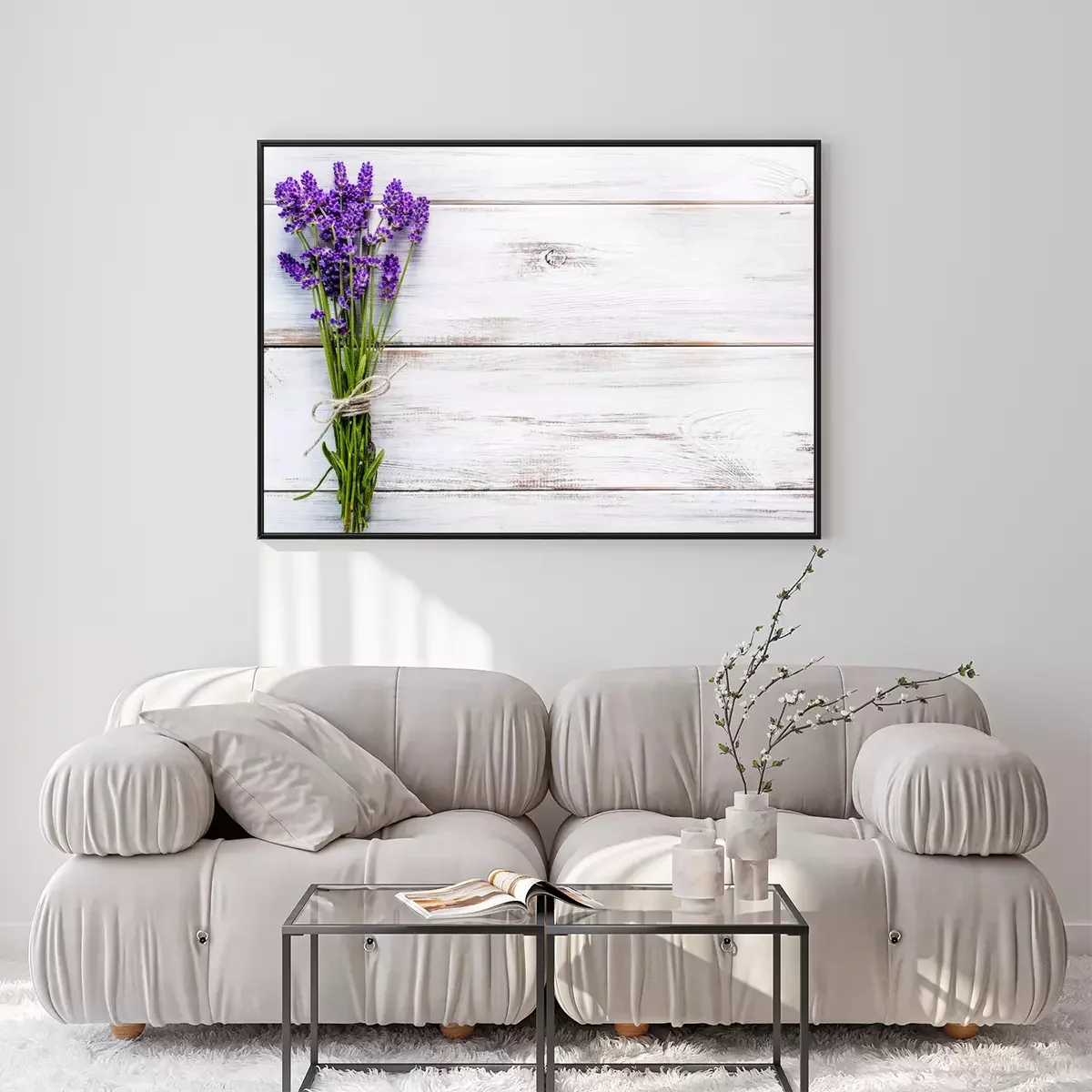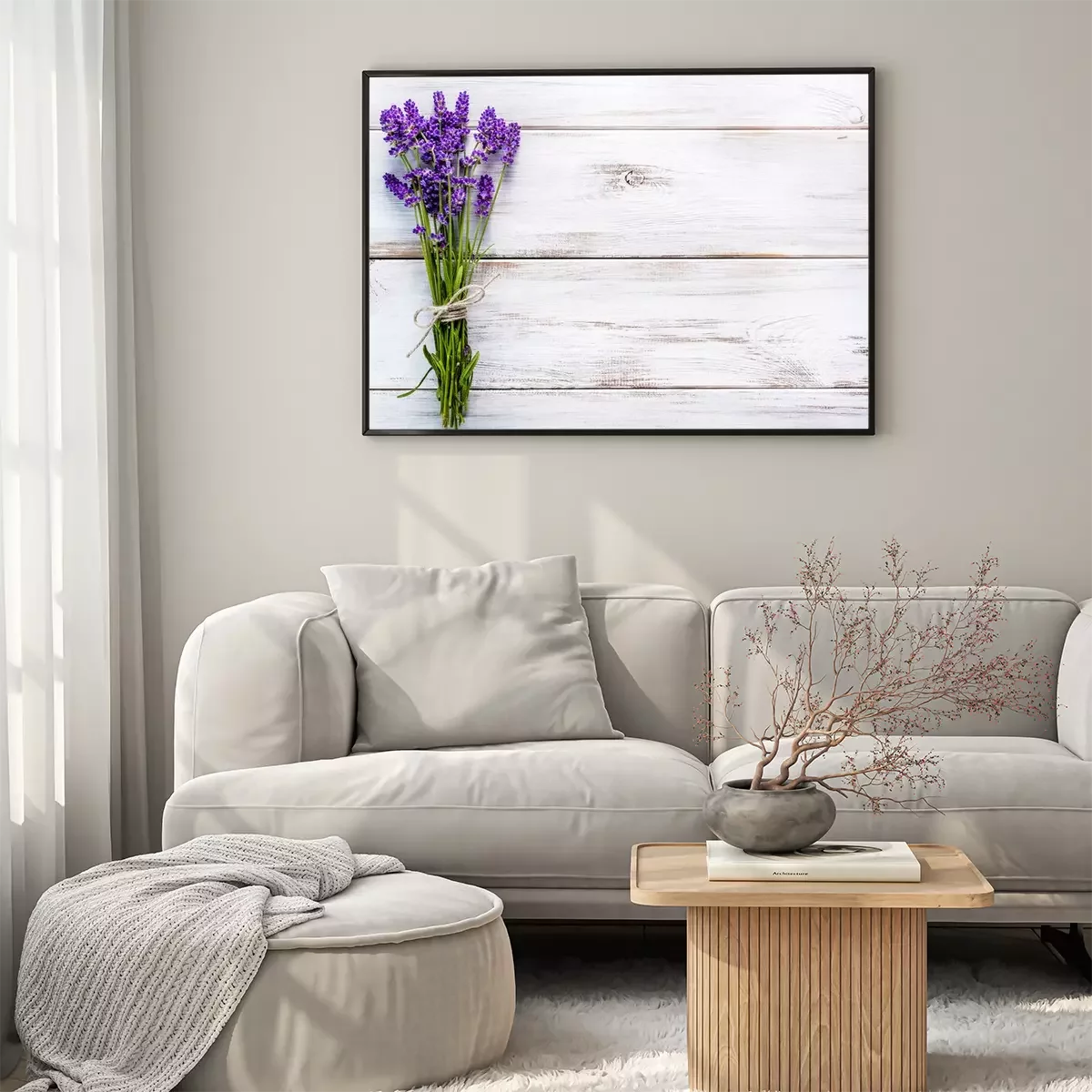 Poster : Un bouquet de lavande sur des planches blanchies à la chaux