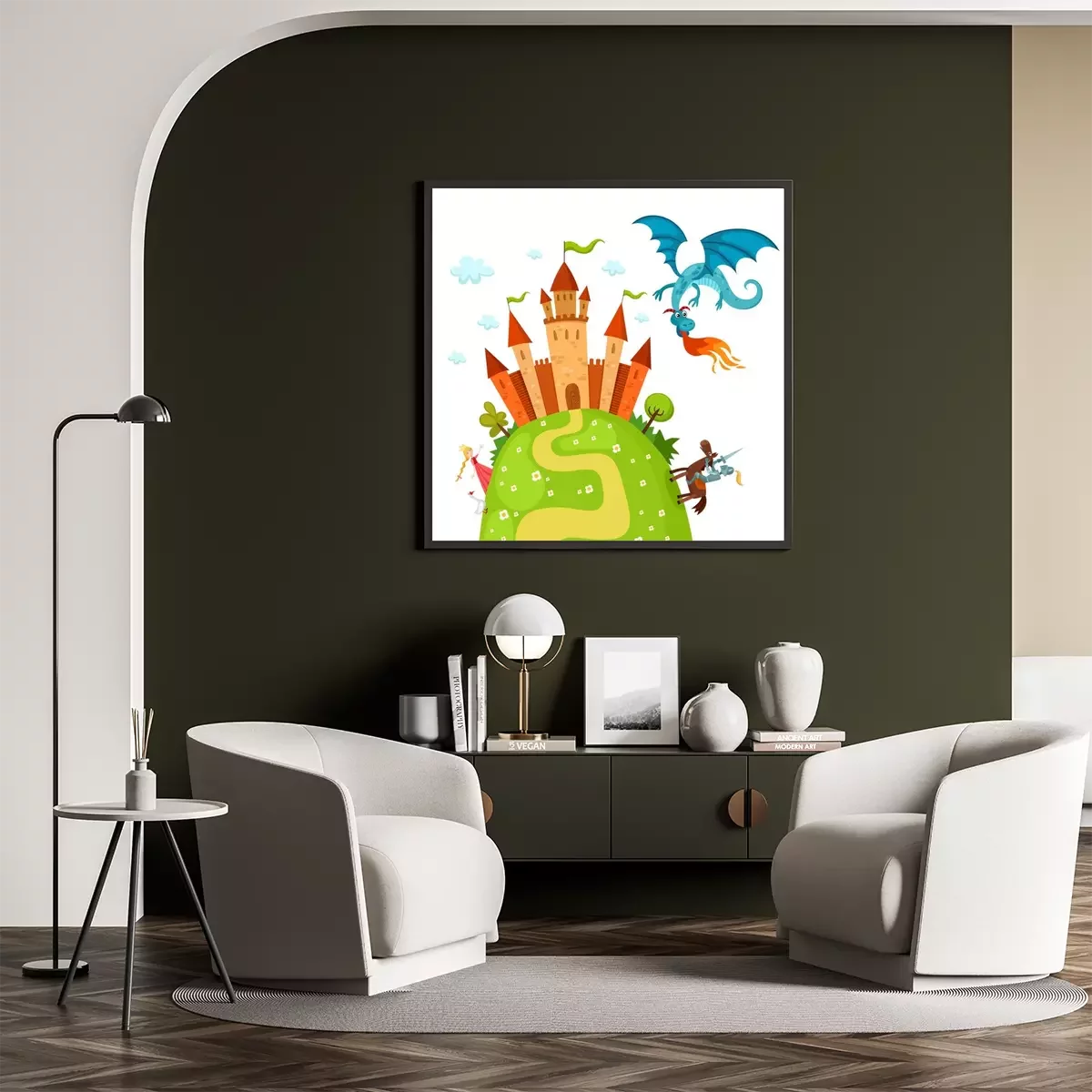 Un chevalier avançant sur une illustration de conte de fées de dragon