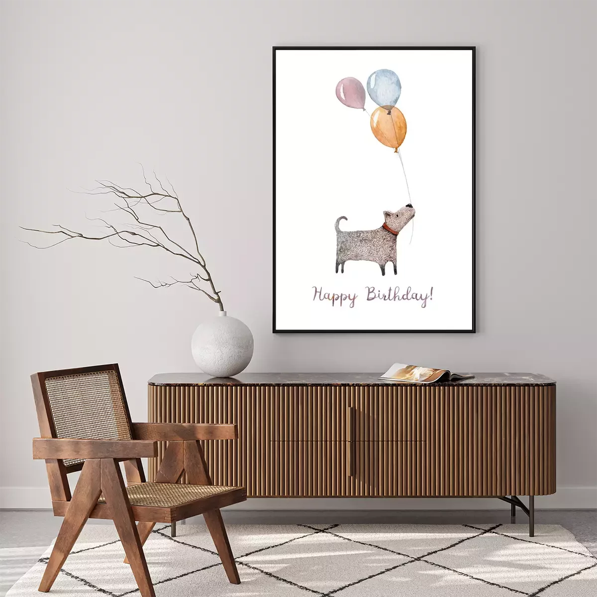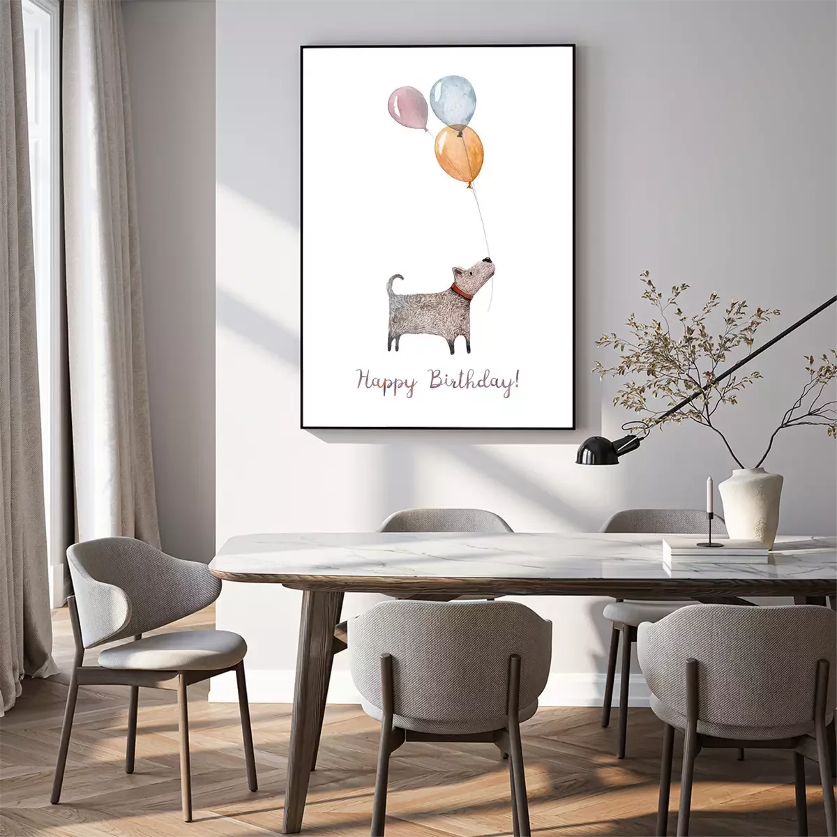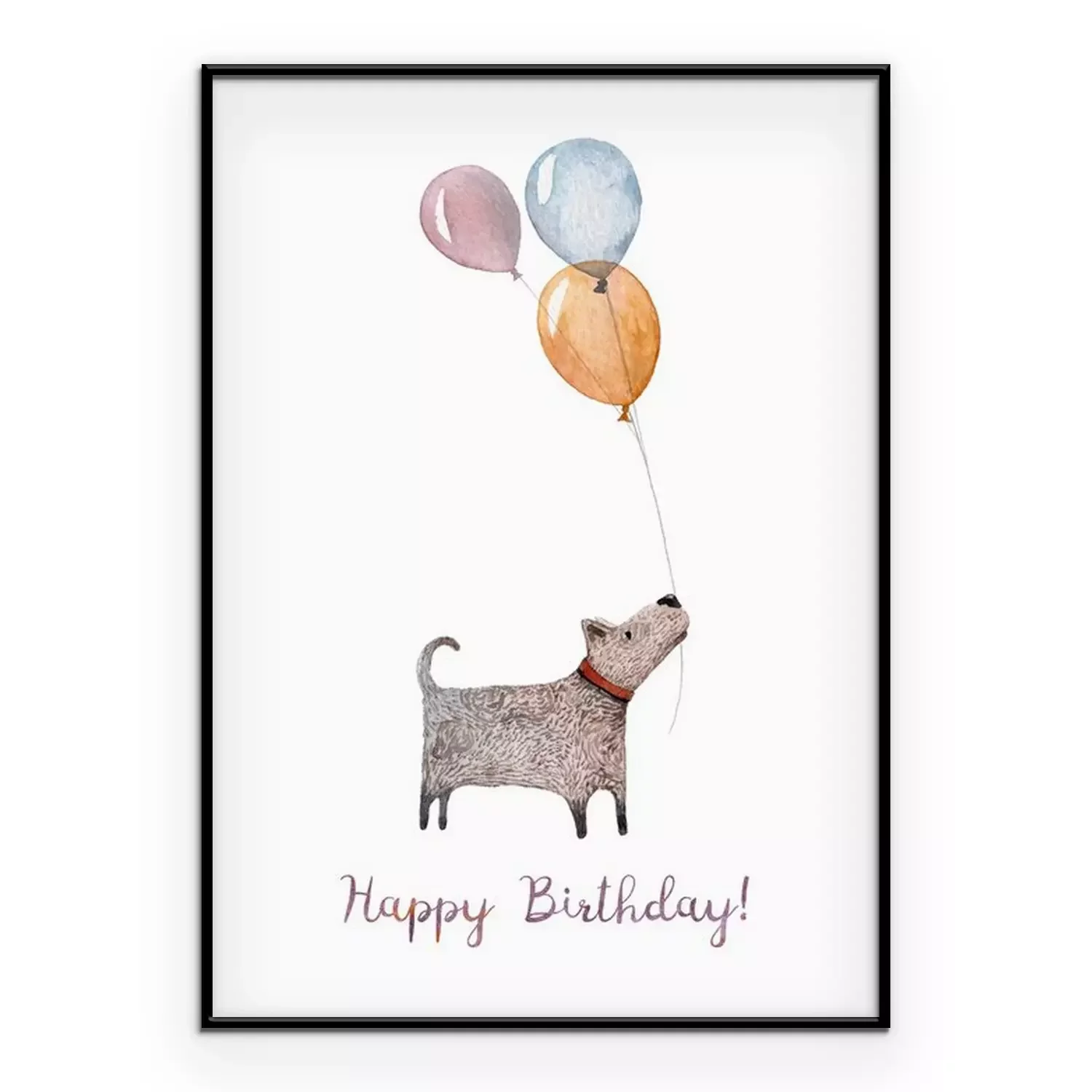 Poster  Un chien tenant trois ballons colorés dans sa bouche