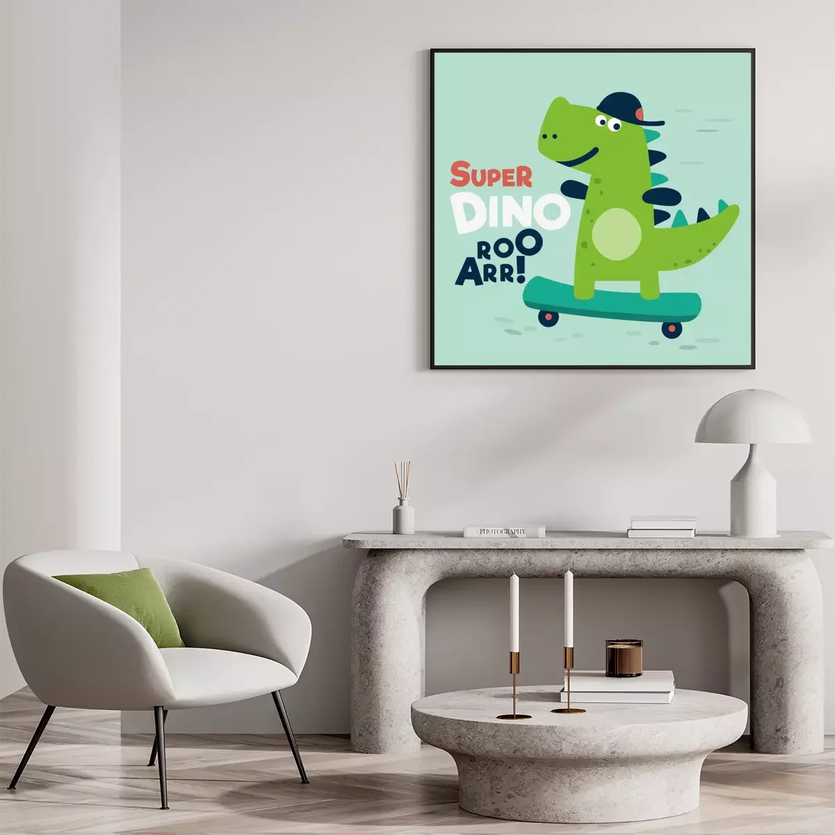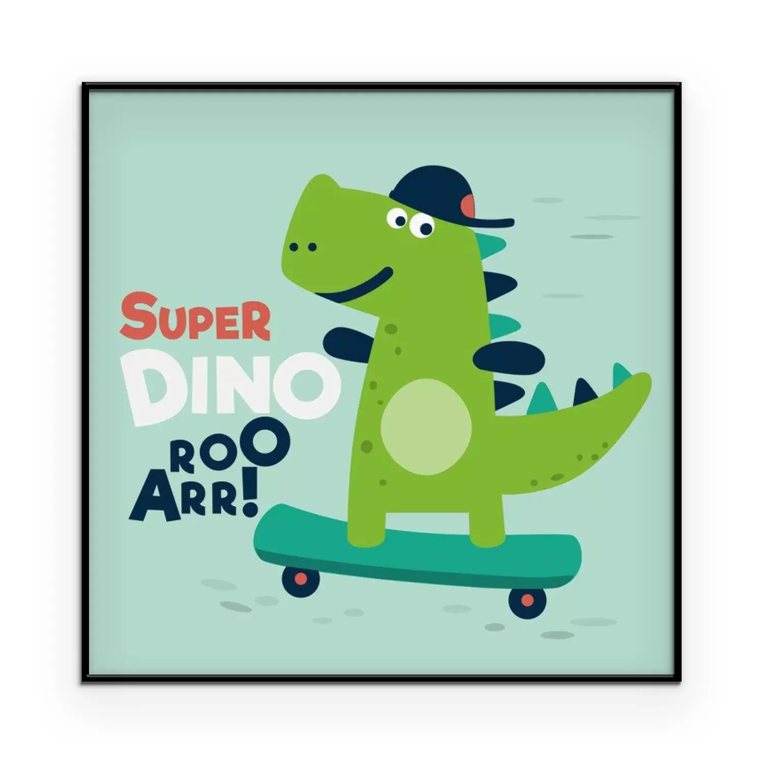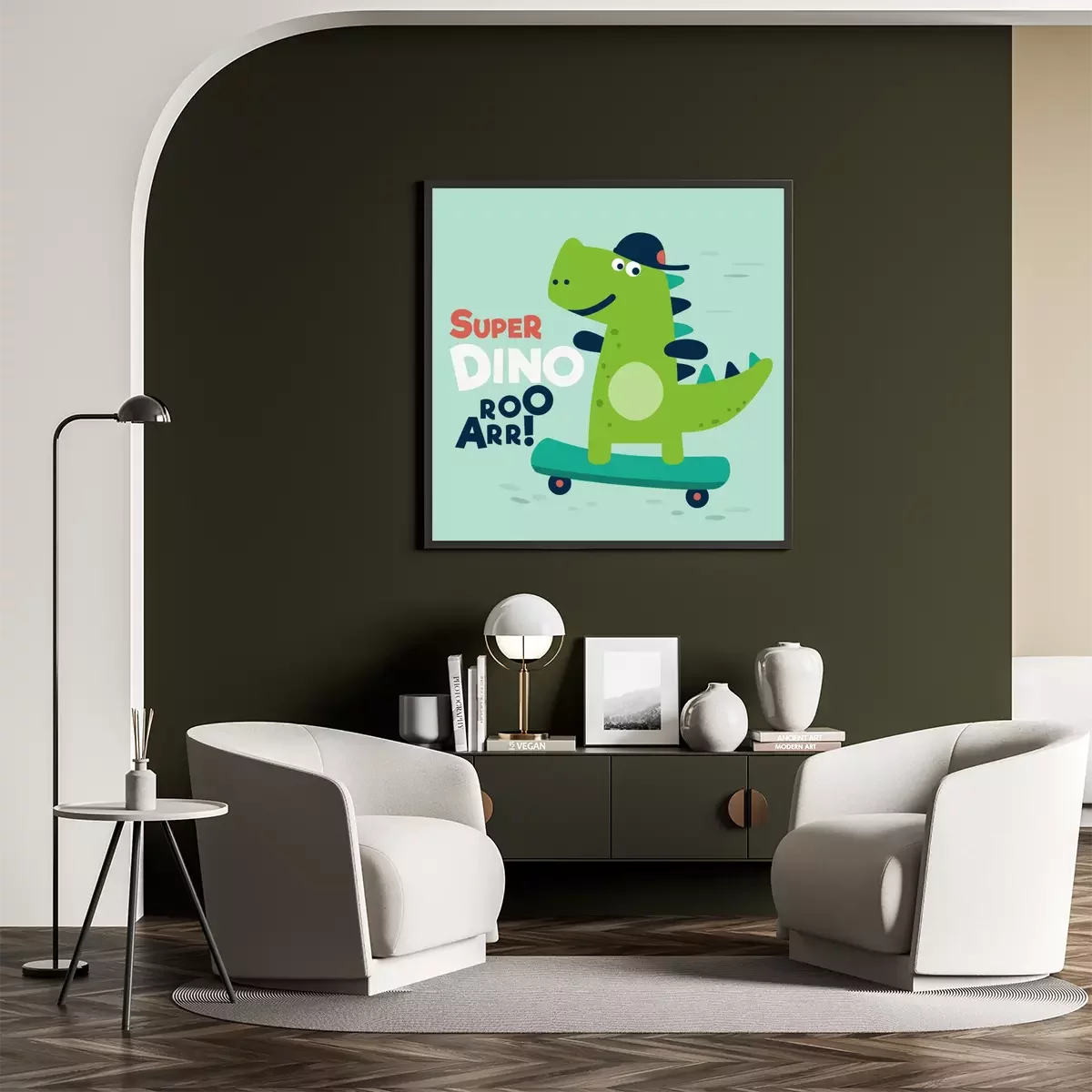 Poster : Un dinosaure dans une casquette de baseball sur une planche à roulettes