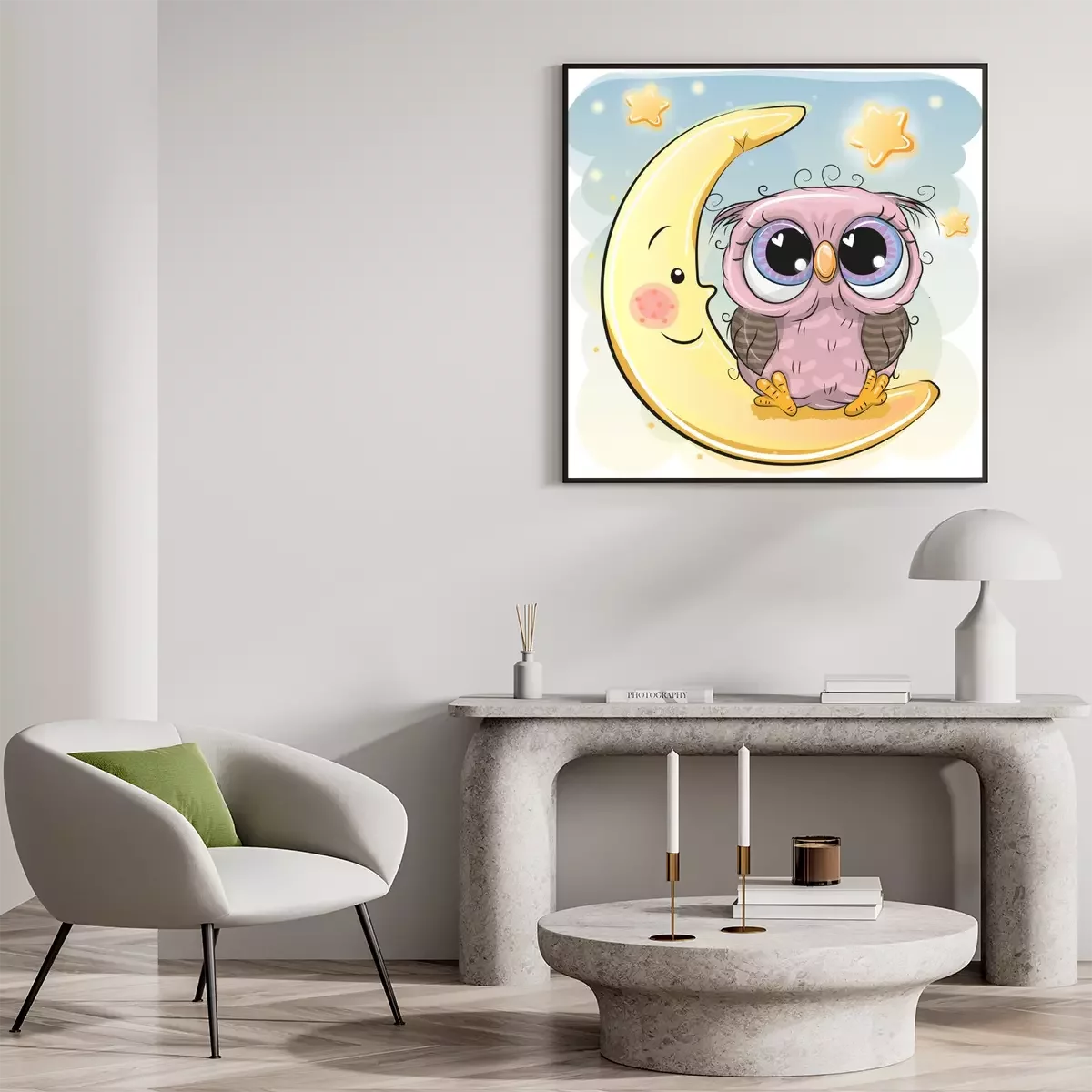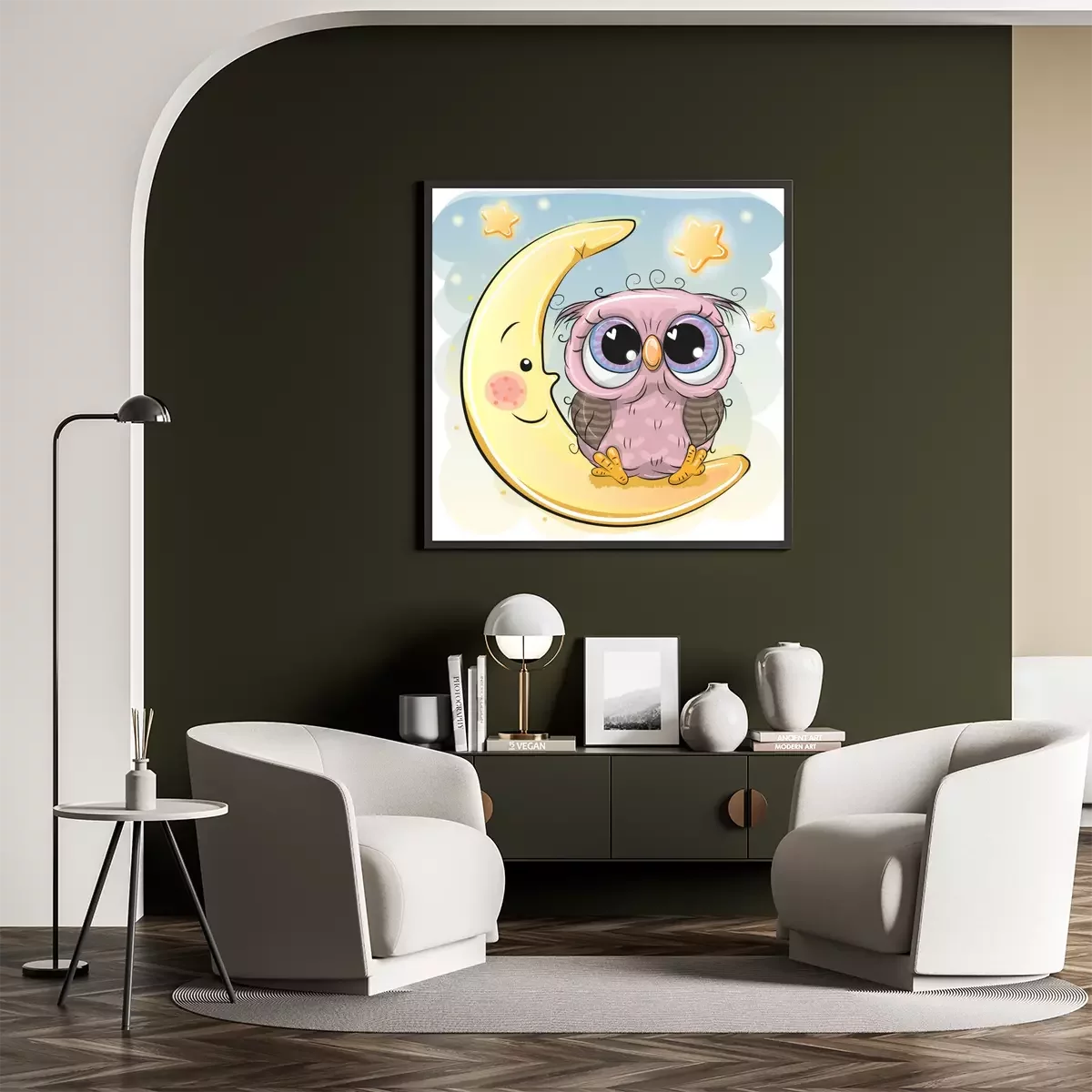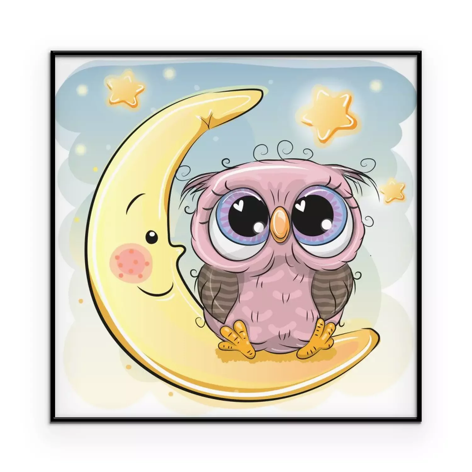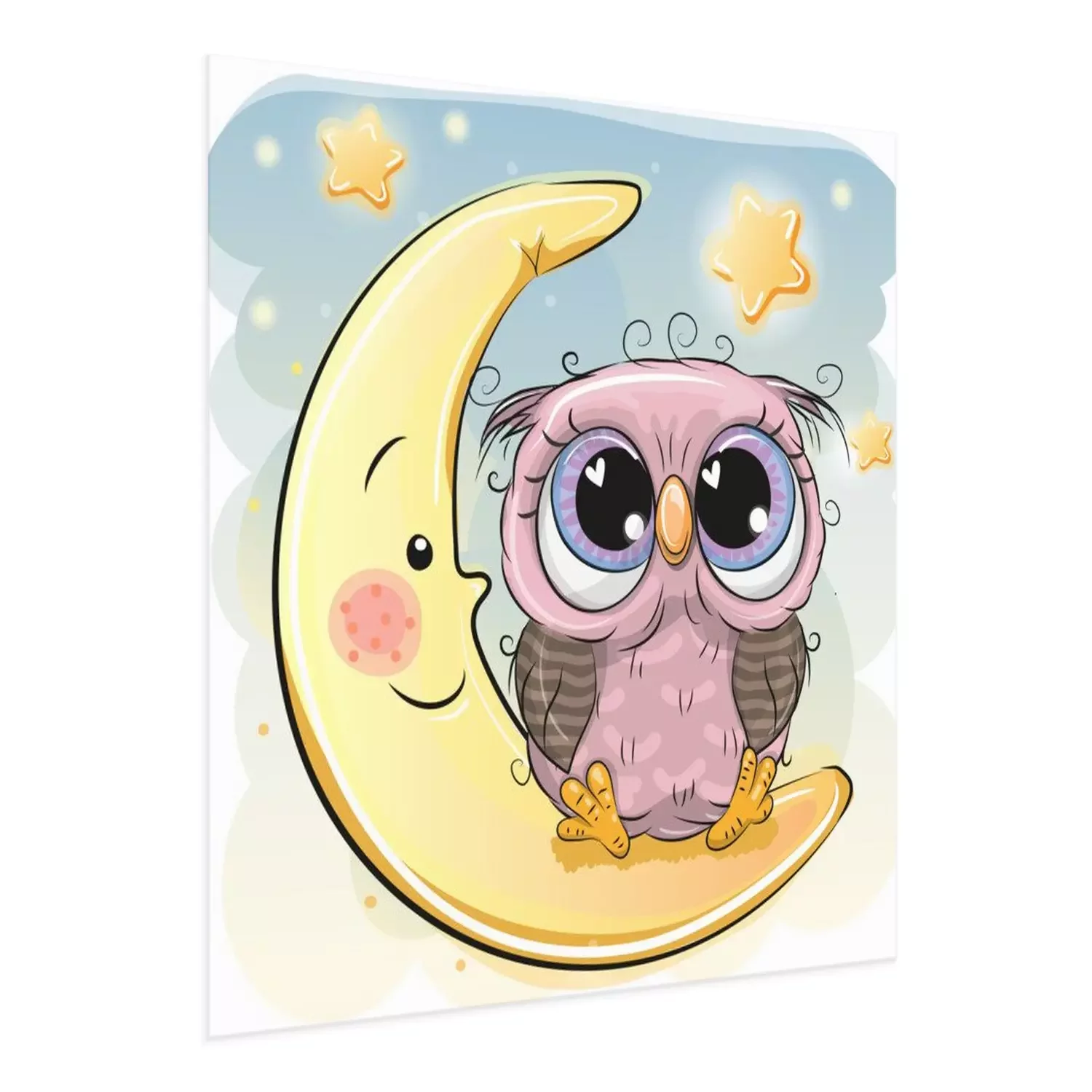 Poster : Un hibou assis sur une lune souriante