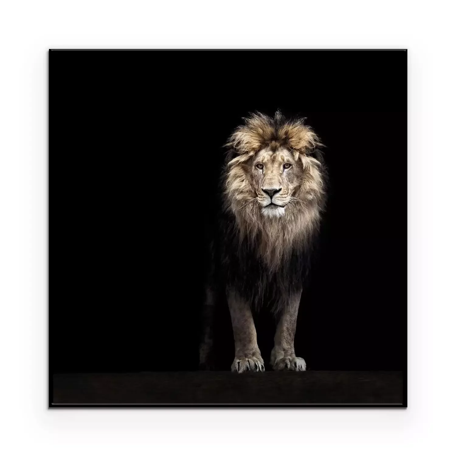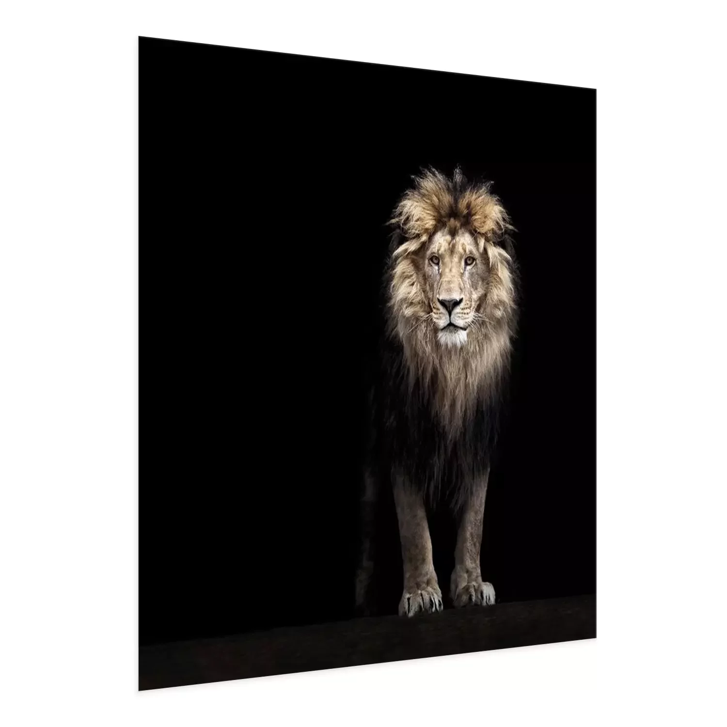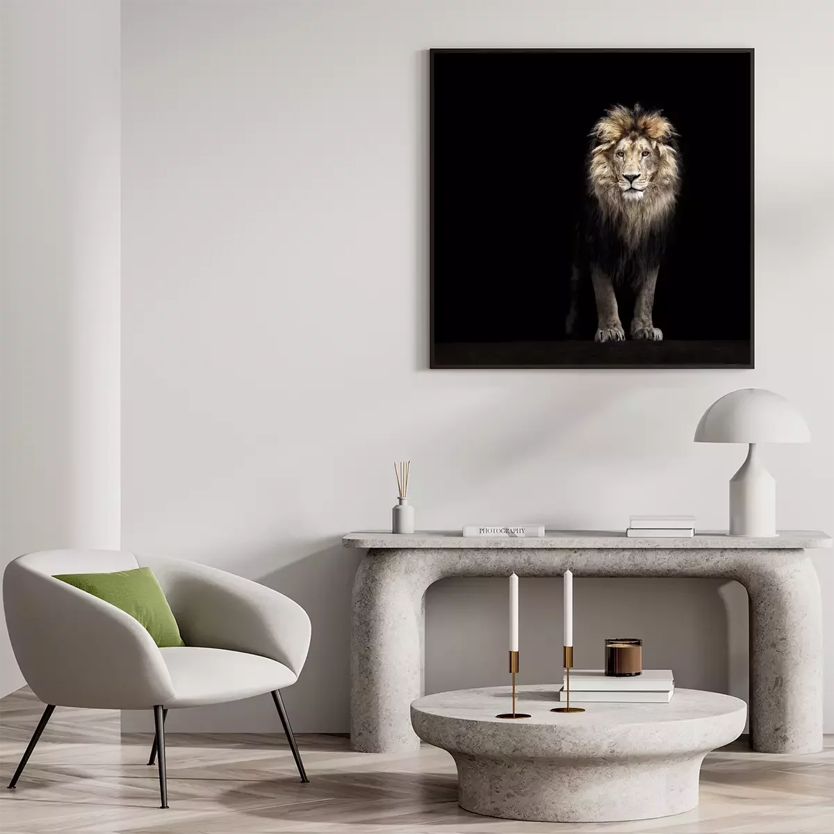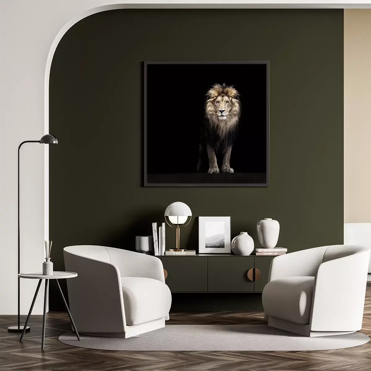 Magnifique lion près d'un point d'eau sur un fond noir.
