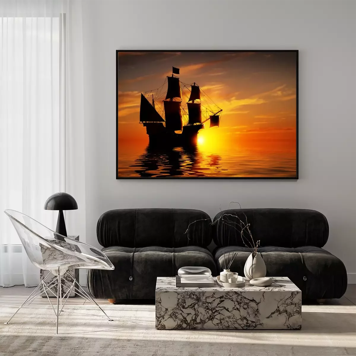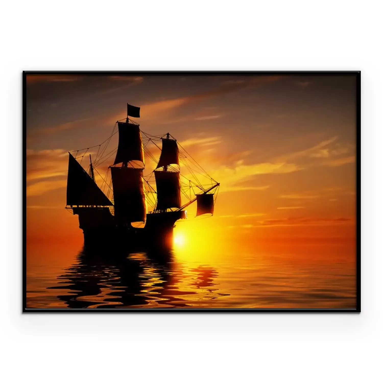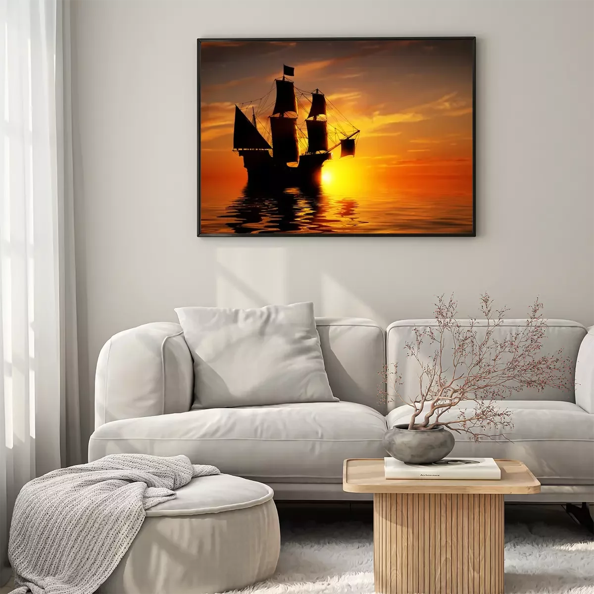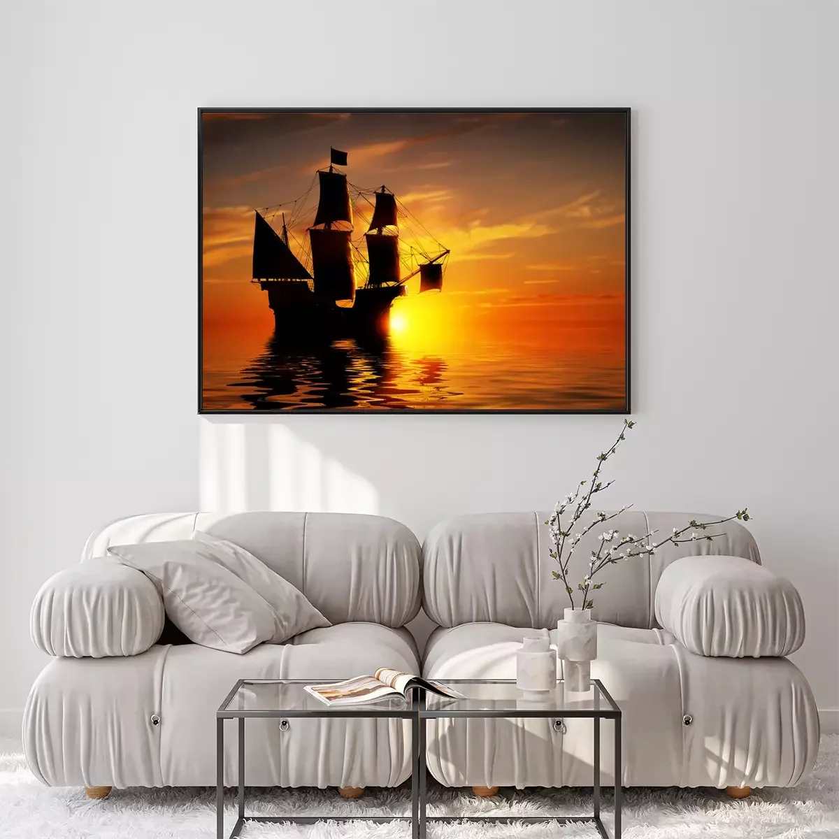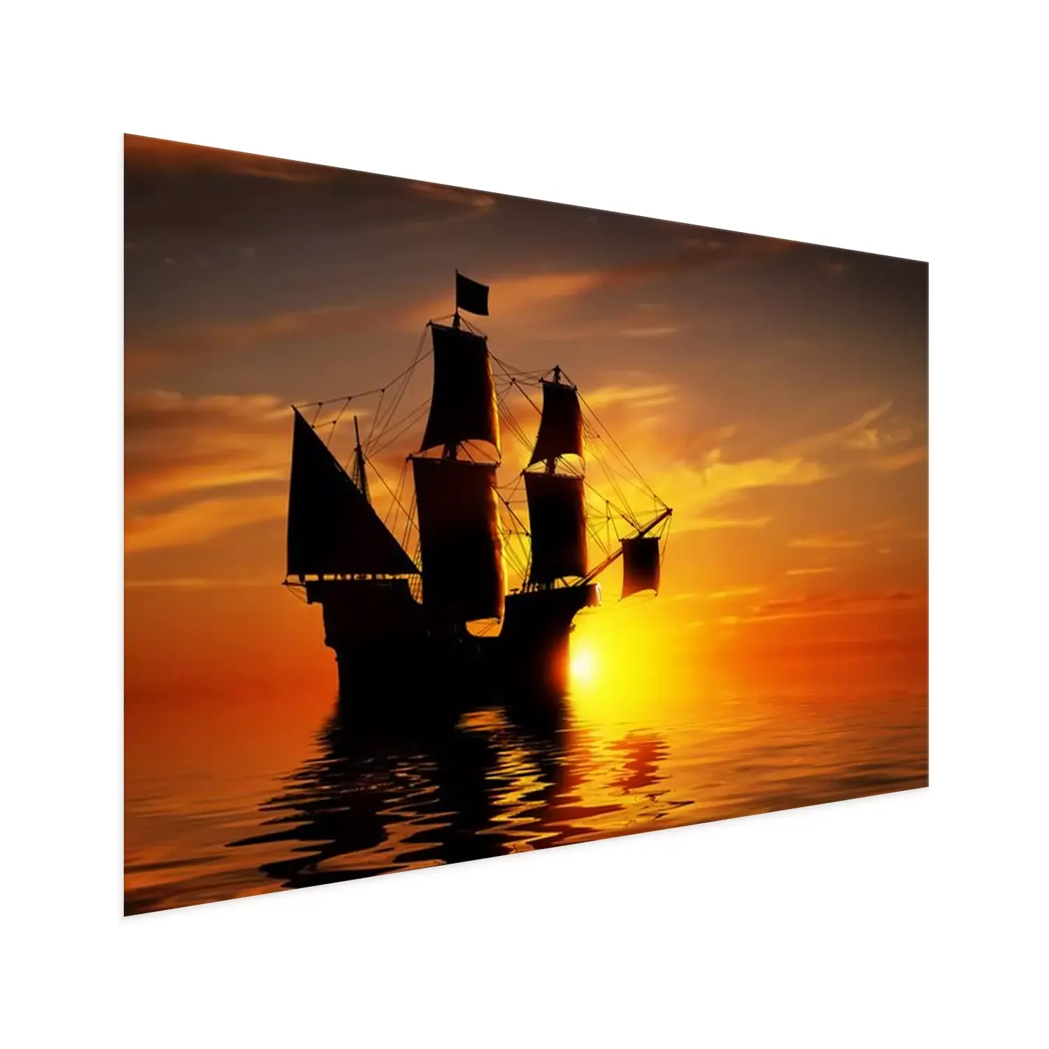 Pirate antique navire naviguant sur l'océan au coucher du soleil