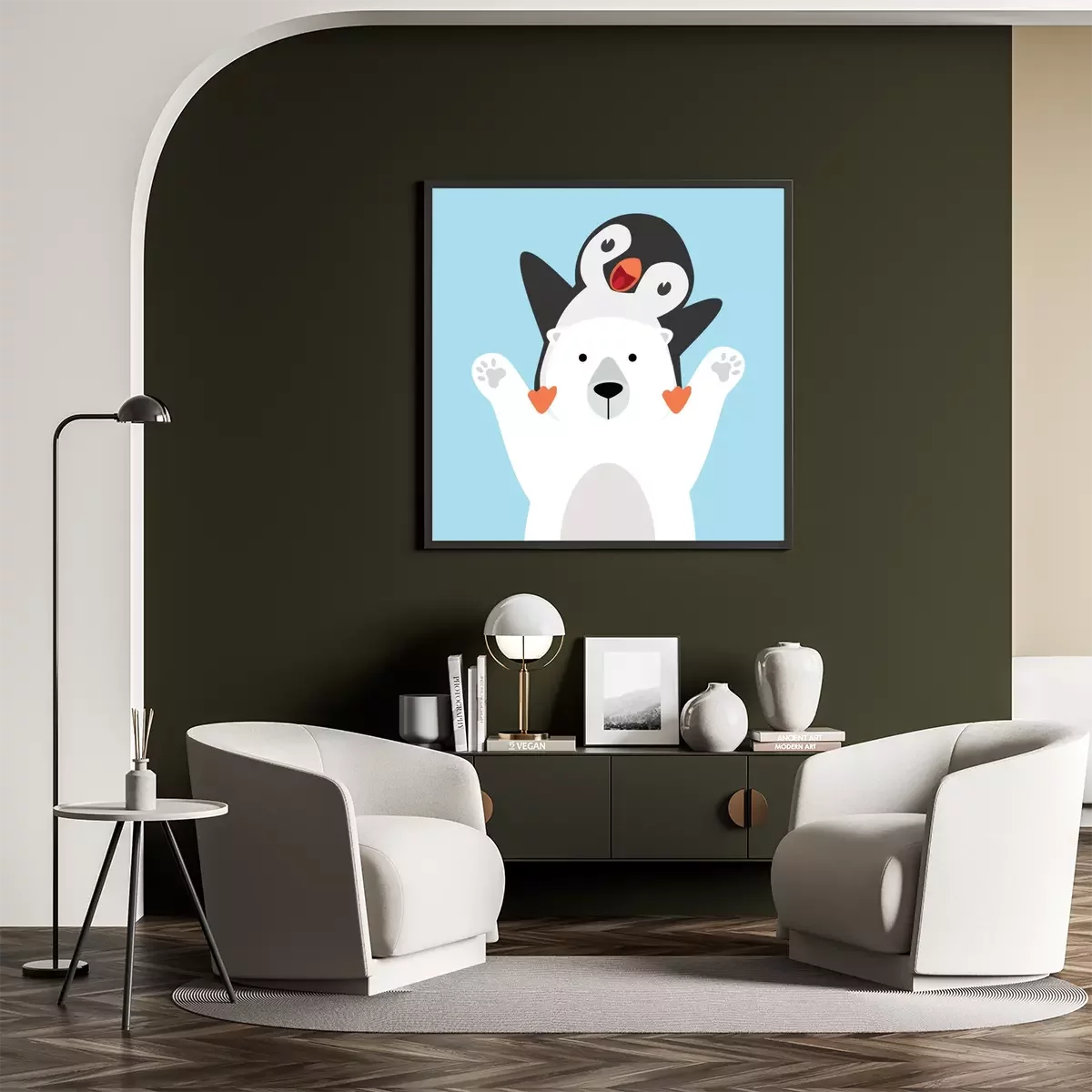 Poster : Un ours polaire portant un pingouin sur ses épaules