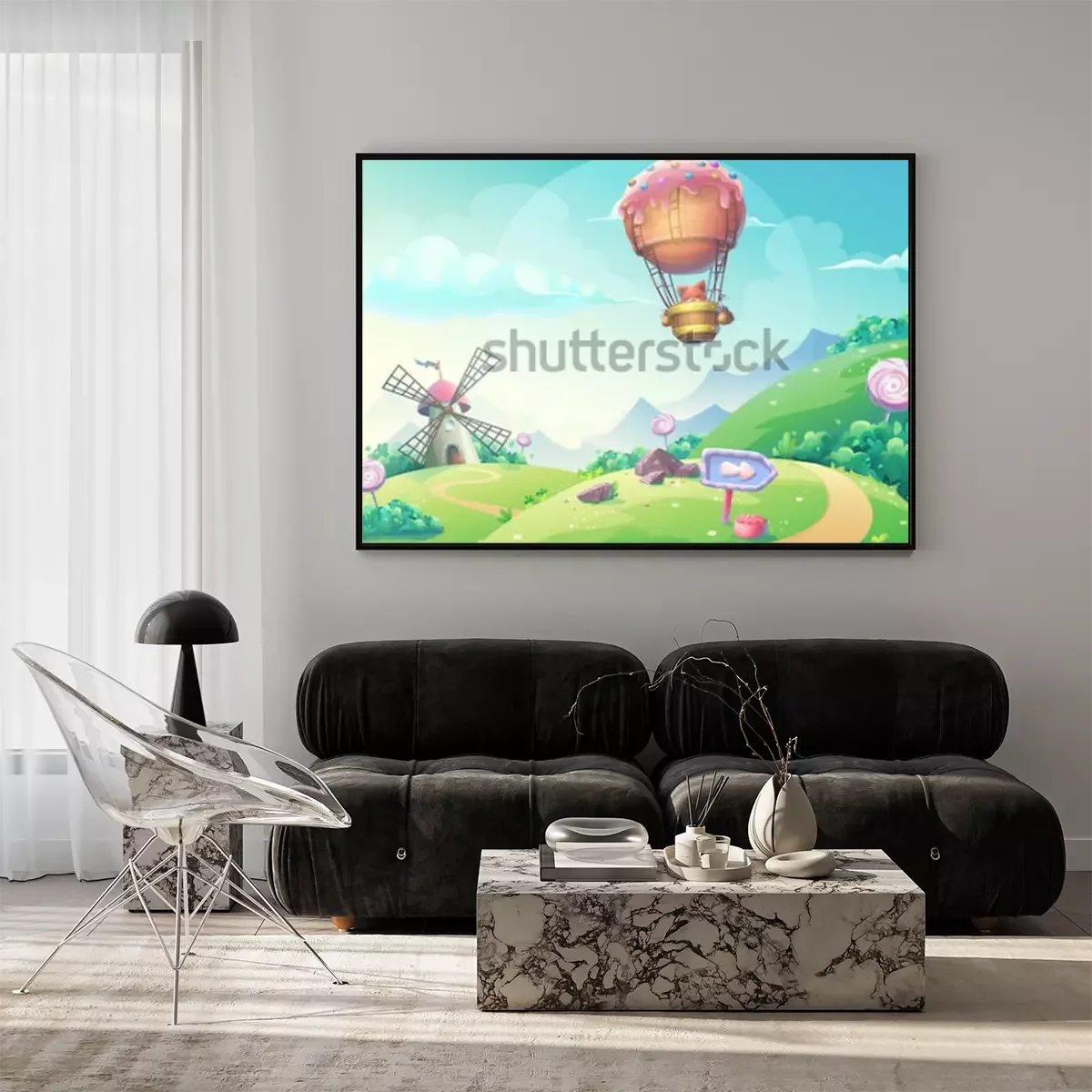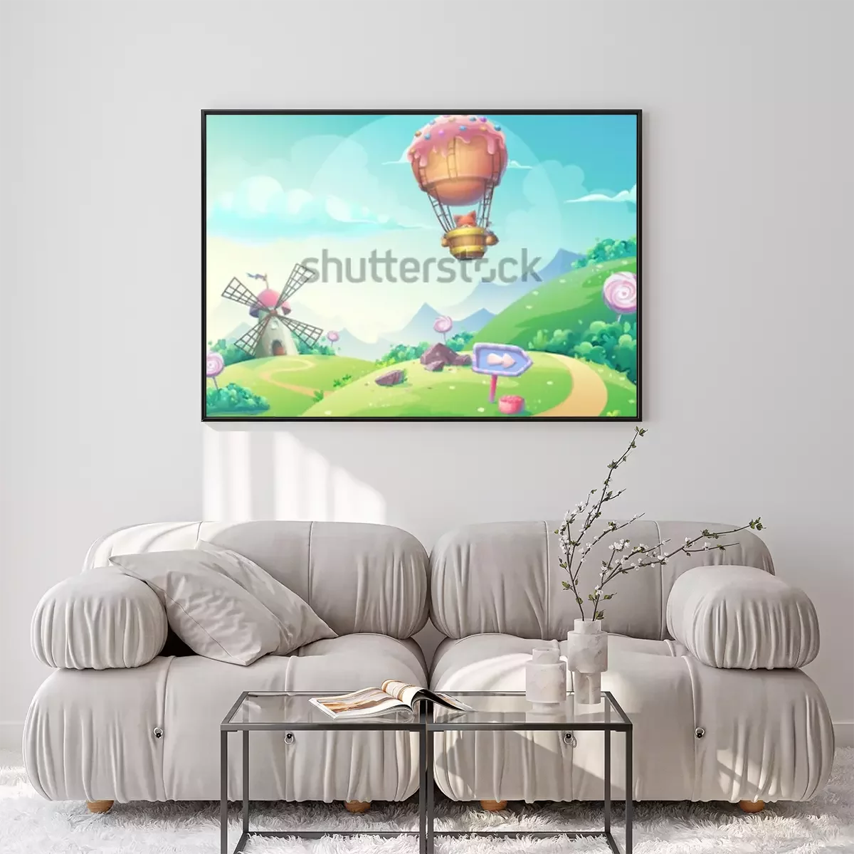 Poster : Un paysage de conte de fées et un ballon volant avec un renard à l'intérieur
