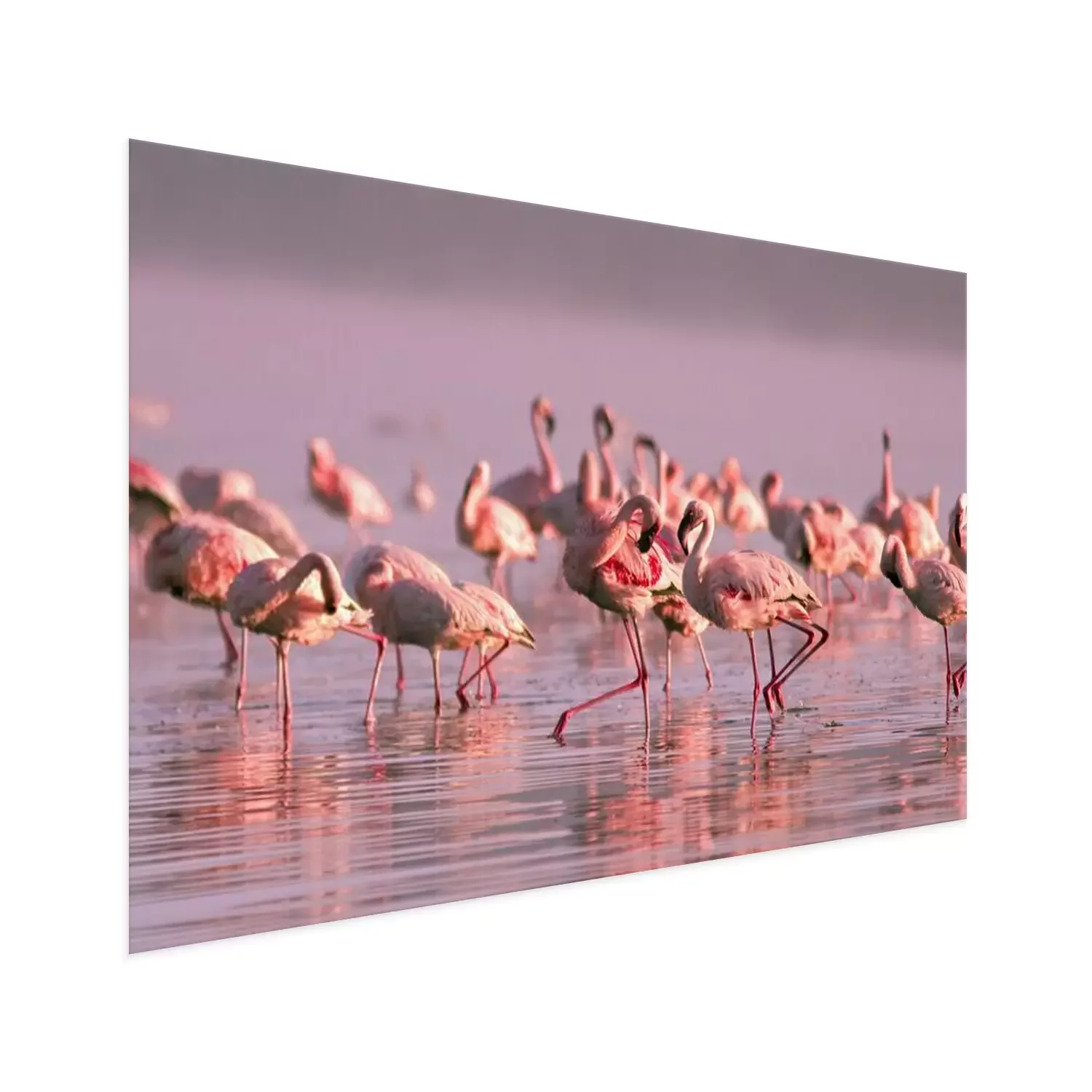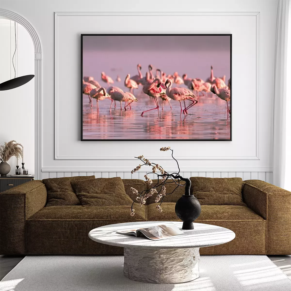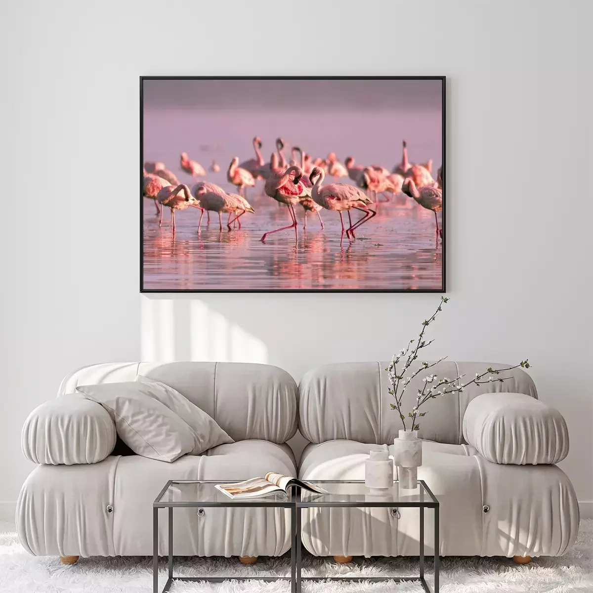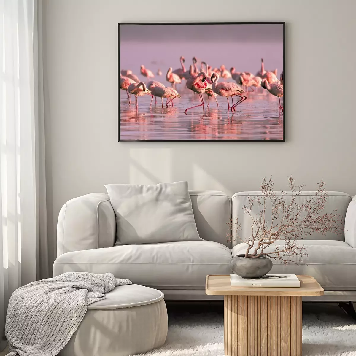 Poster  Un troupeau de flamants roses au coucher du soleil