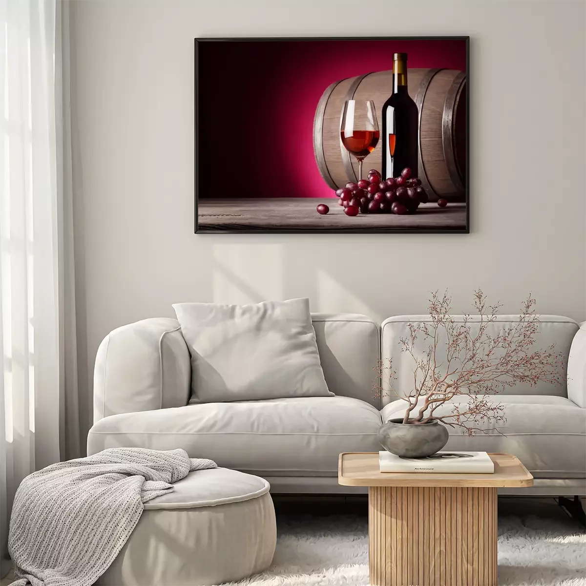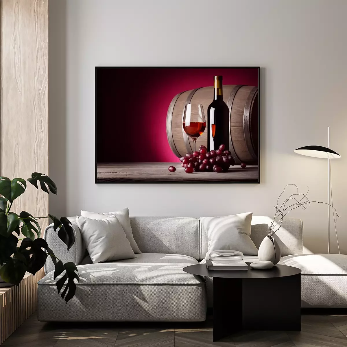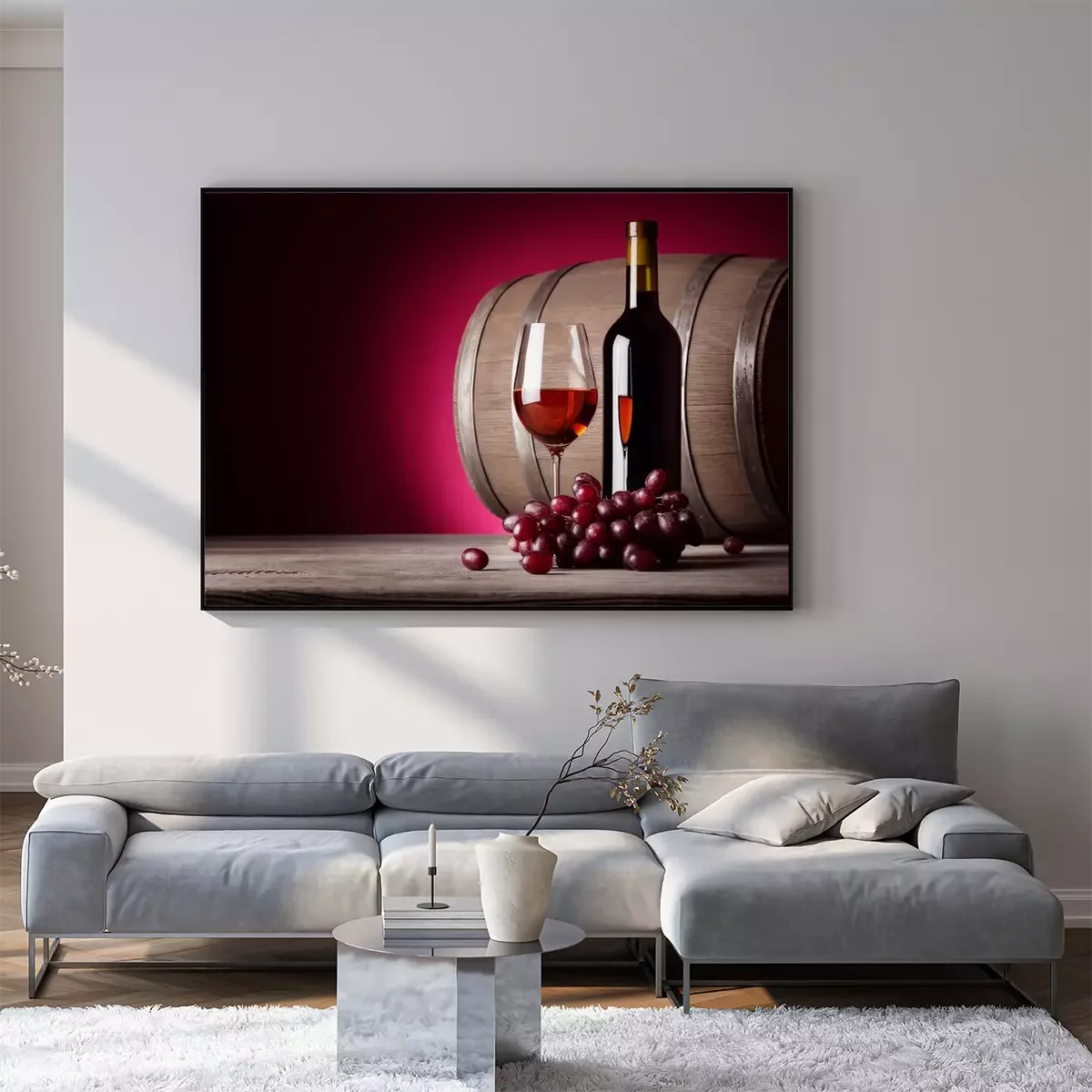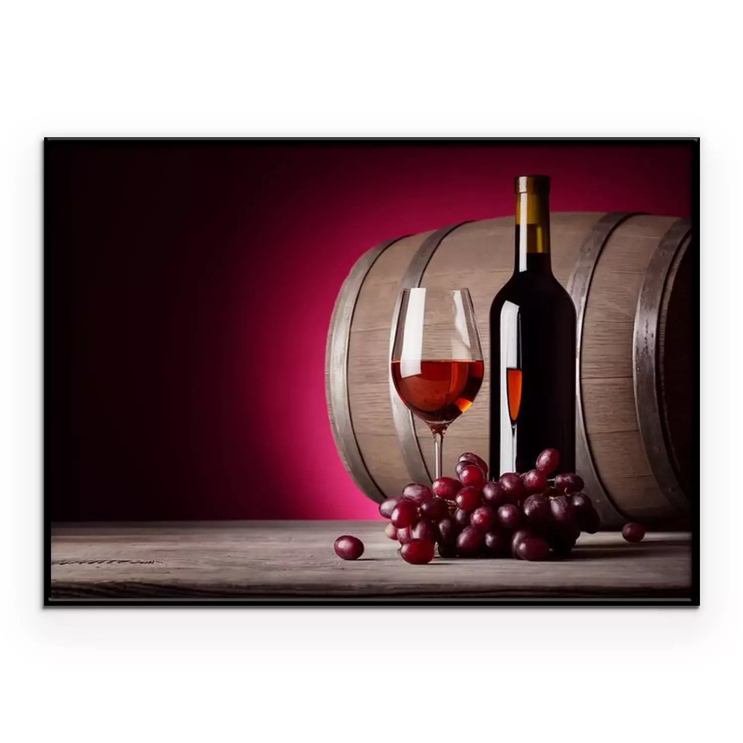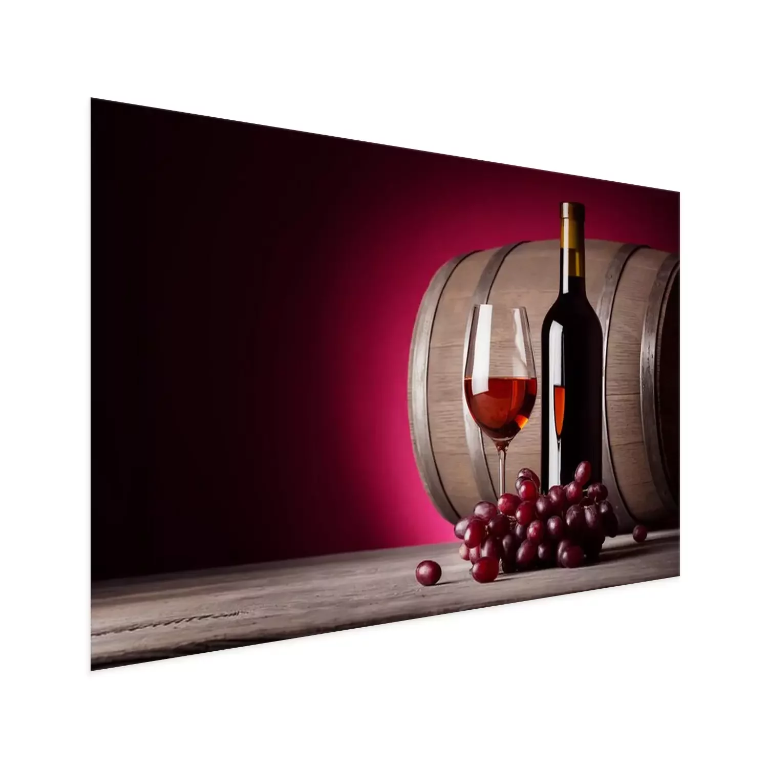 Poster : Un verre de vin rouge avec bouteille et raisins