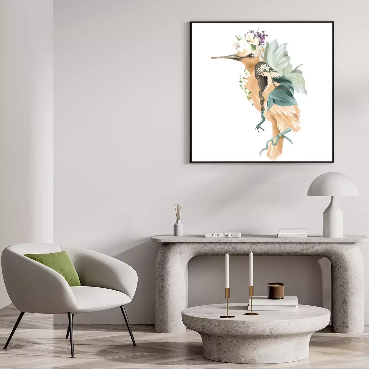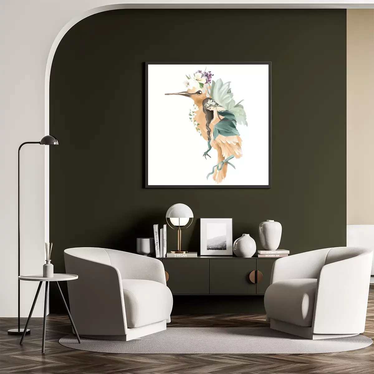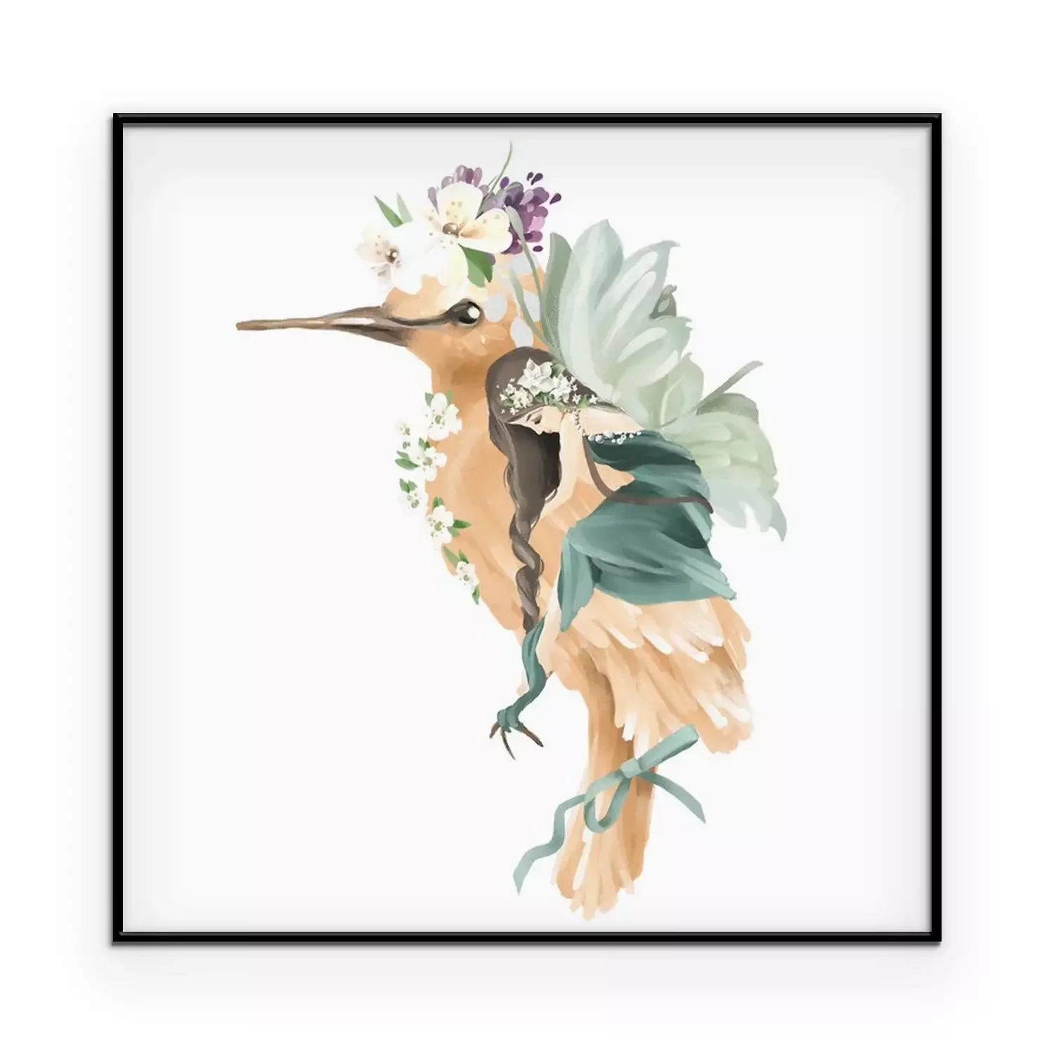 Poster : Une fée aux ailes vertes étreignant un oiseau