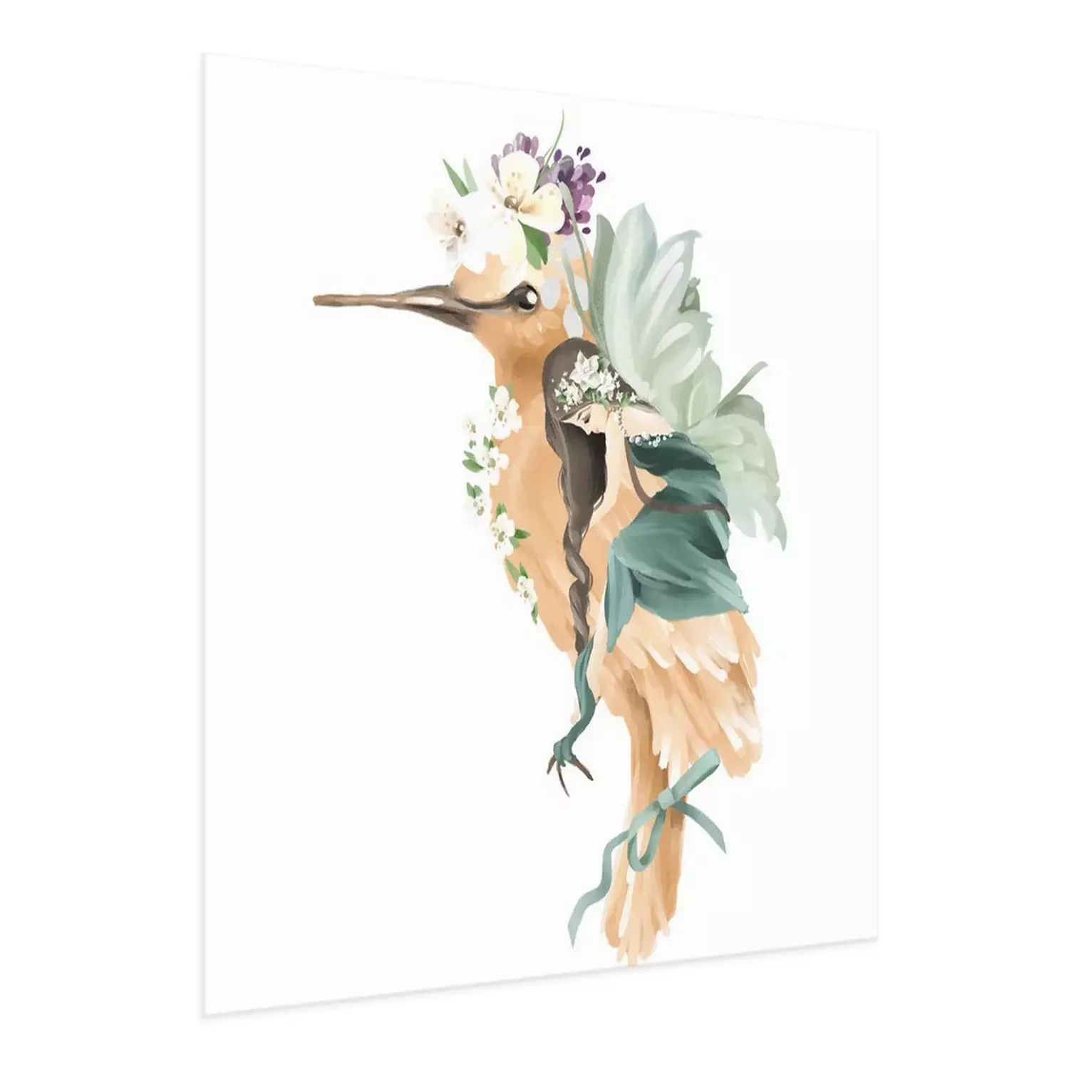 Poster  Une fée aux ailes vertes étreignant un oiseau