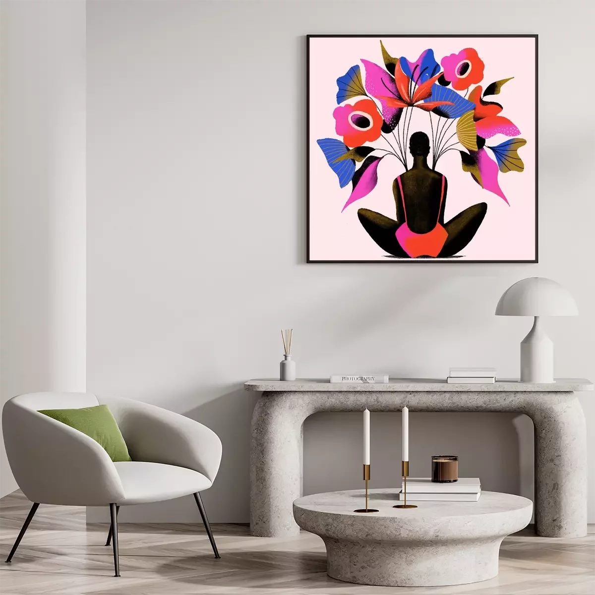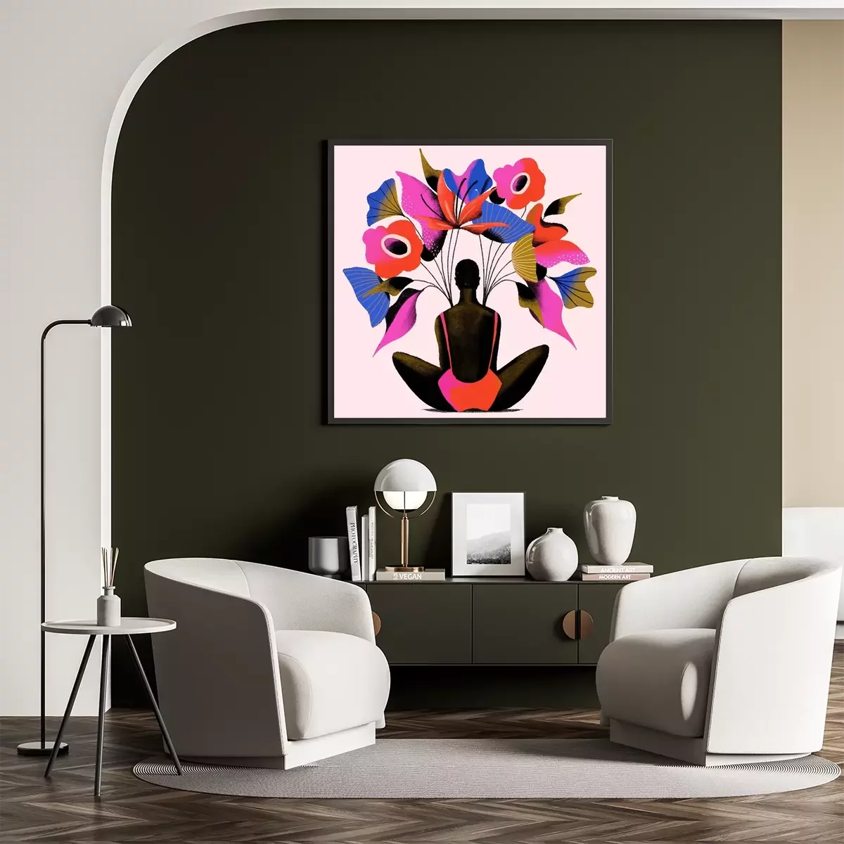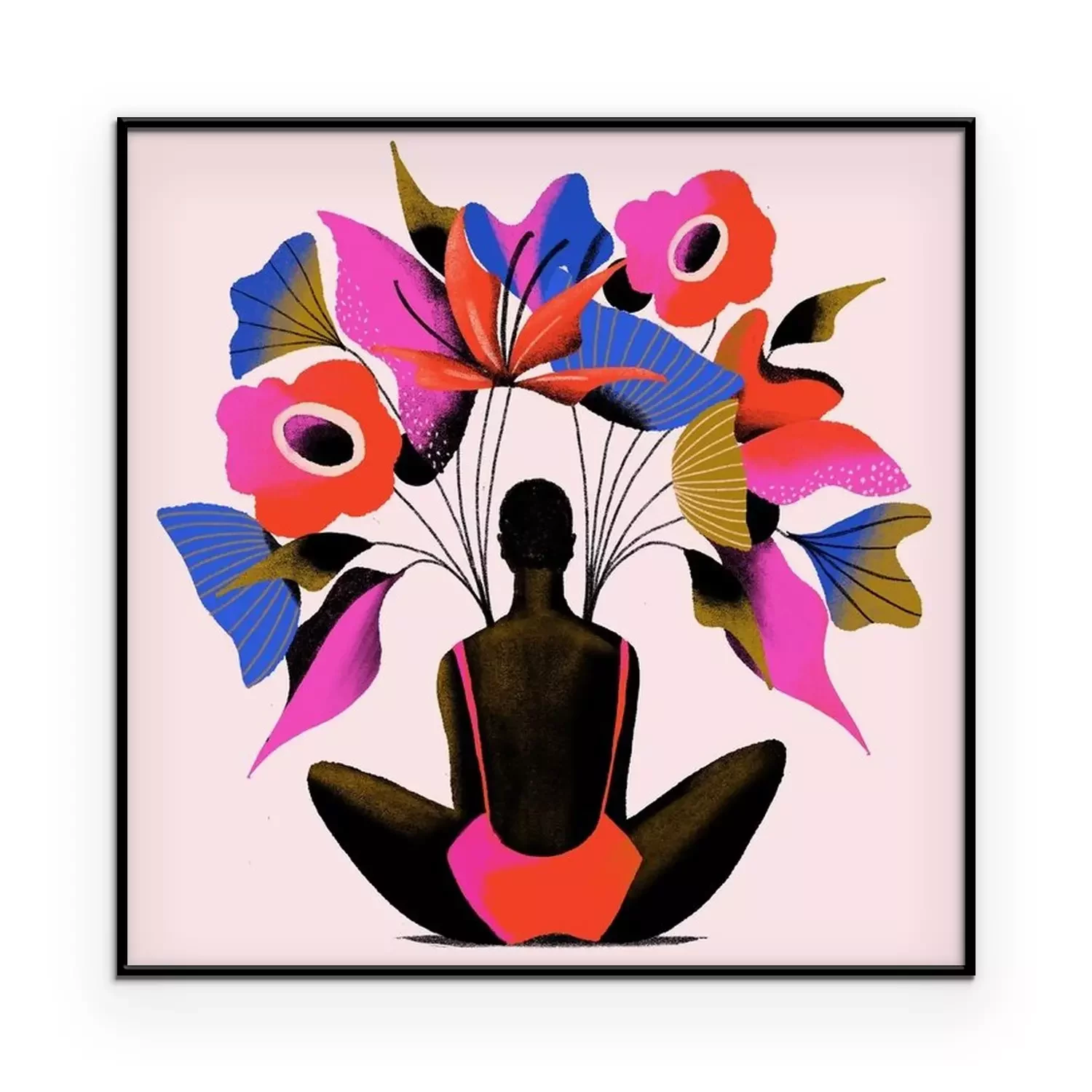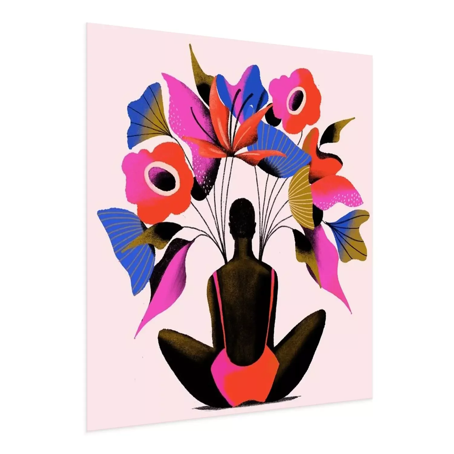 Poster : Une femme assise sous de grandes fleurs