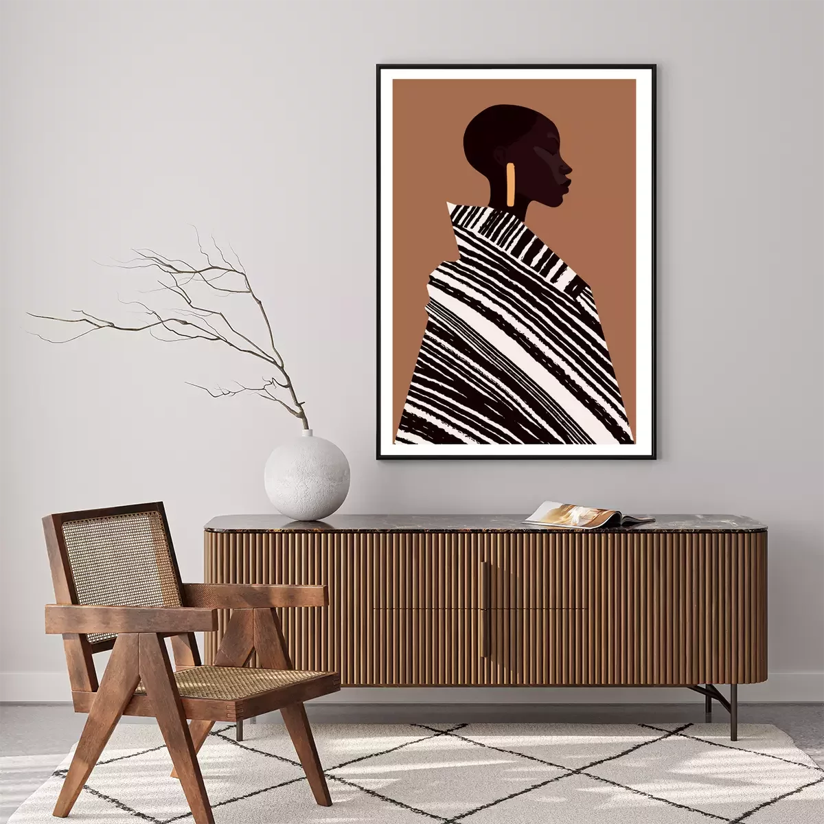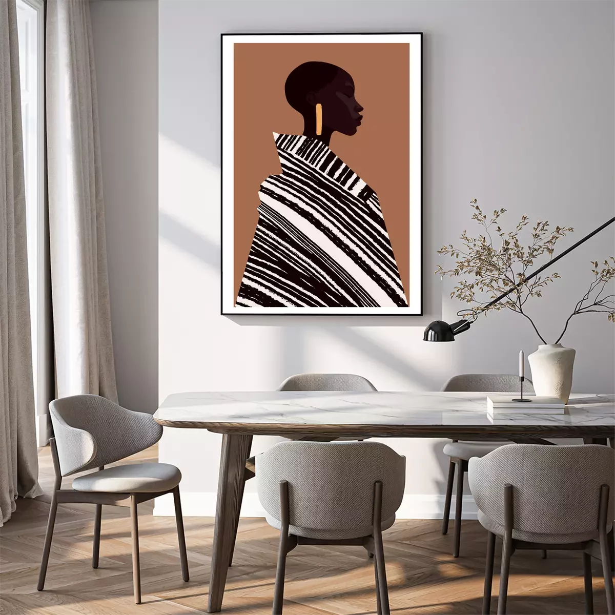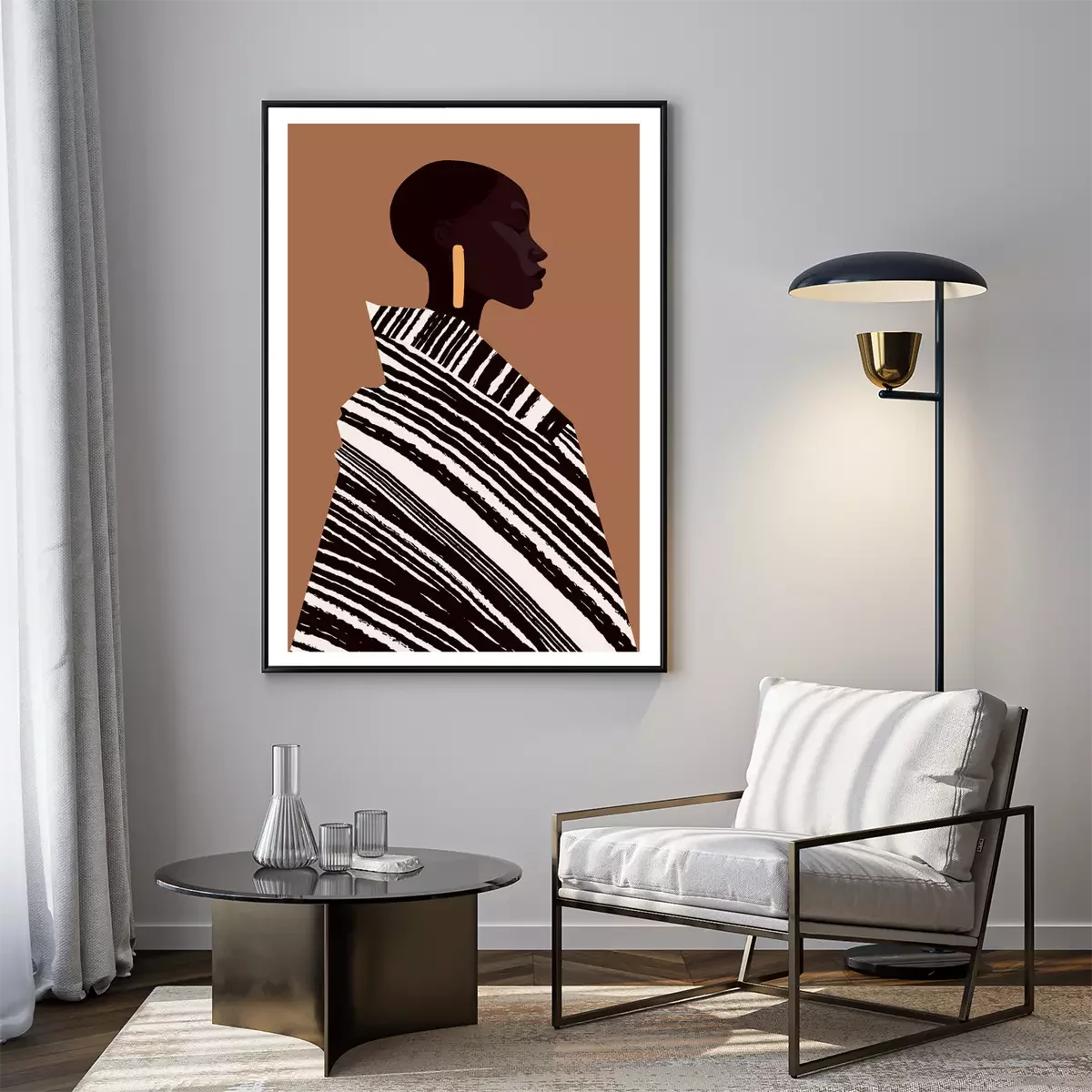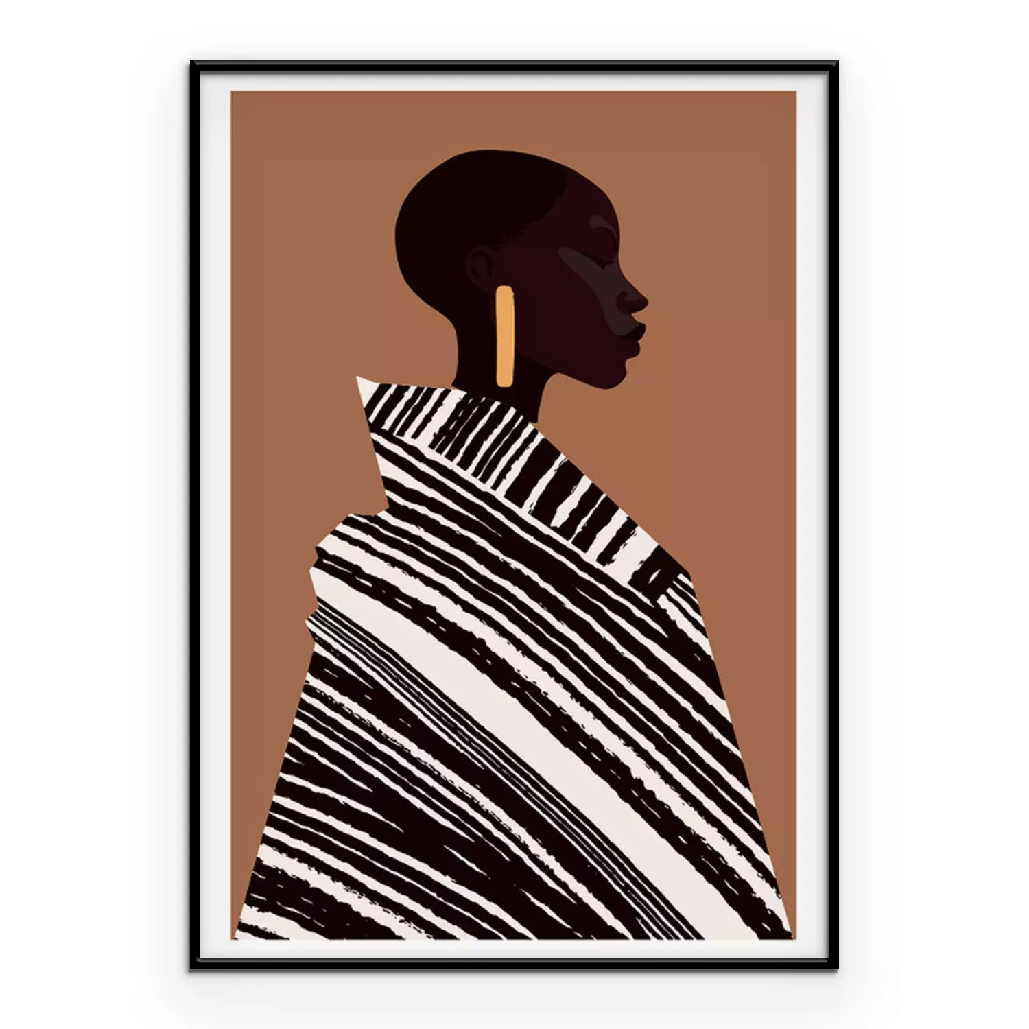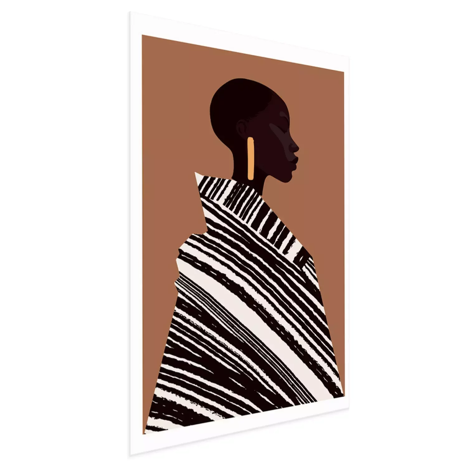 Une femme élégante portant un manteau rayé sur un fond chaud
