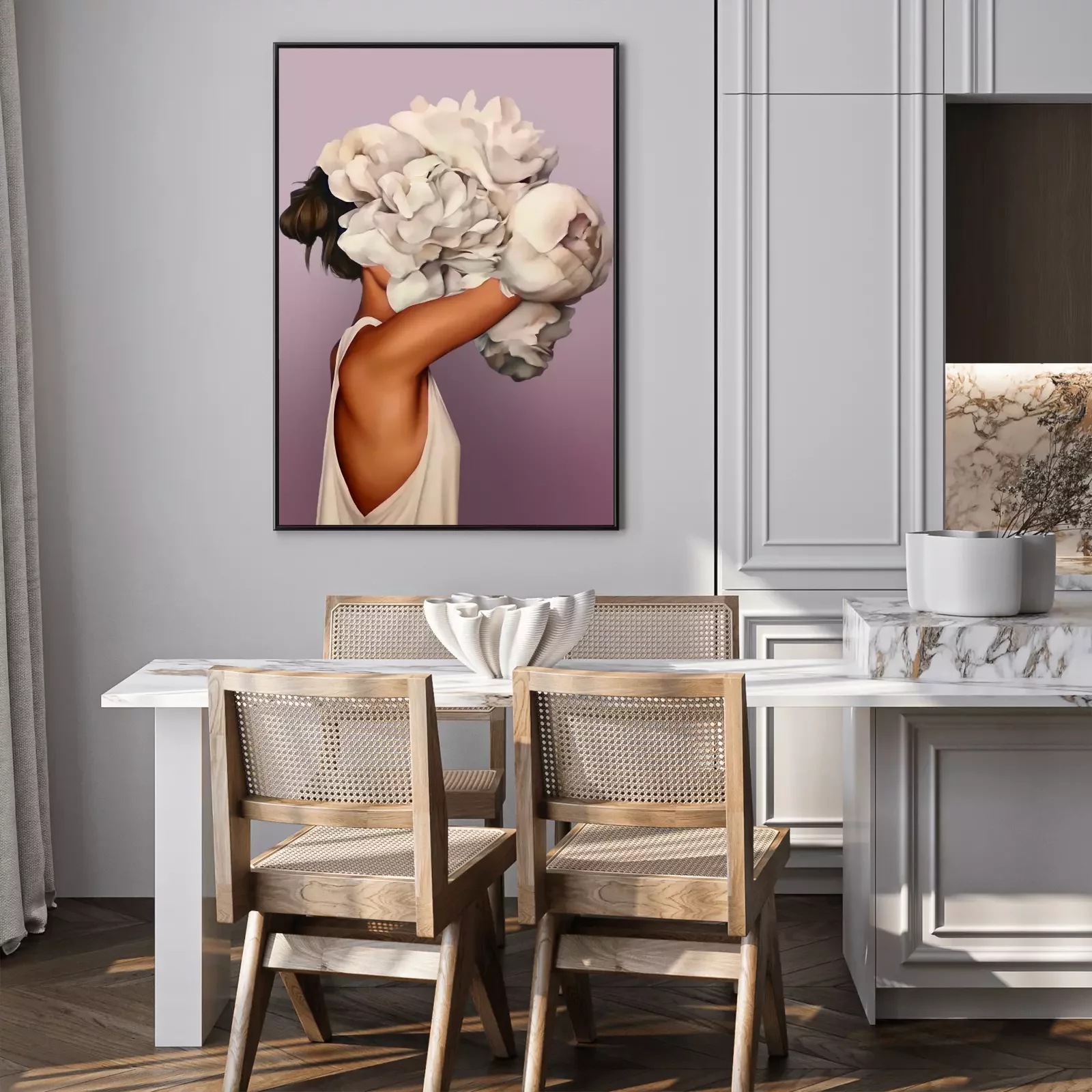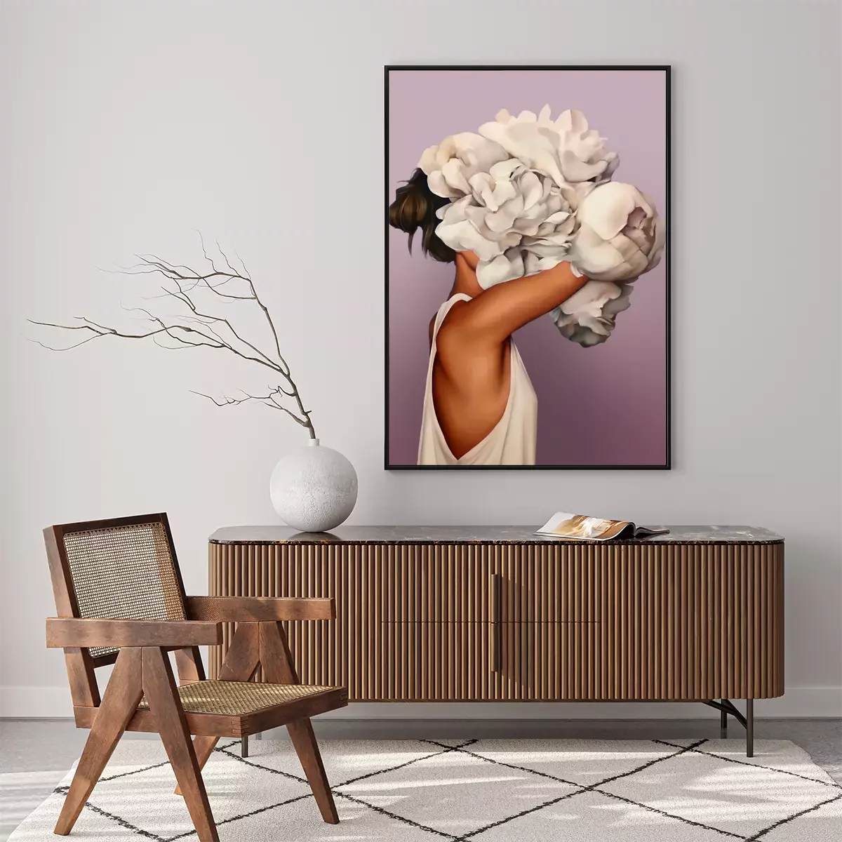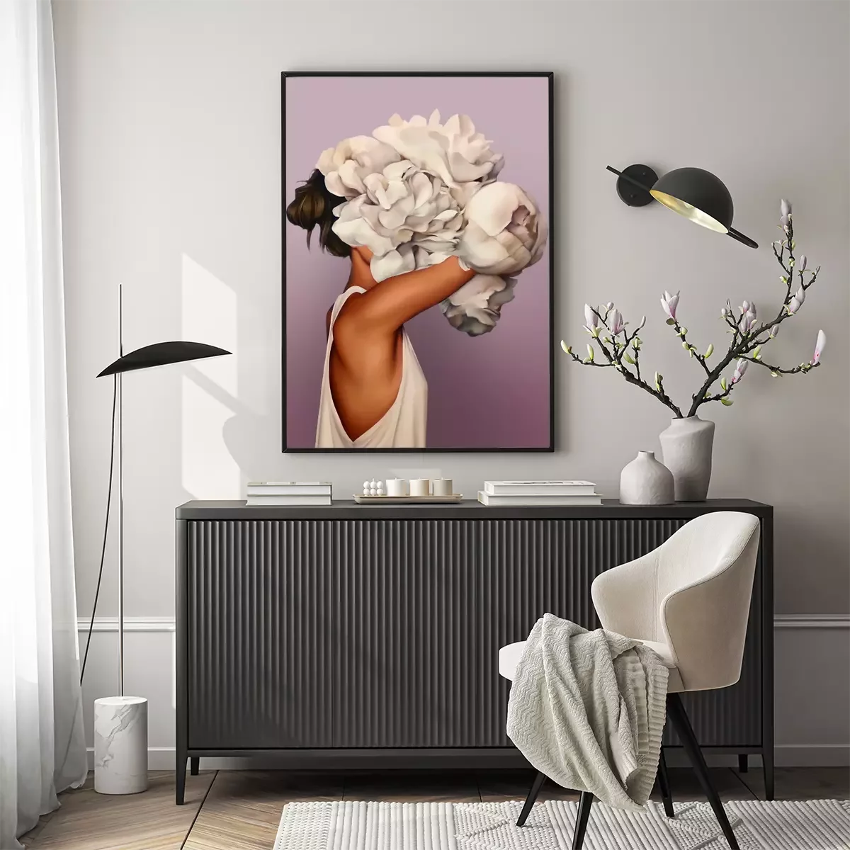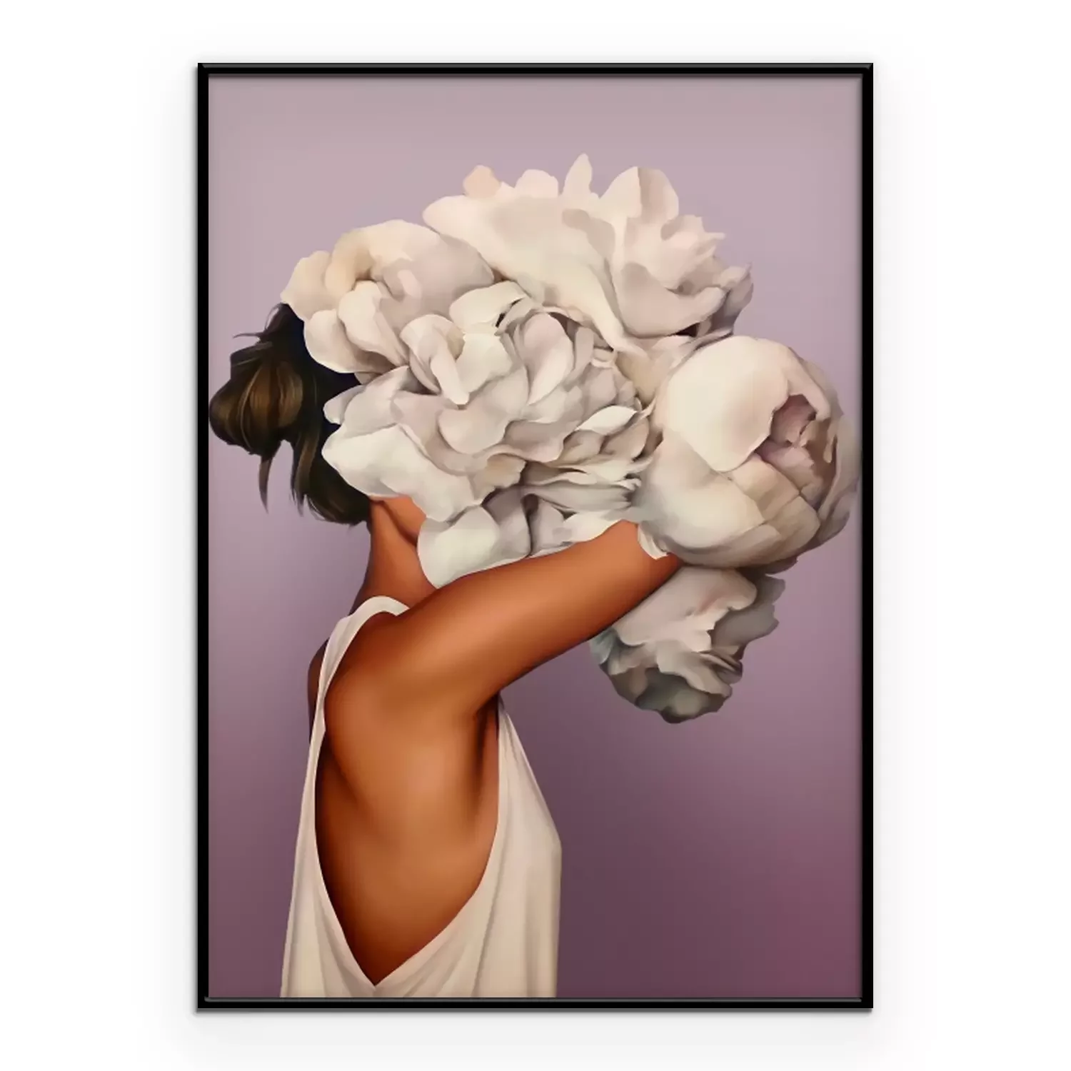 Femme abstraite avec un bouquet de fleurs sur la tête
