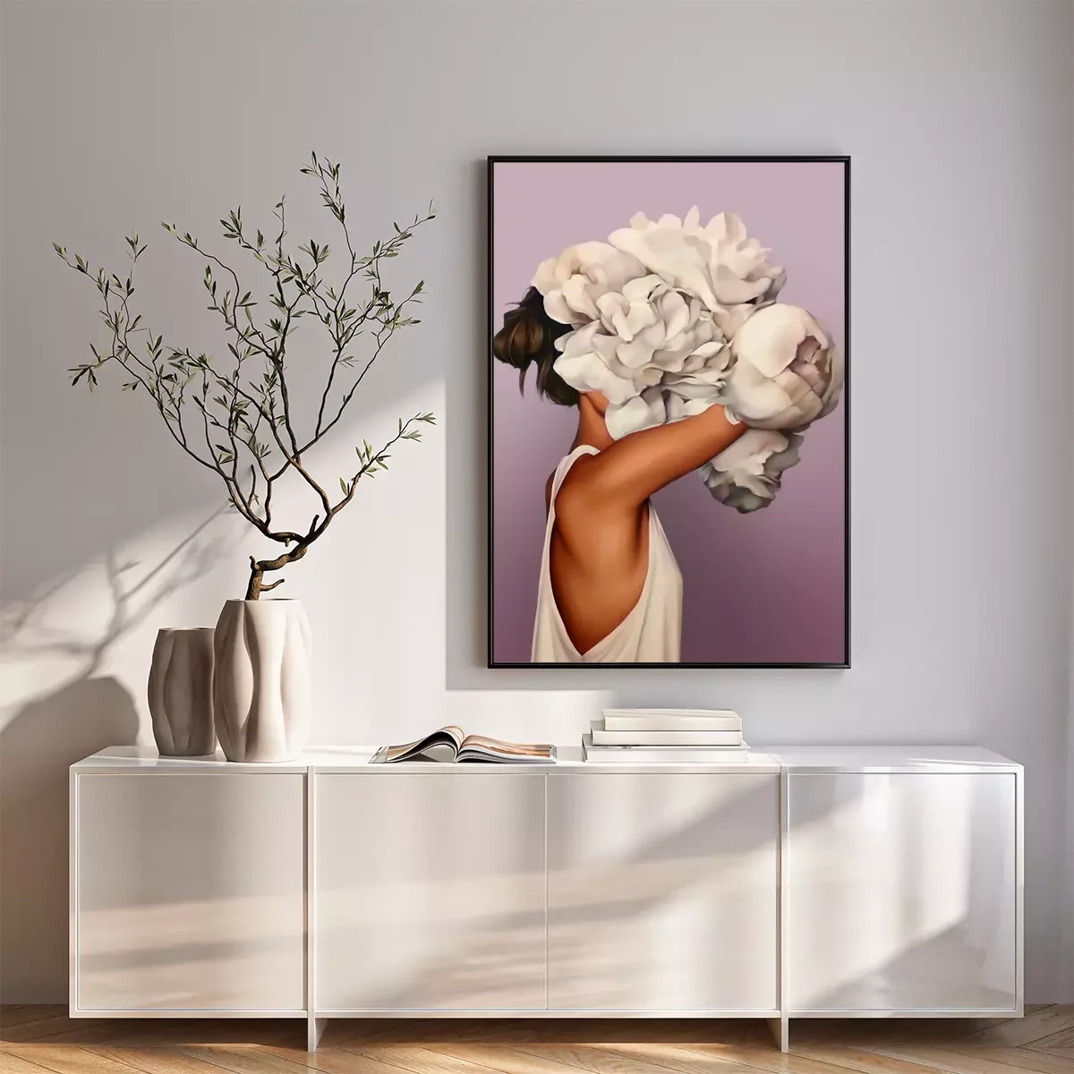 Poster  Une femme immergée dans des fleurs blanches