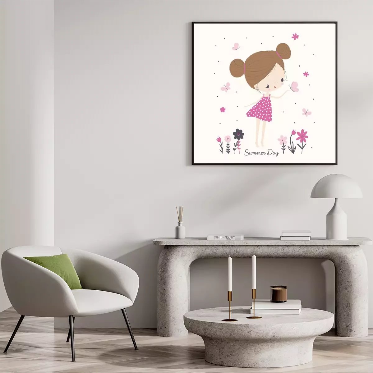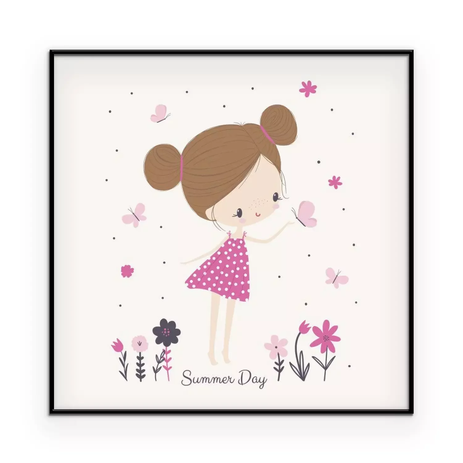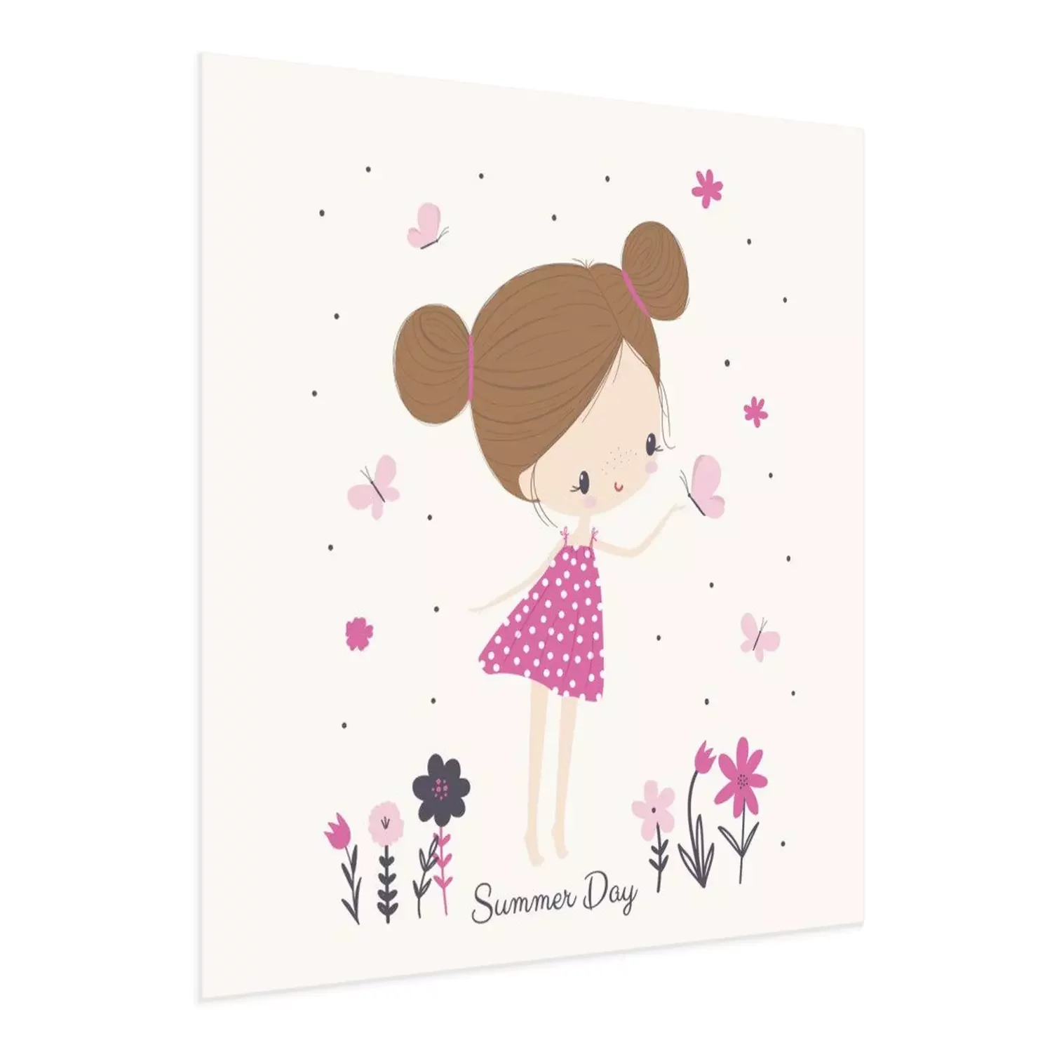 Poster  Une fille dans une robe à pois pour atteindre un papillon